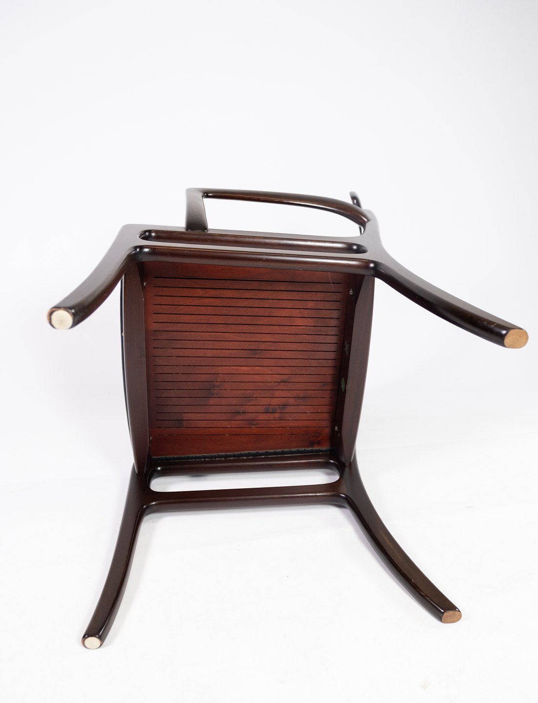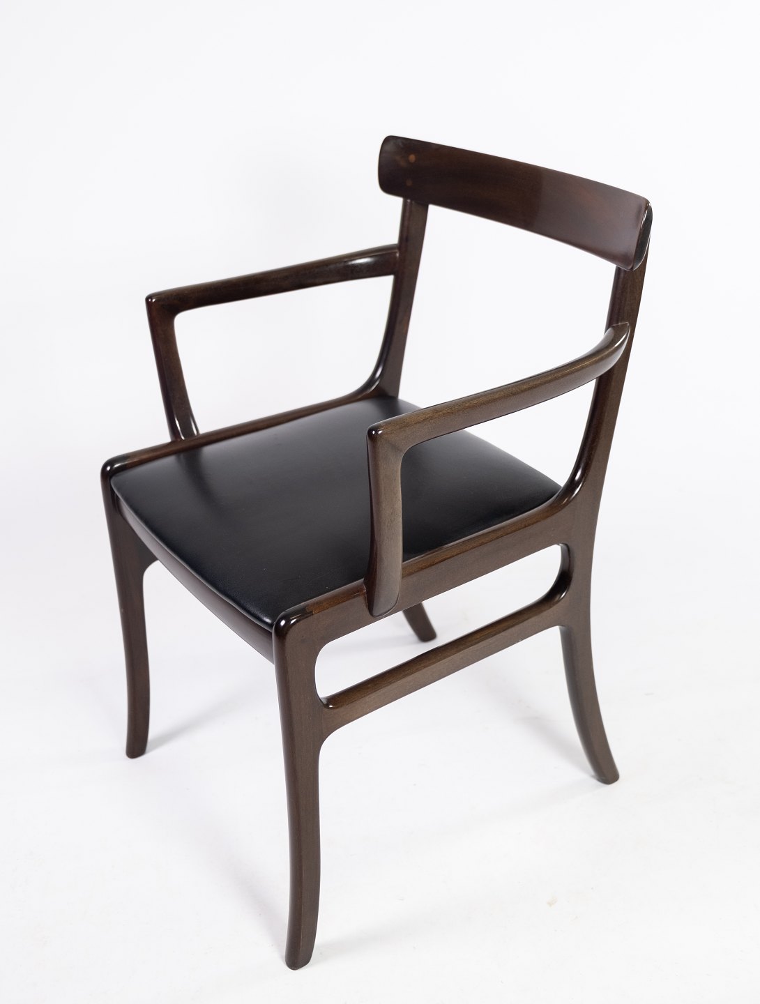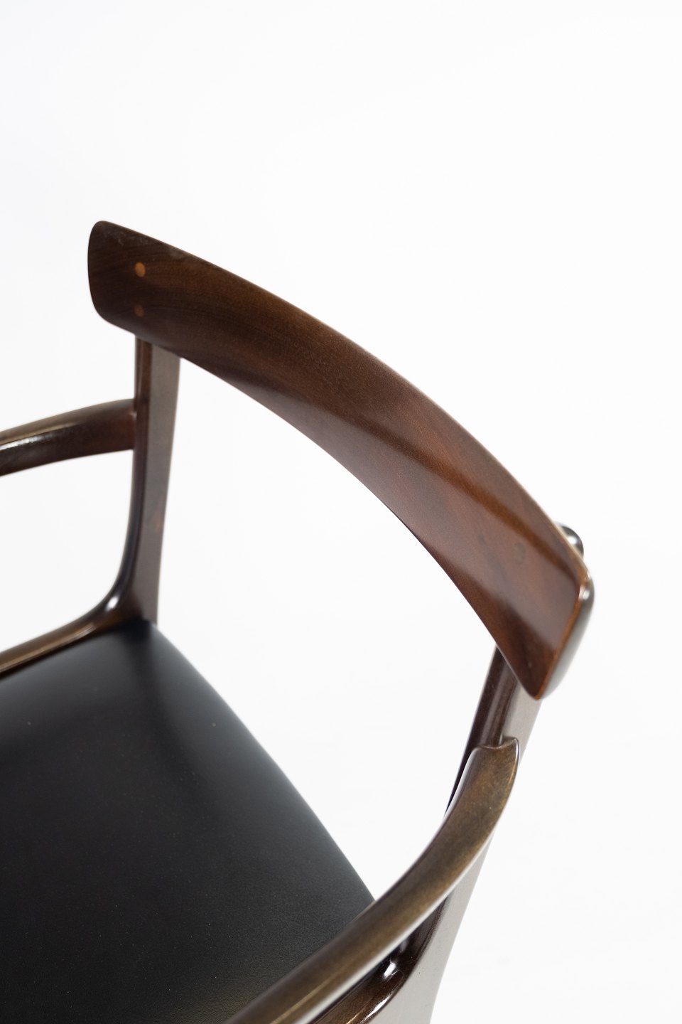 Et par Rungstedlund armstole, fremstillet af mahogni og beklædt med sort læder, er et strålende eksempel på Ole Wanschers tidløse design, der kombinerer æstetik og funktionalitet på en sublim måde.