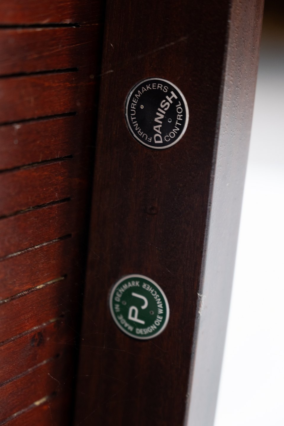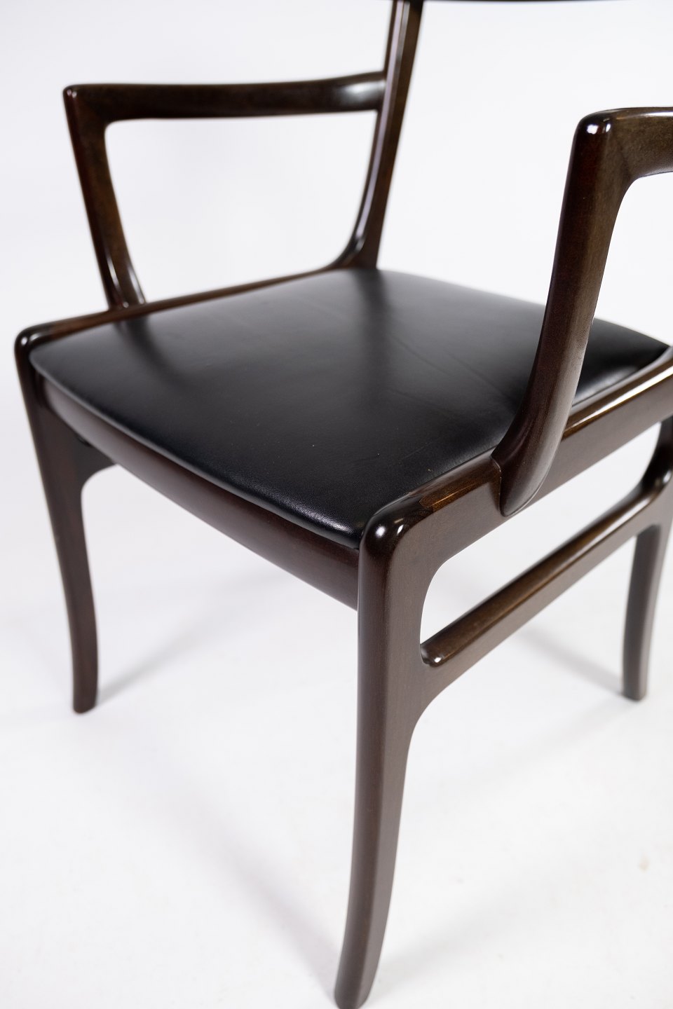 Fremstillet af P. Jeppesen, et anerkendt navn inden for møbelproduktion, er disse armstole omhyggeligt håndlavet med fokus på kvalitet og detaljer. Med deres smukke mahogni og det luksuriøse sorte læder vil disse stole være et stilfuldt og funktionelt tilføjelse til enhver stue, spisestue eller kontor.
