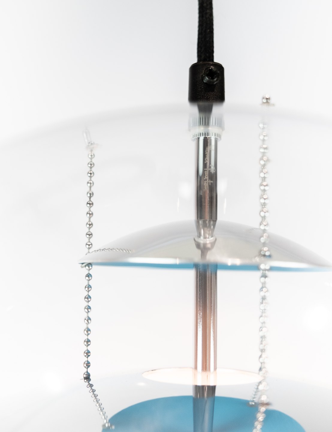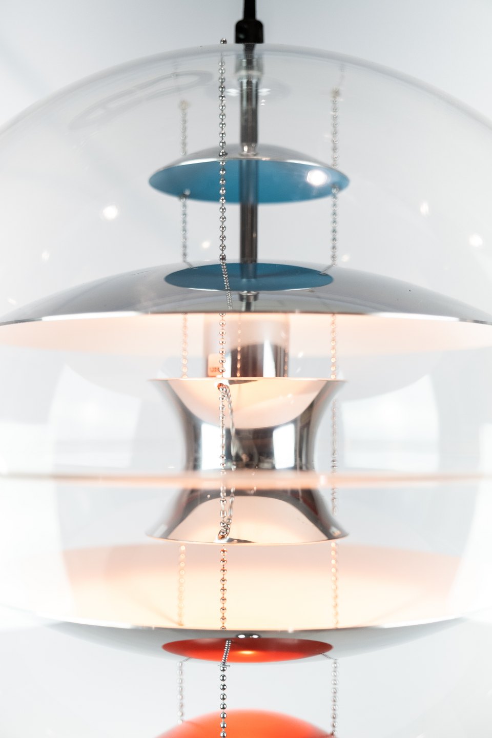 Globe, 40, designed by Verner Panton in 1969. The lamp is a transparent acrylic globe with 5 hanging metal reflectors, which is lacquered in White, blue and red.