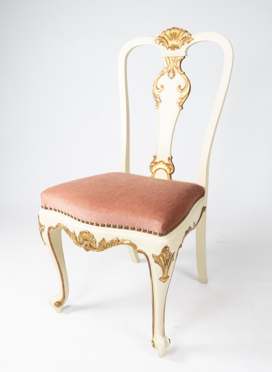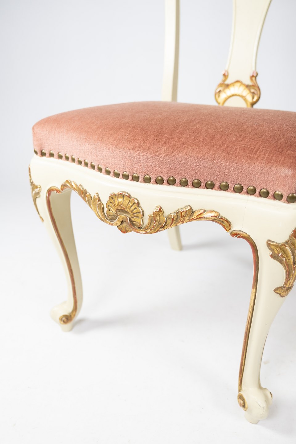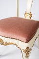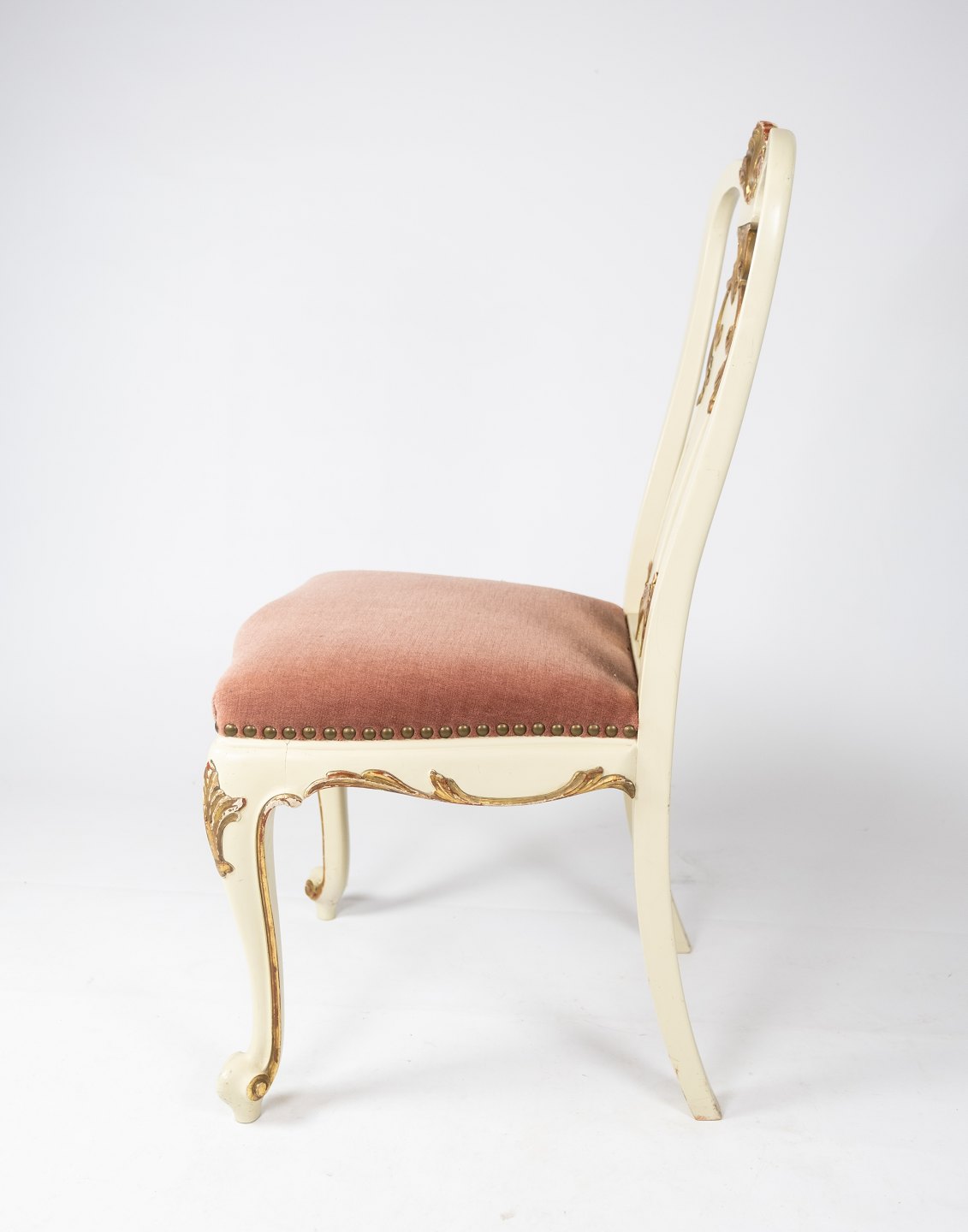Set of 12 Rococo dining room chairs of white painted wood decorated with leaf gold and upholstered with light pink velvet from the 1890s. The chairs are in great vintage condition.