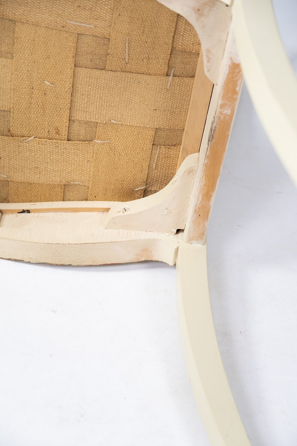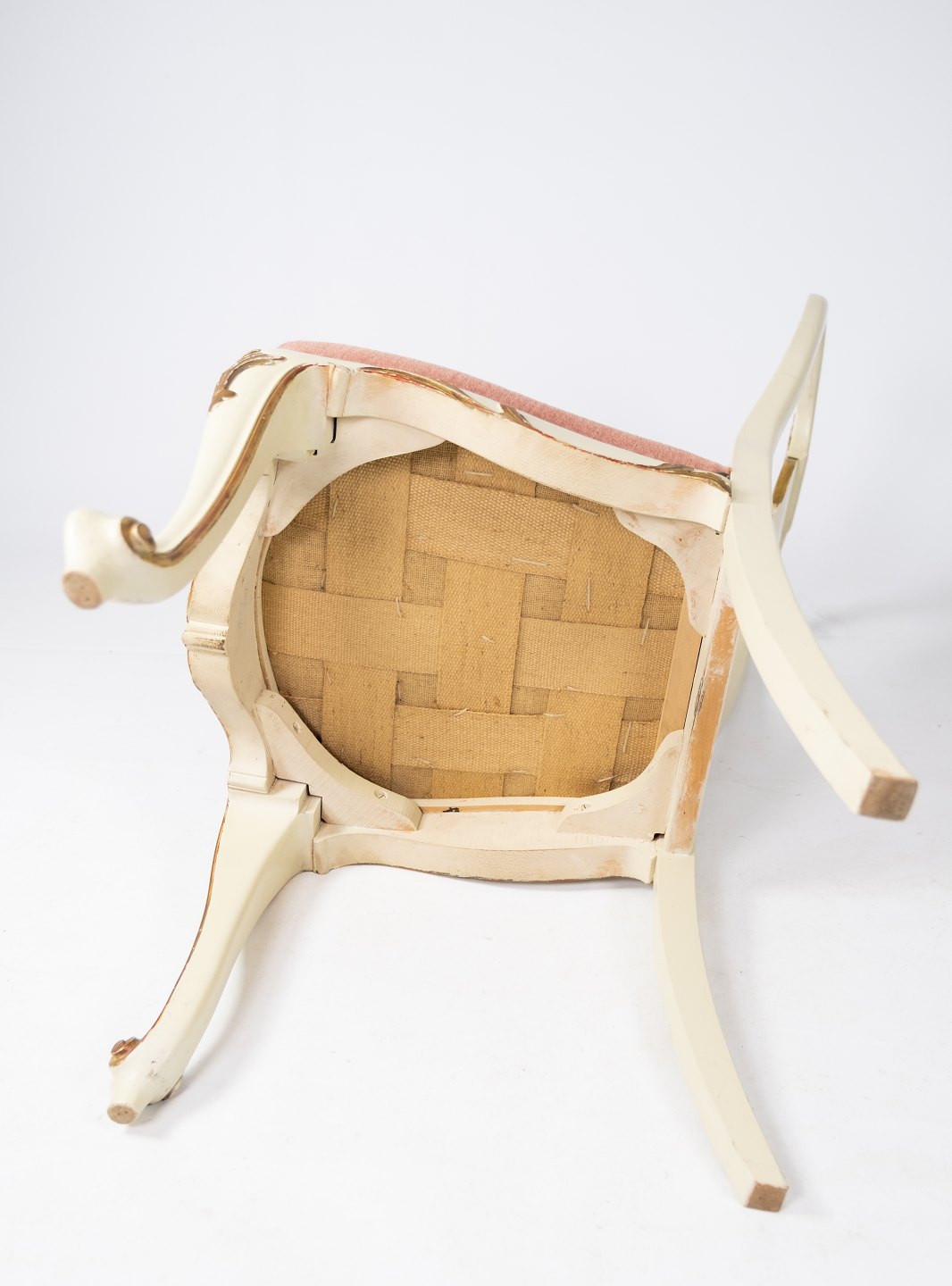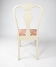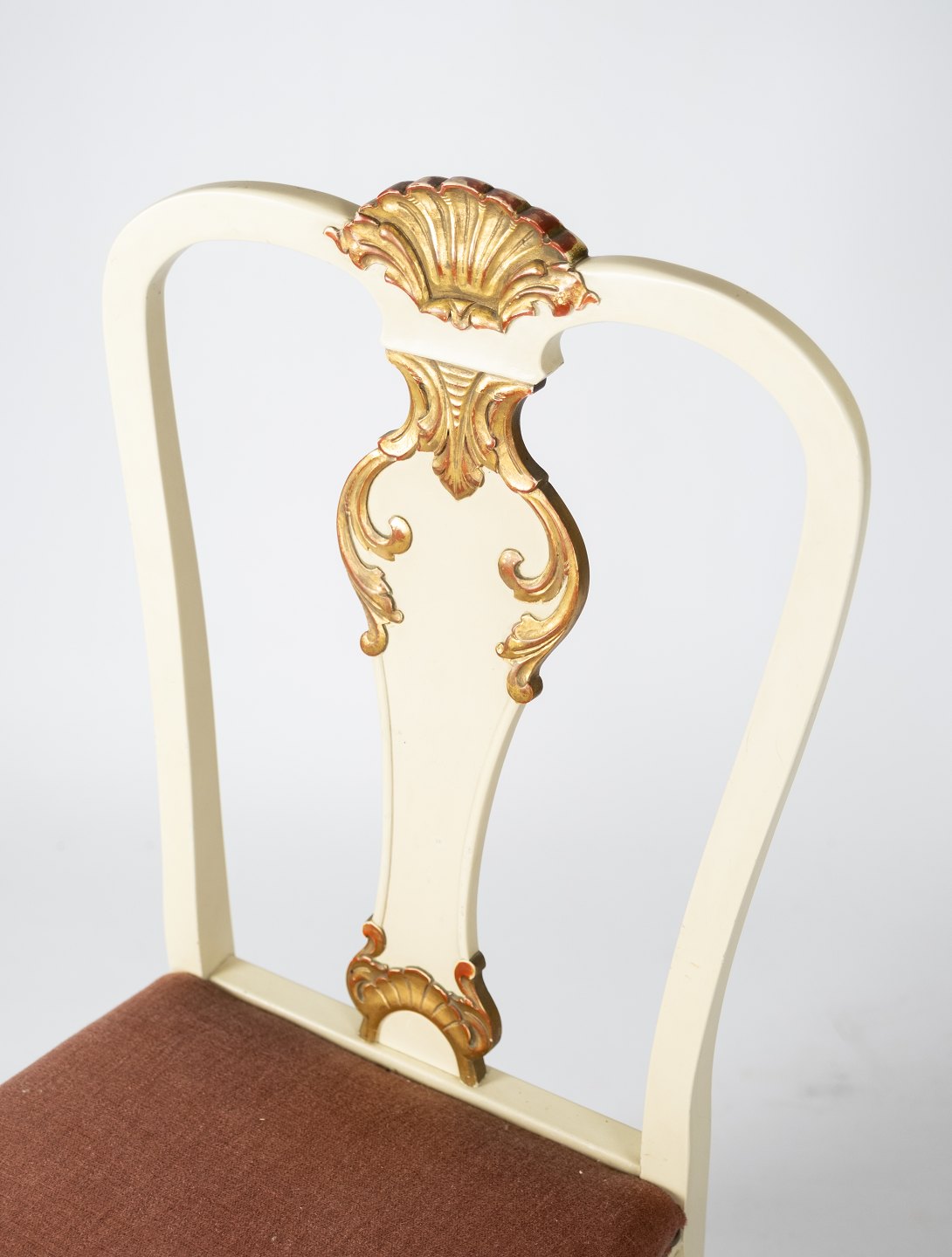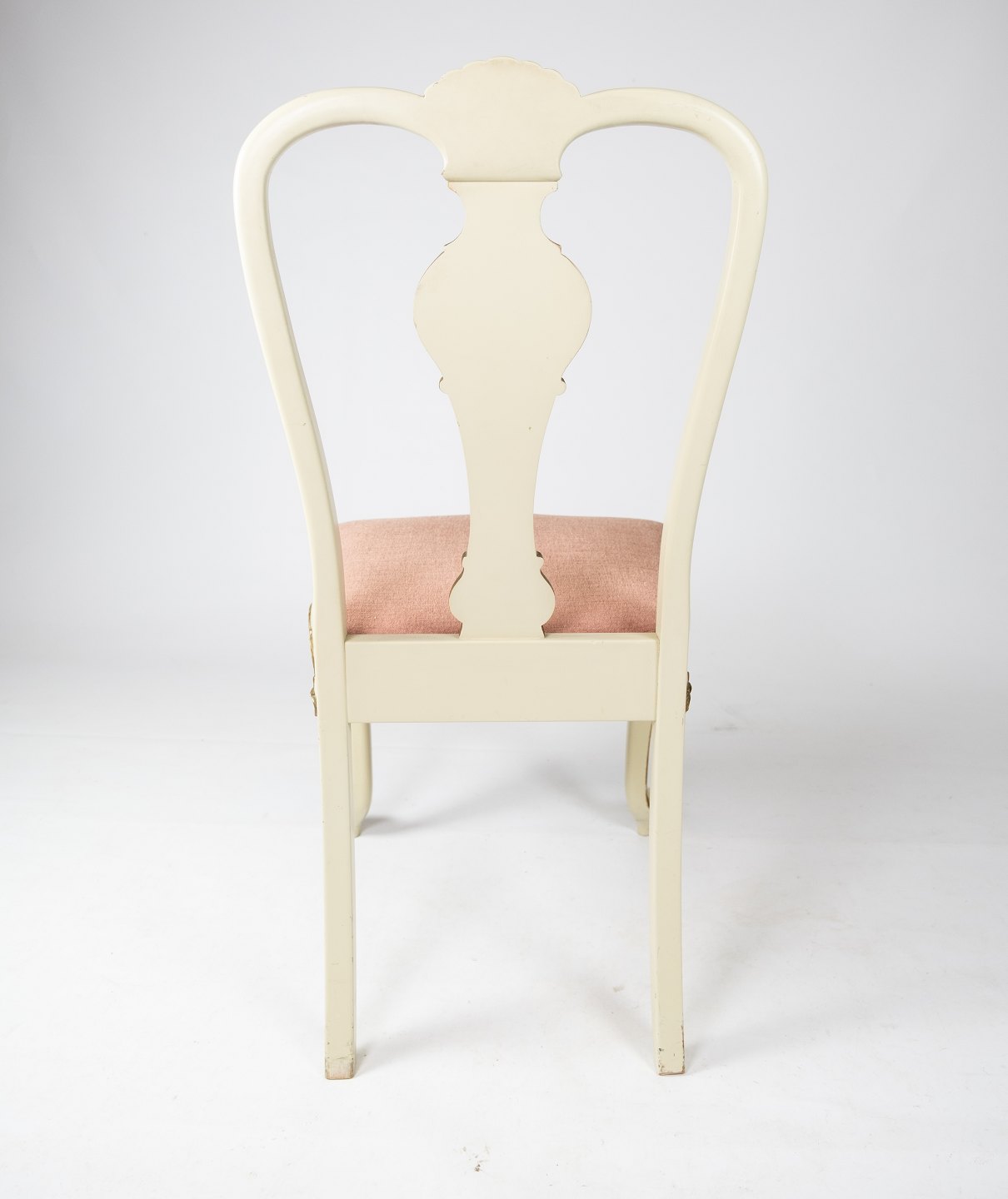 Set of 12 Rococo dining room chairs of white painted wood decorated with leaf gold and upholstered with light pink velvet from the 1890s. The chairs are in great vintage condition.