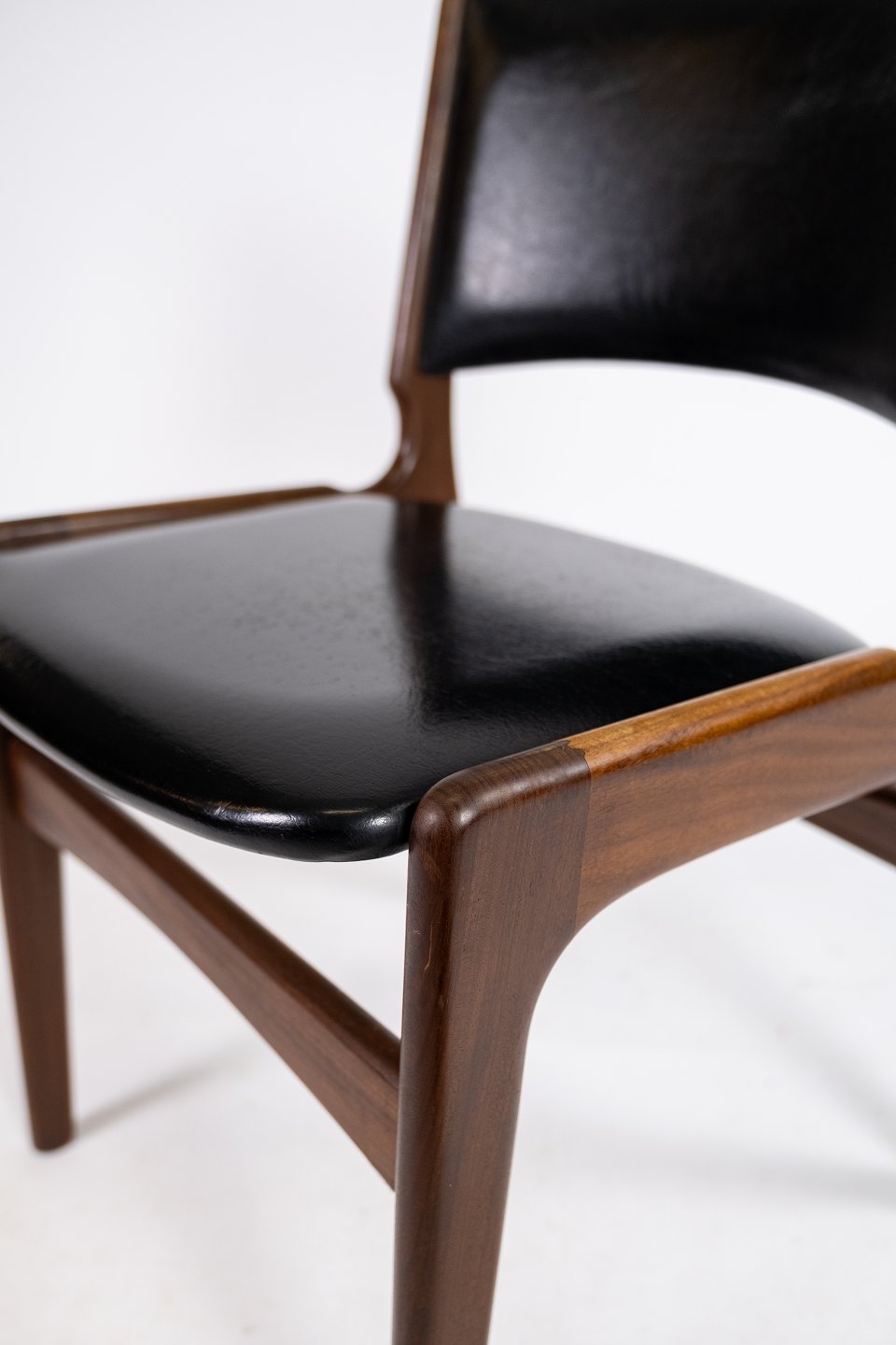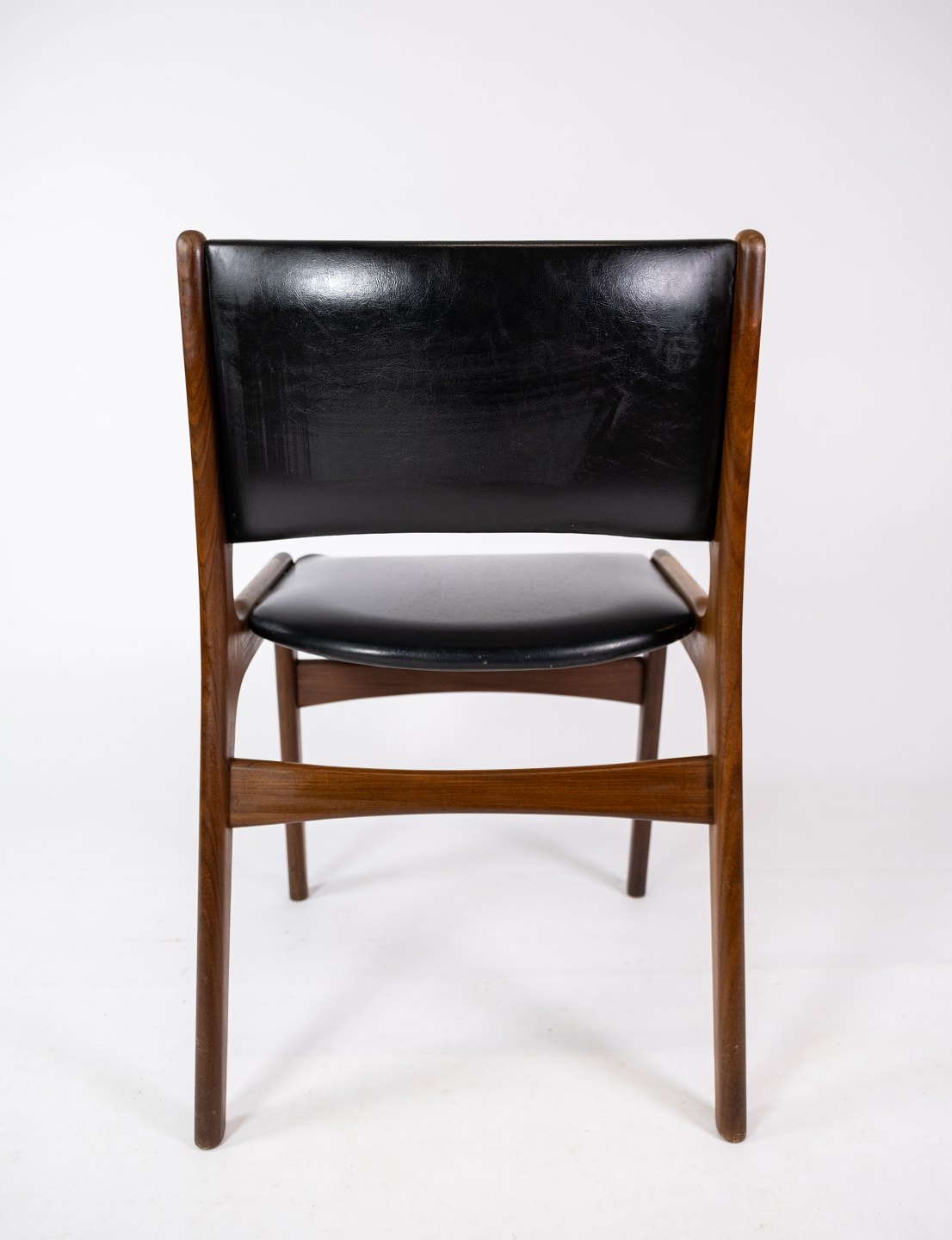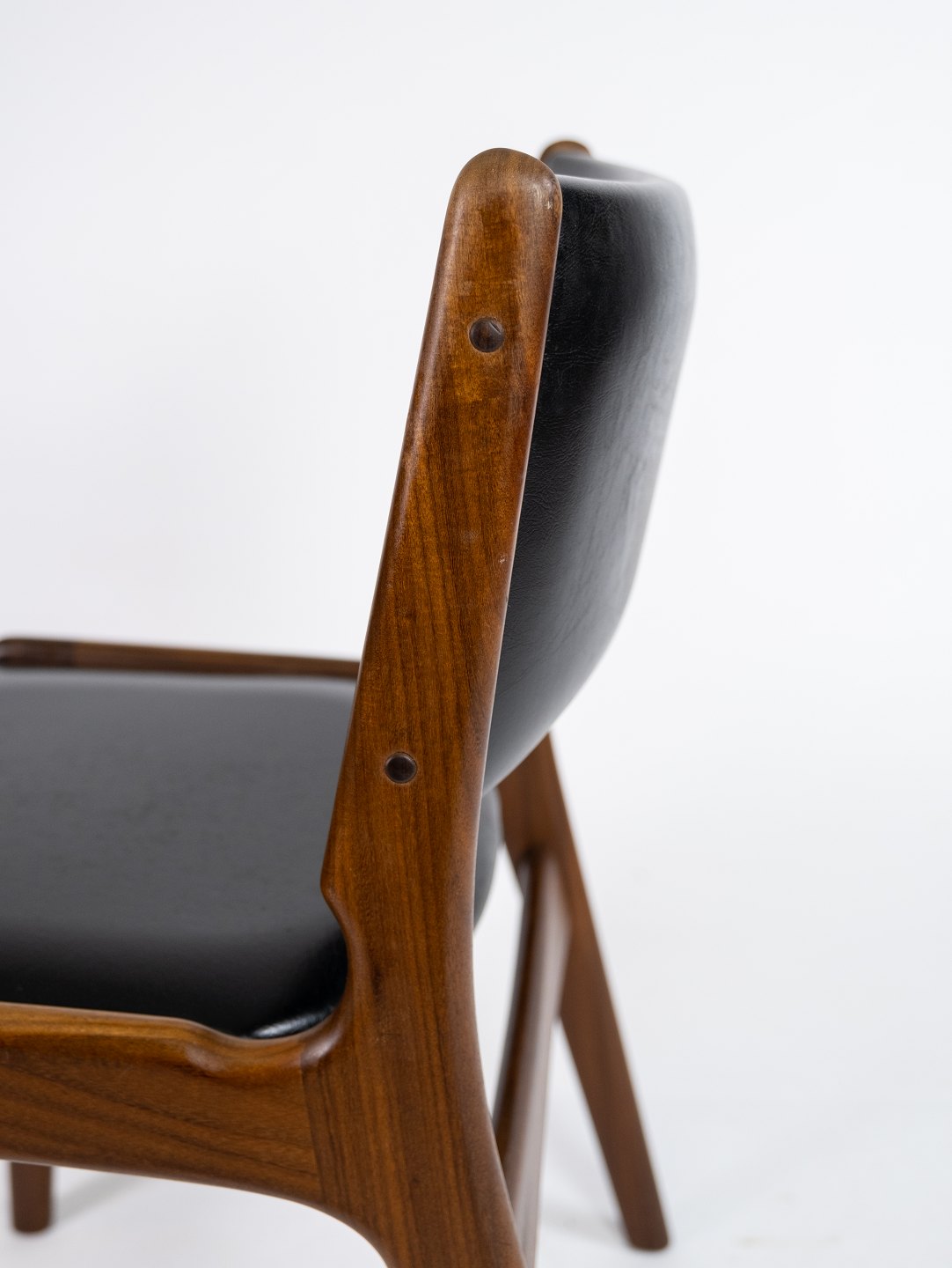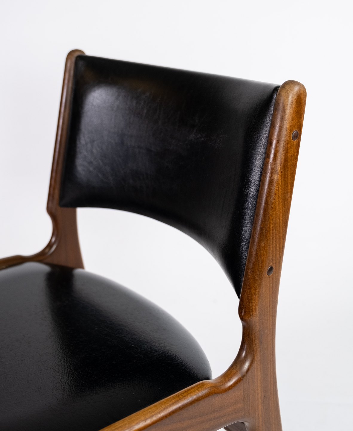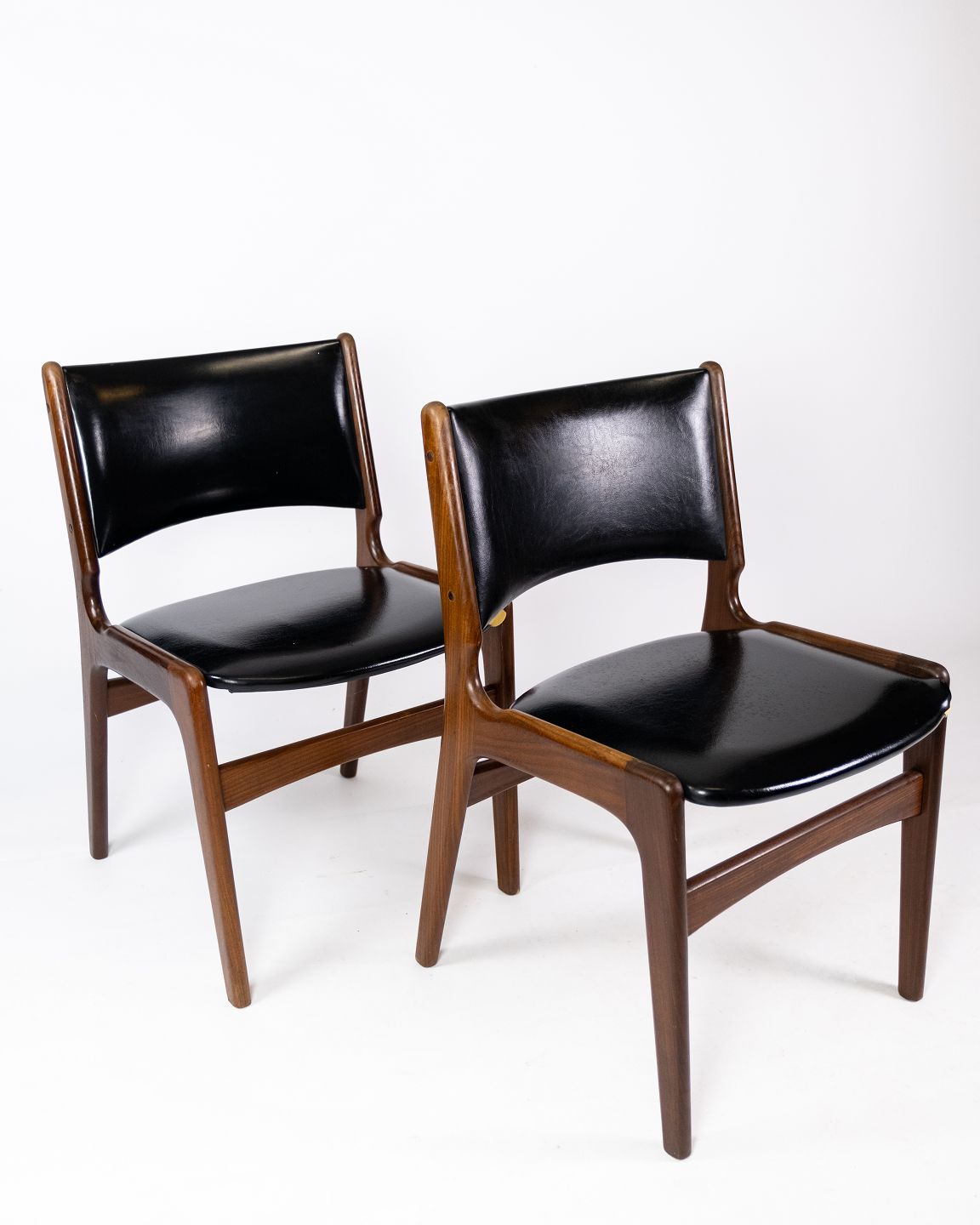 A set of chairs in teak and with black leather, designed by Erik Buch in the 1960s, exudes a timeless elegance and functionality. These chairs are a beautiful example of Danish furniture design from the mid-20th century and will add a sublime atmosphere to any interior.