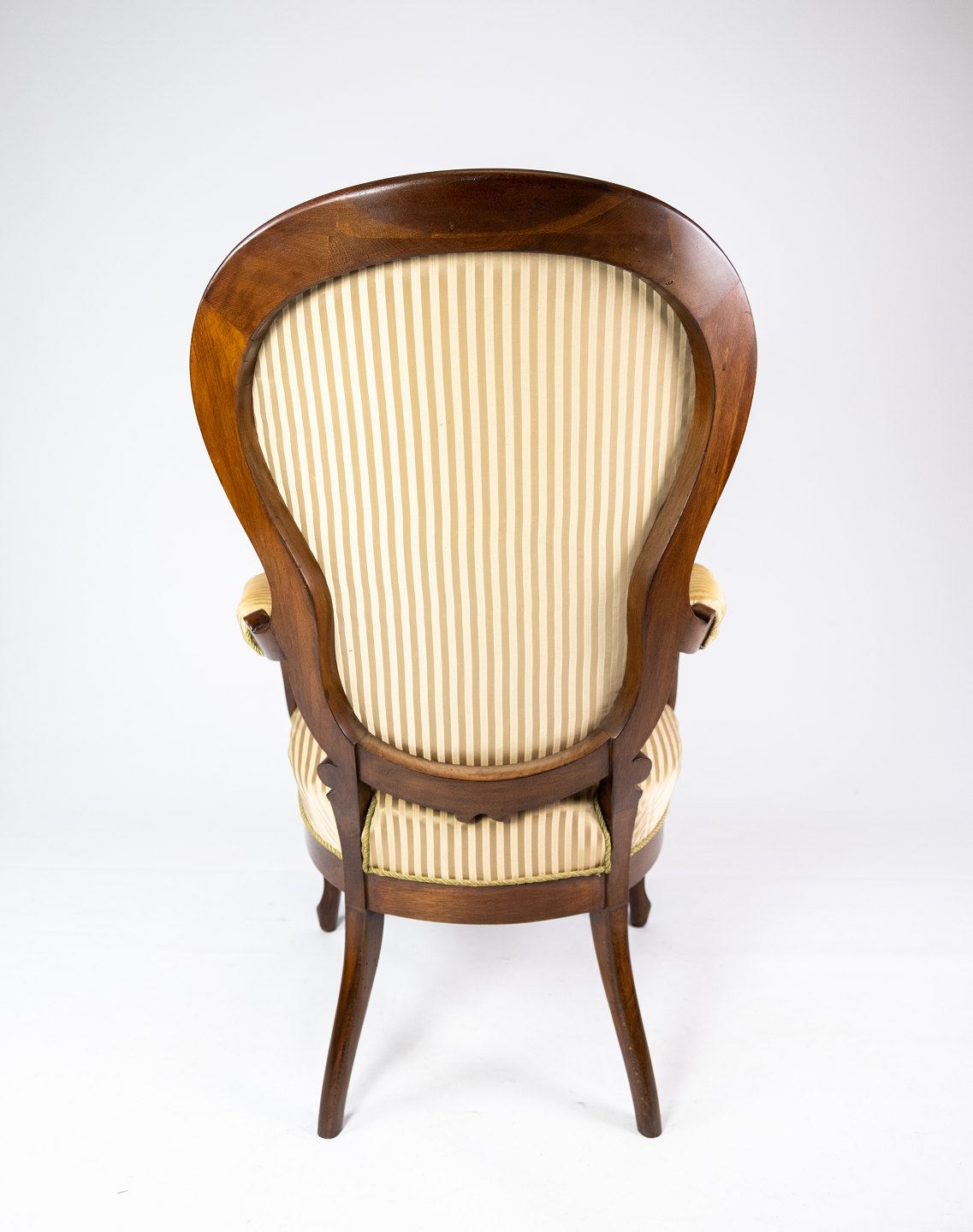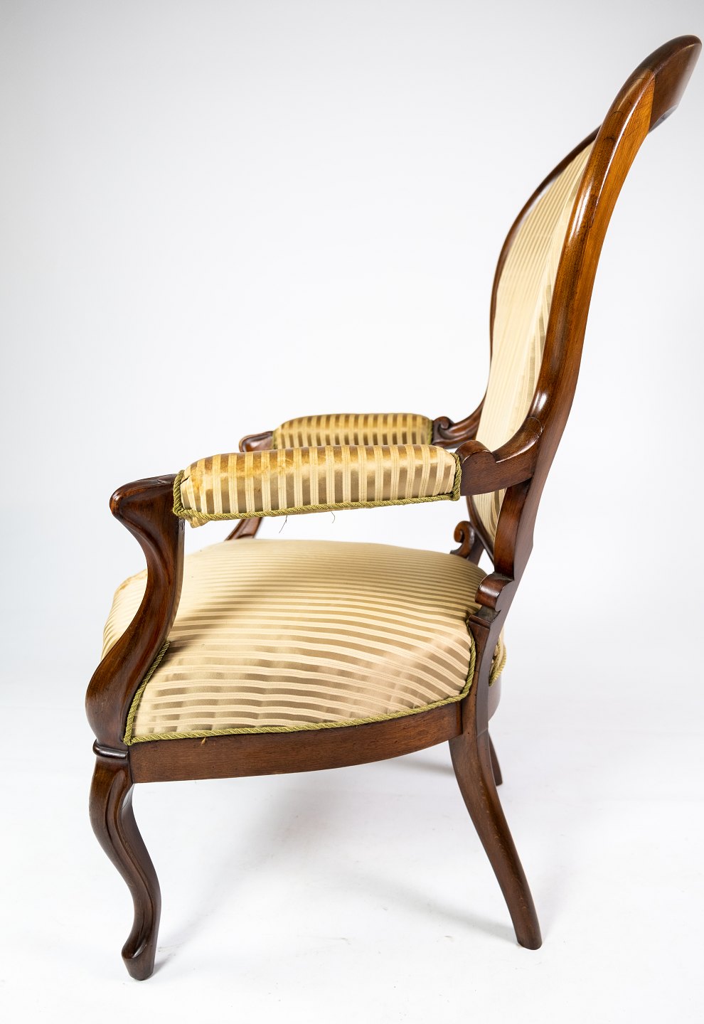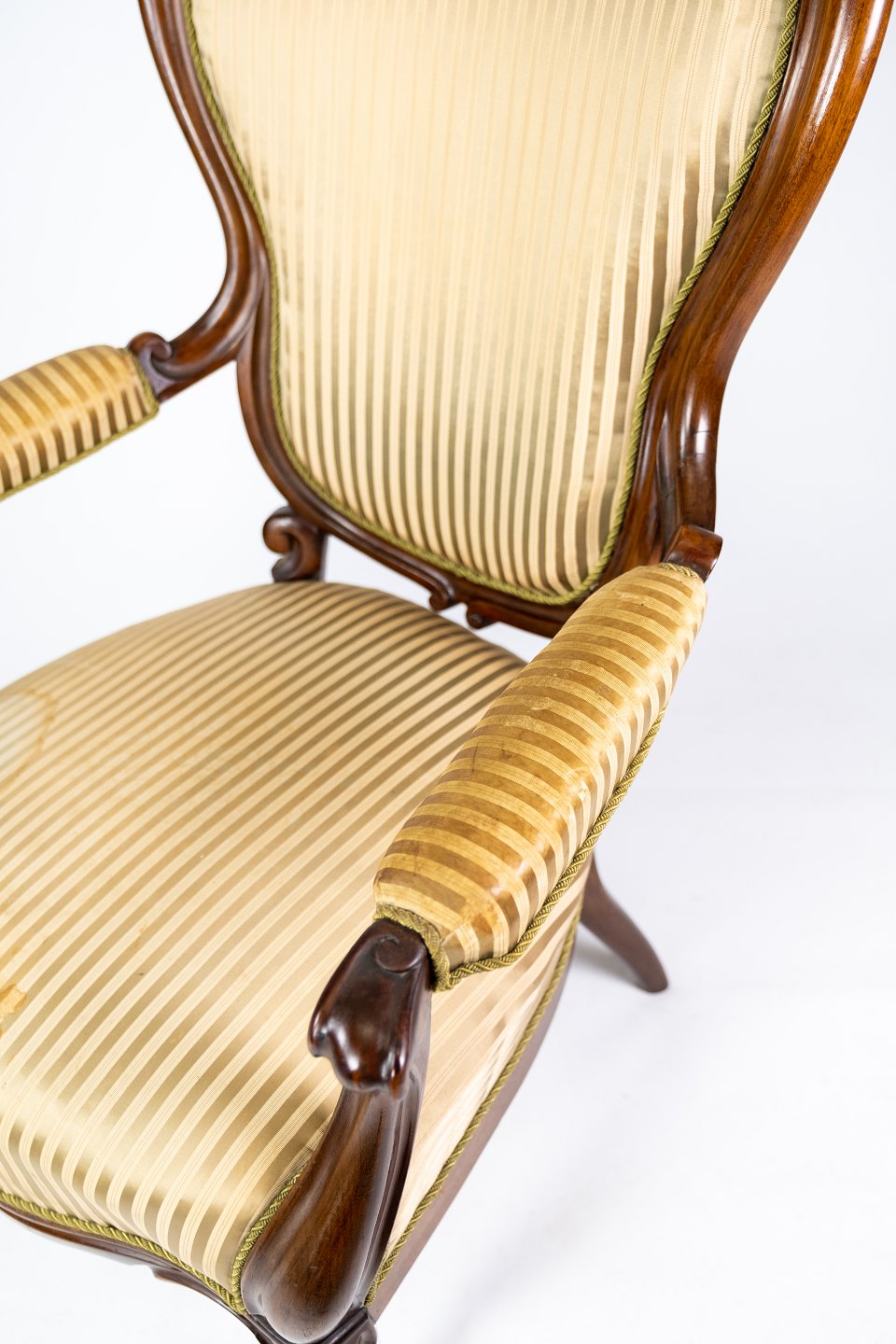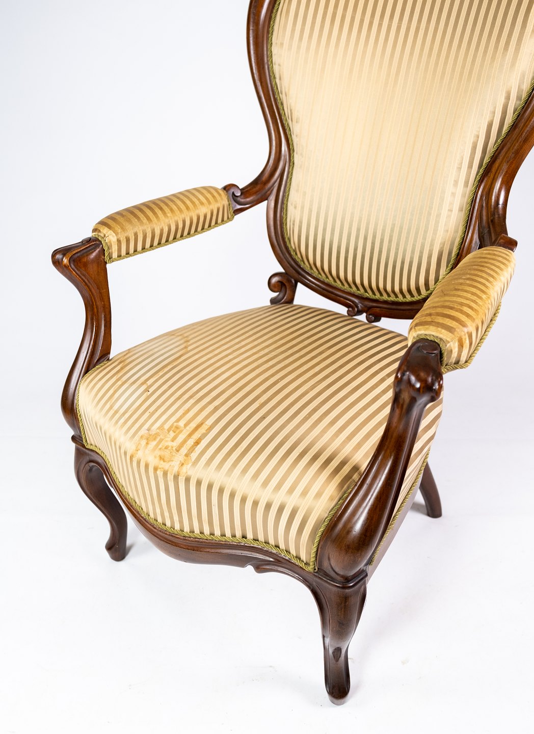 SoldAntique rococo armchair of mahogany and upholstered with striped fabric from the 1860s.
