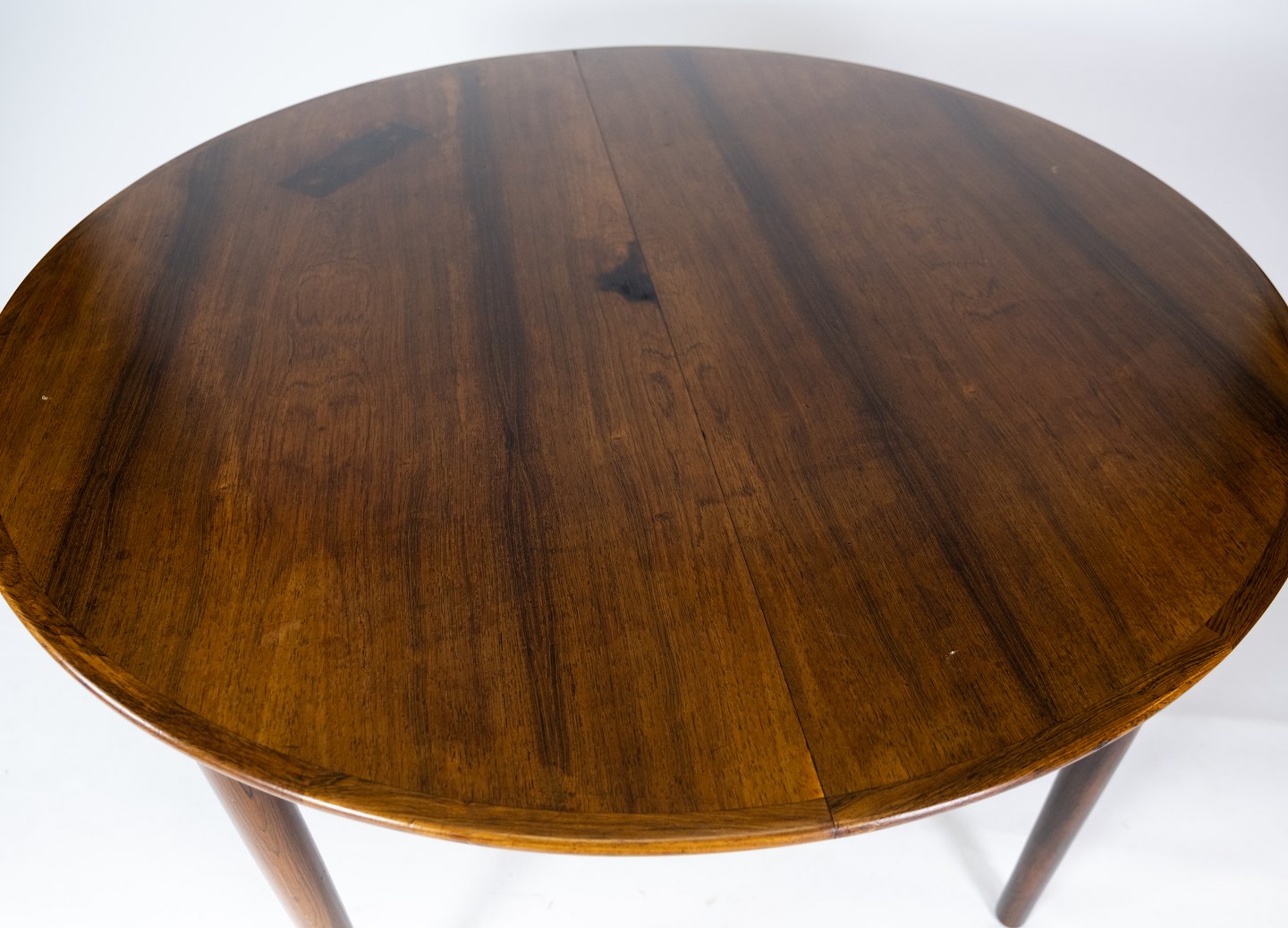 Dette spisebord i palisander, designet af Arne Vodder i 1960'erne, er et bemærkelsesværdigt eksempel på dansk møbeldesign fra denne æra. Palisandertræets varme farver og smukke mønstre giver bordet en elegant og sofistikeret fremtoning, der passer perfekt til moderne indretning.