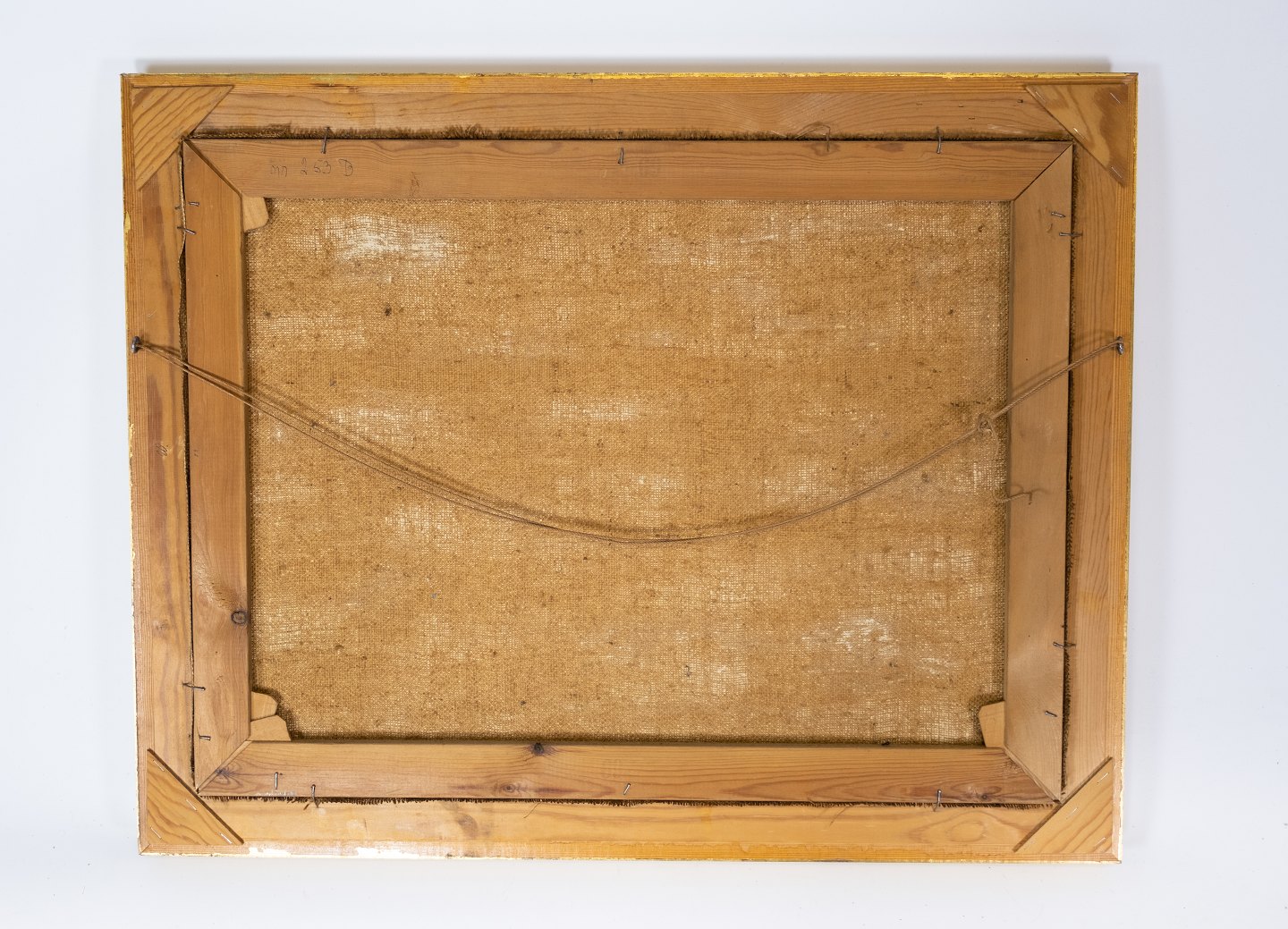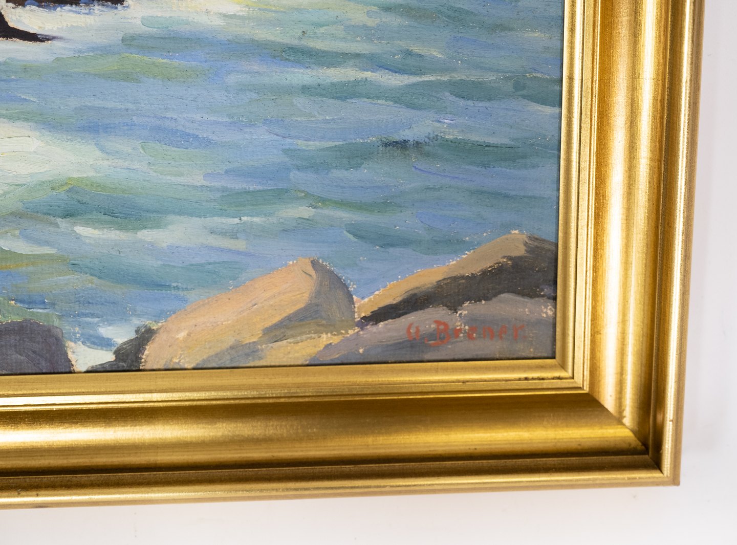 SoldOil painting with beach motif and gilded frame, signed Brener by Arthur Brener 1886-1956.