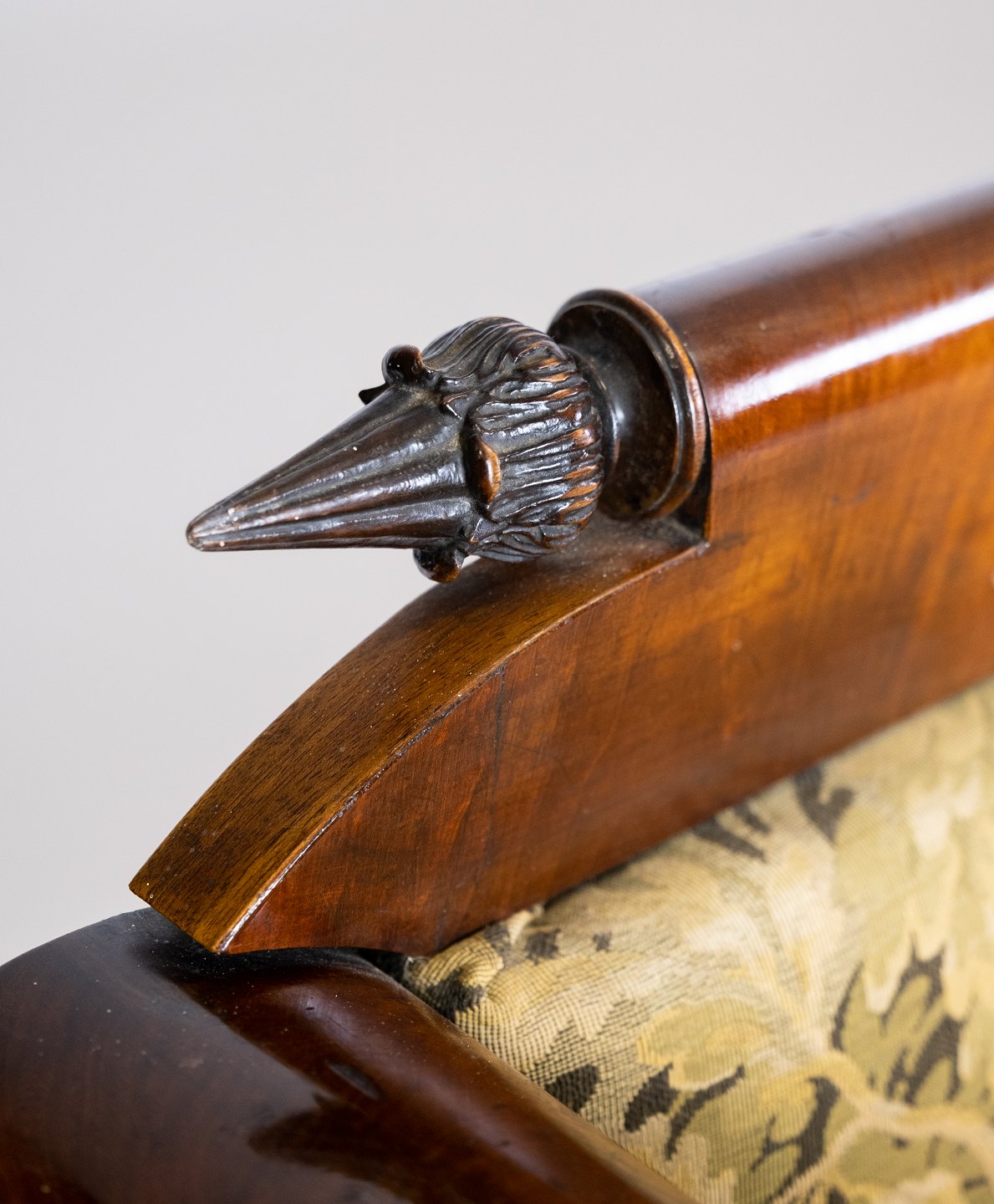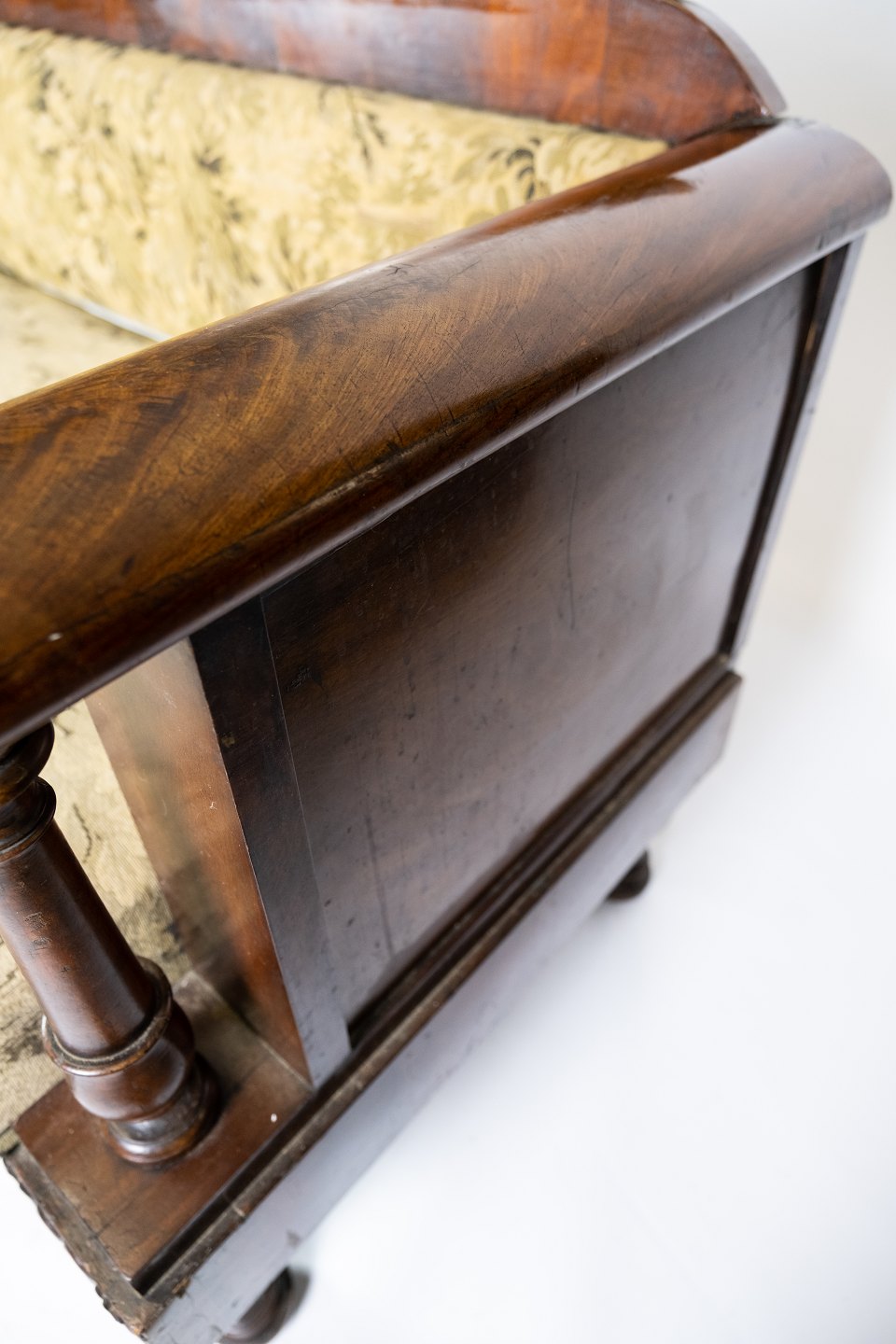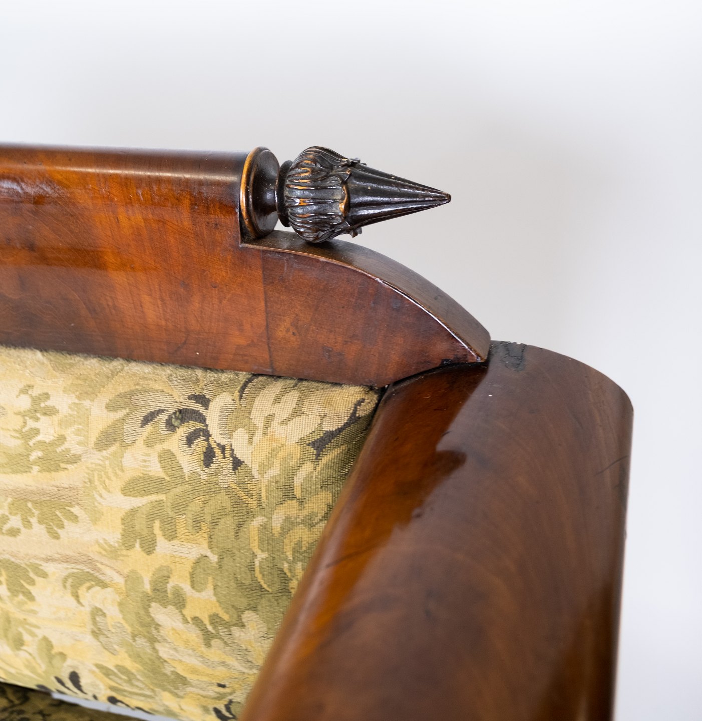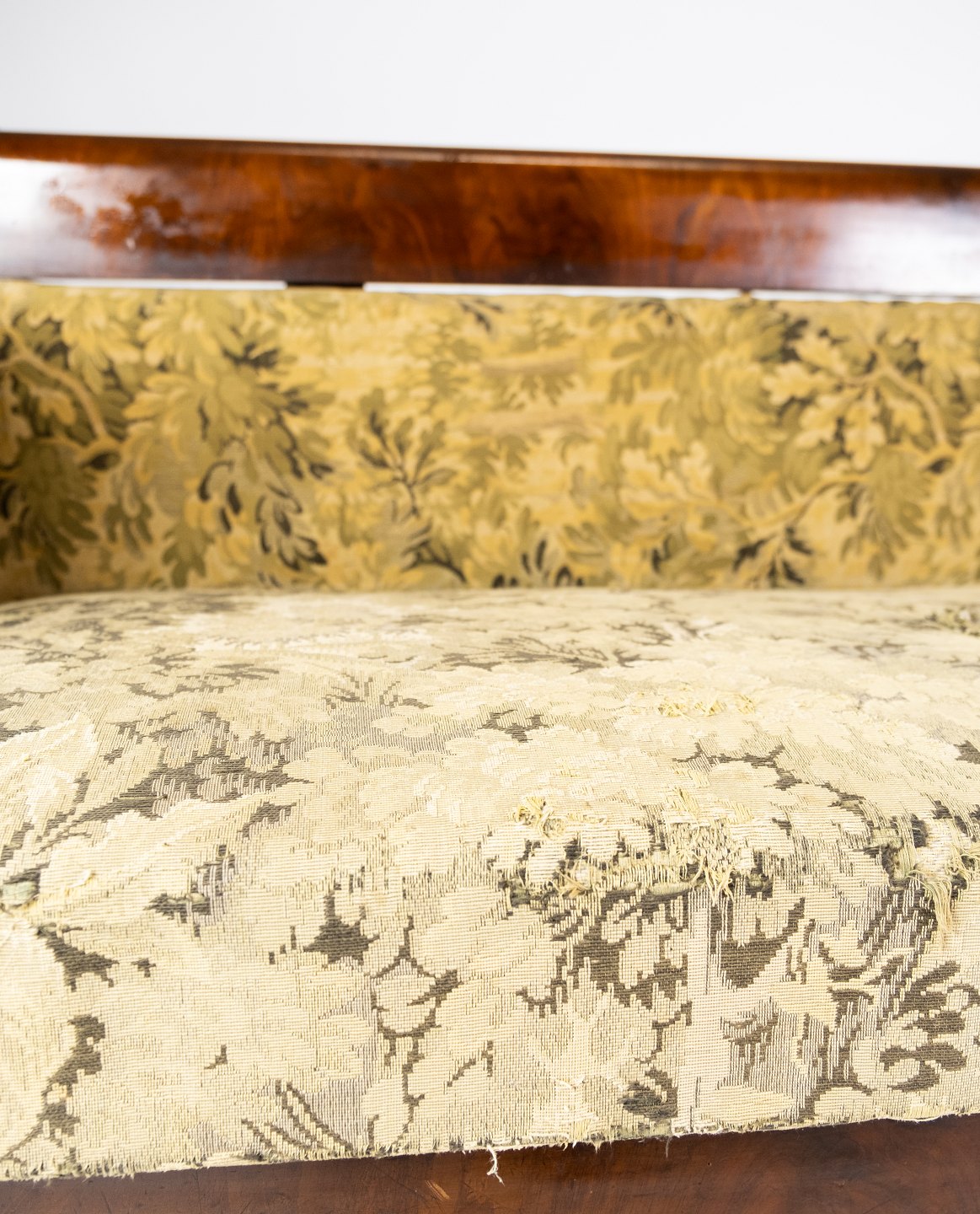 Late Empire sofa of mahogany and upholstered with light fabric, in great antique condition from the 1840s.