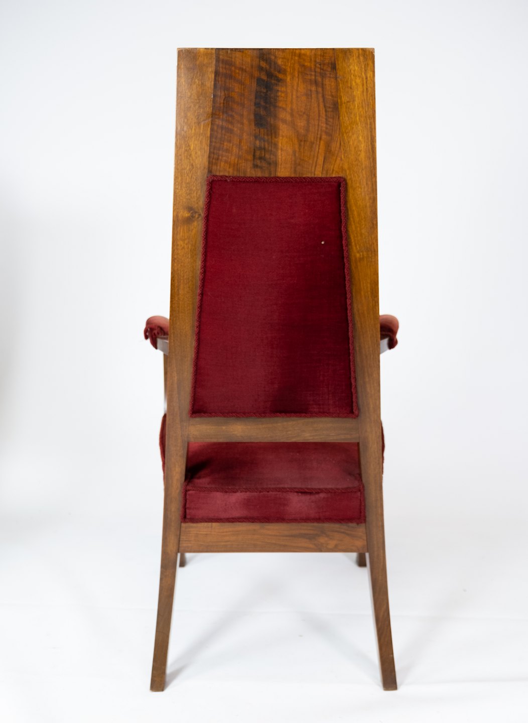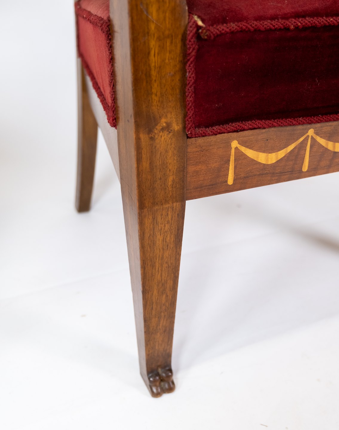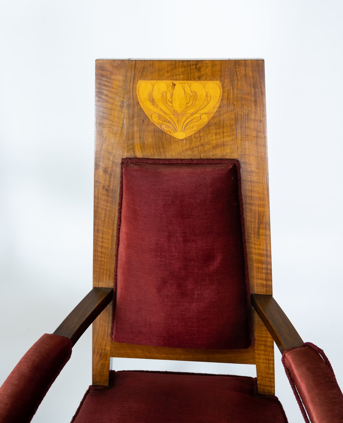 Set of two armchairs of walnut with inlaid wood and upholstered with red velvet from around 1910. The chairs are in great vintage condition.
