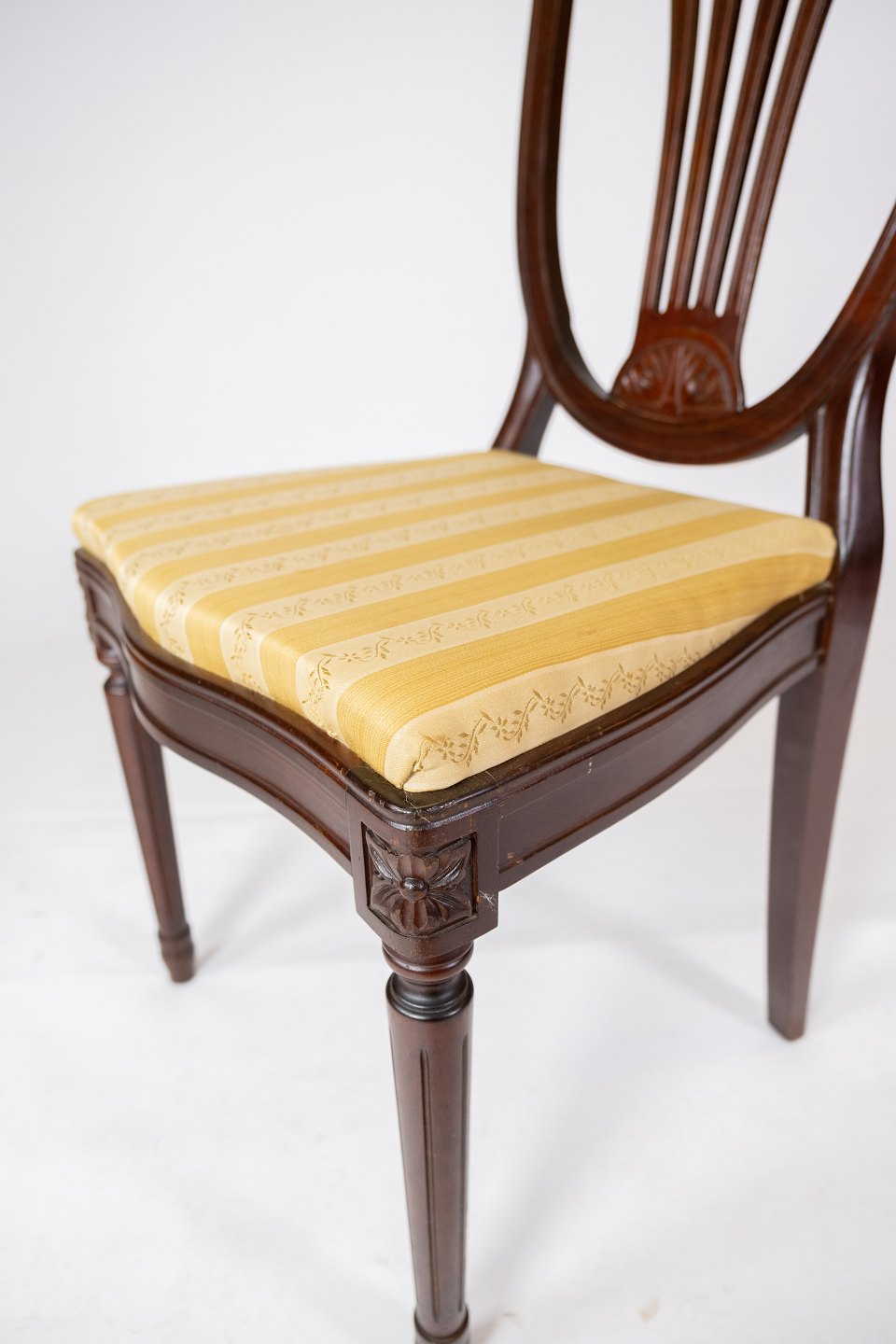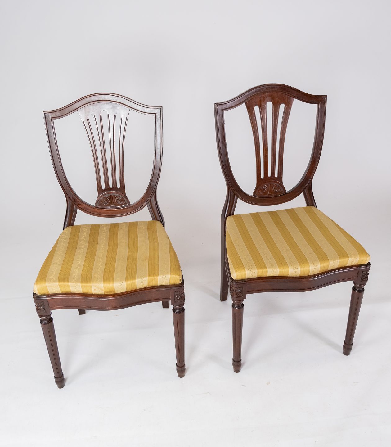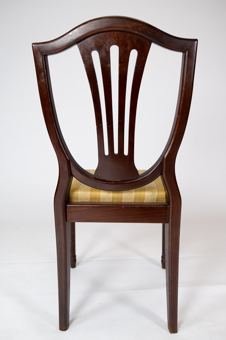 A set of dining room chairs of mahogany and upholstered with striped fabric from the 1920s. The chairs are in great vintage condition.