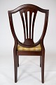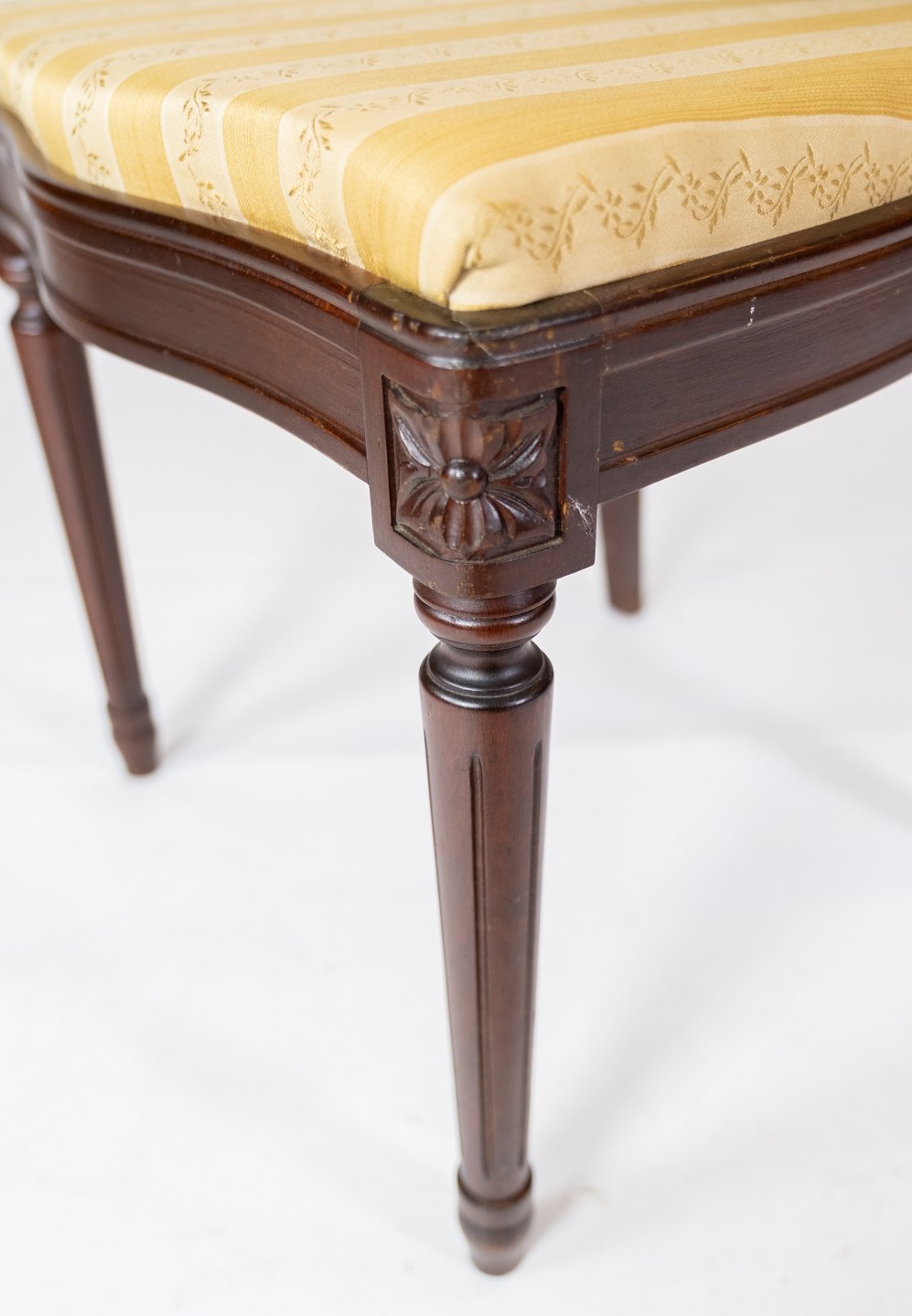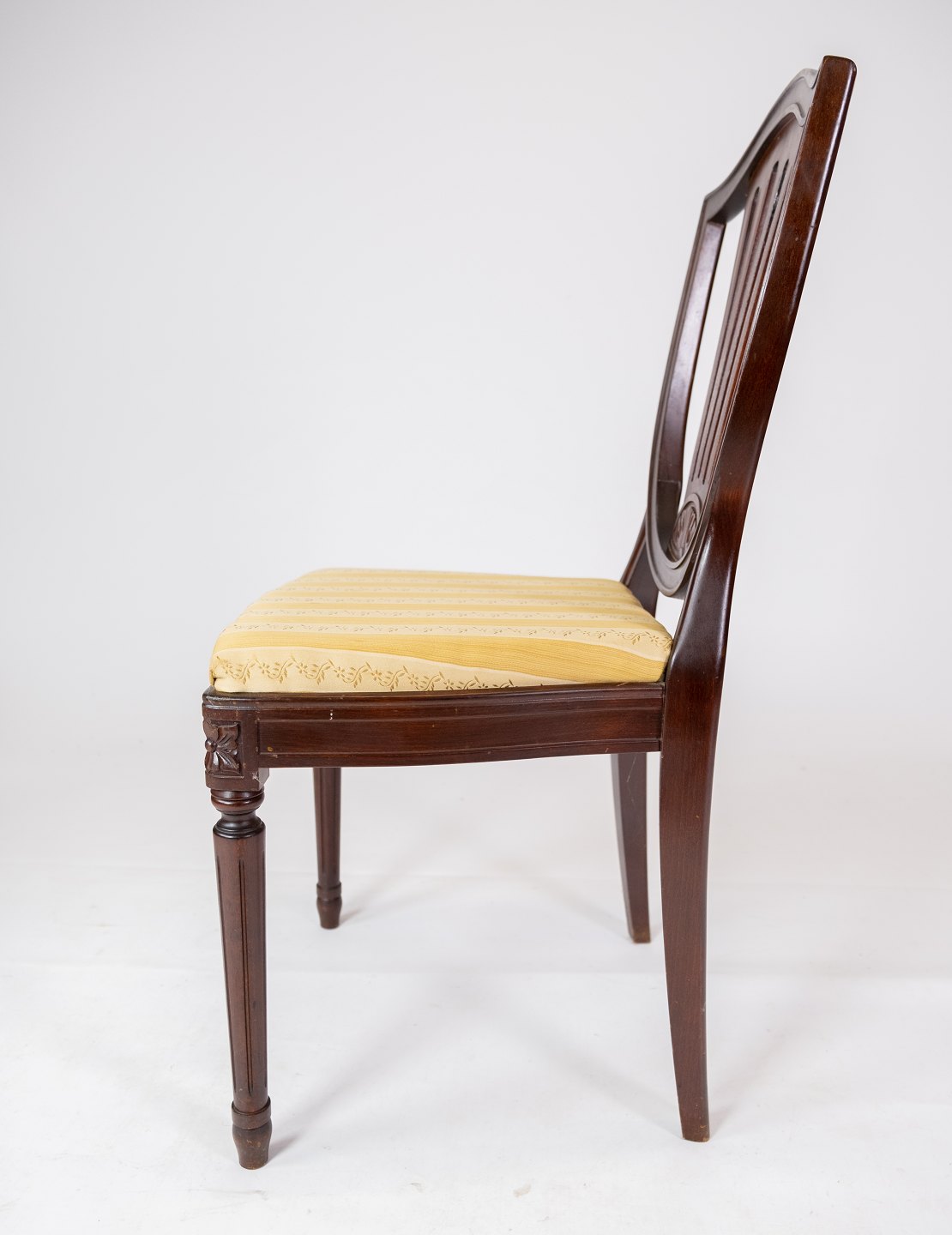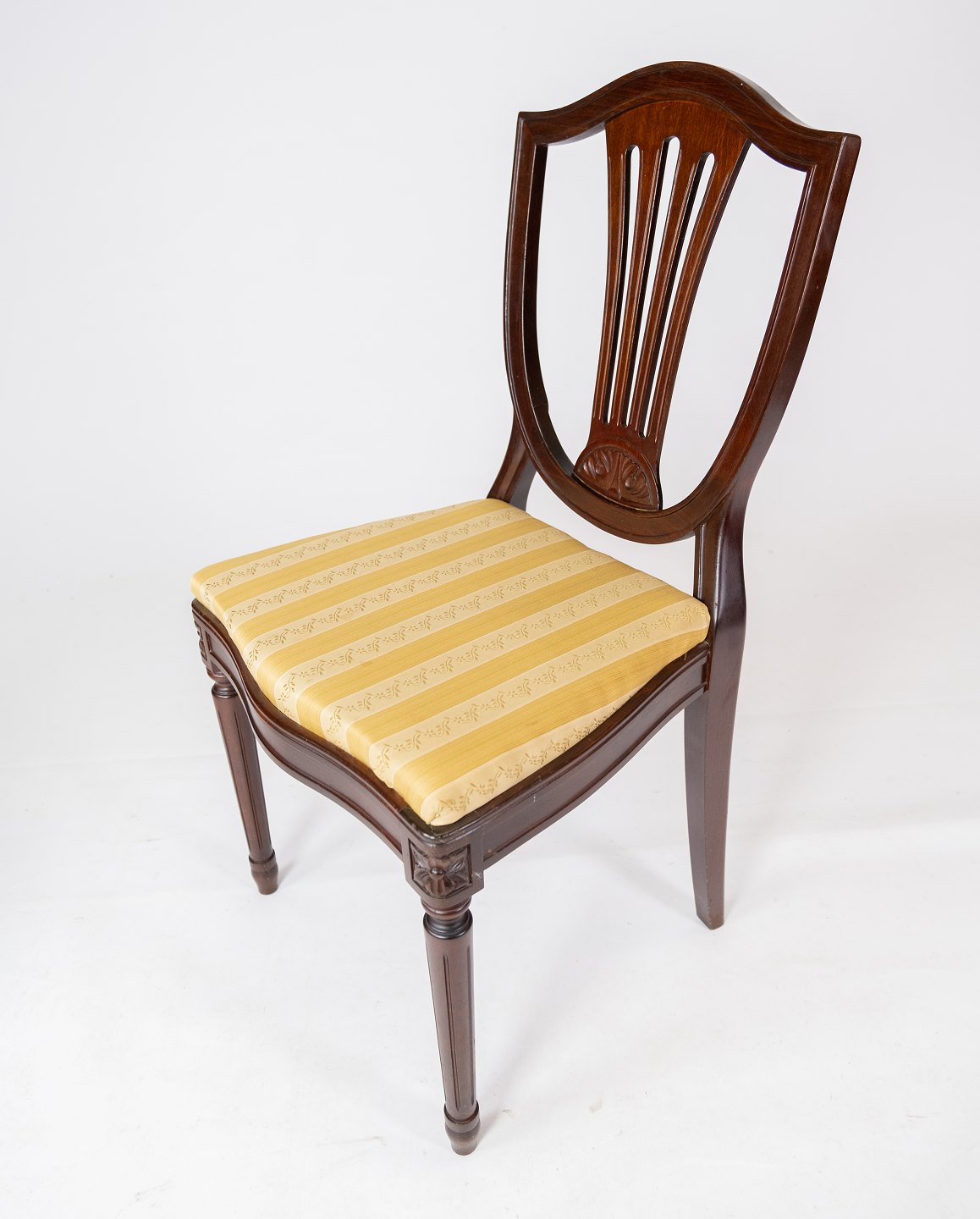 A set of dining room chairs of mahogany and upholstered with striped fabric from the 1920s. The chairs are in great vintage condition.