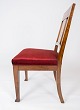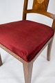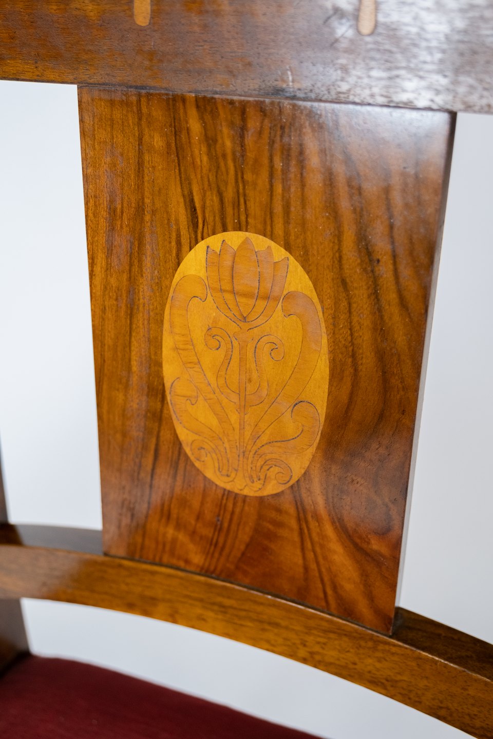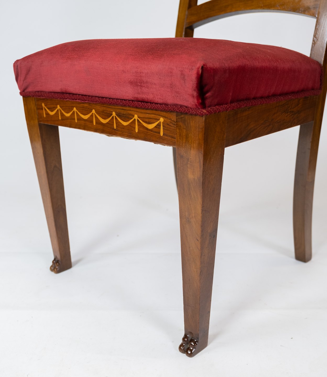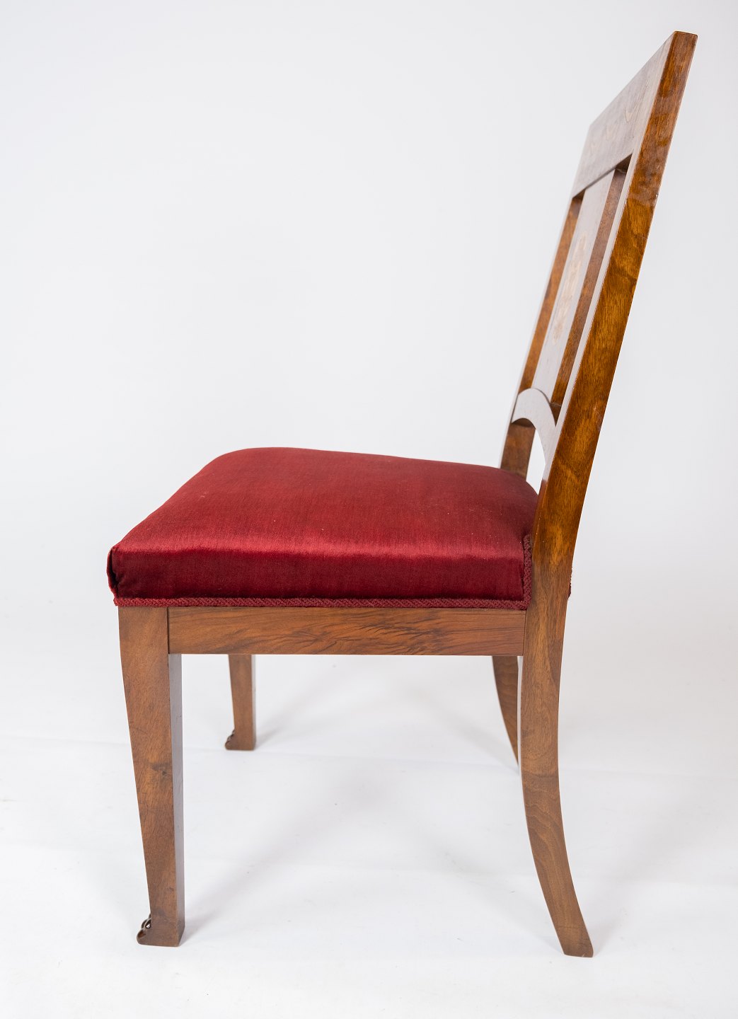 Set of four dining room chairs of walnut with inlaid wood and upholstered with red velvet from around 1910. The chairs are in great vintage condition.