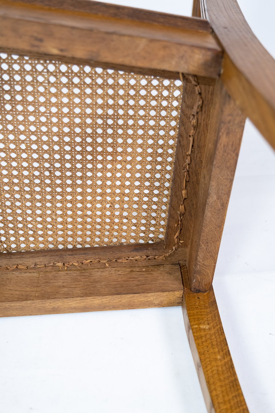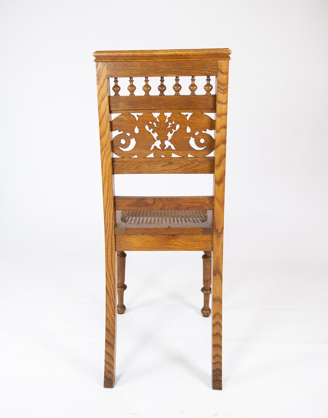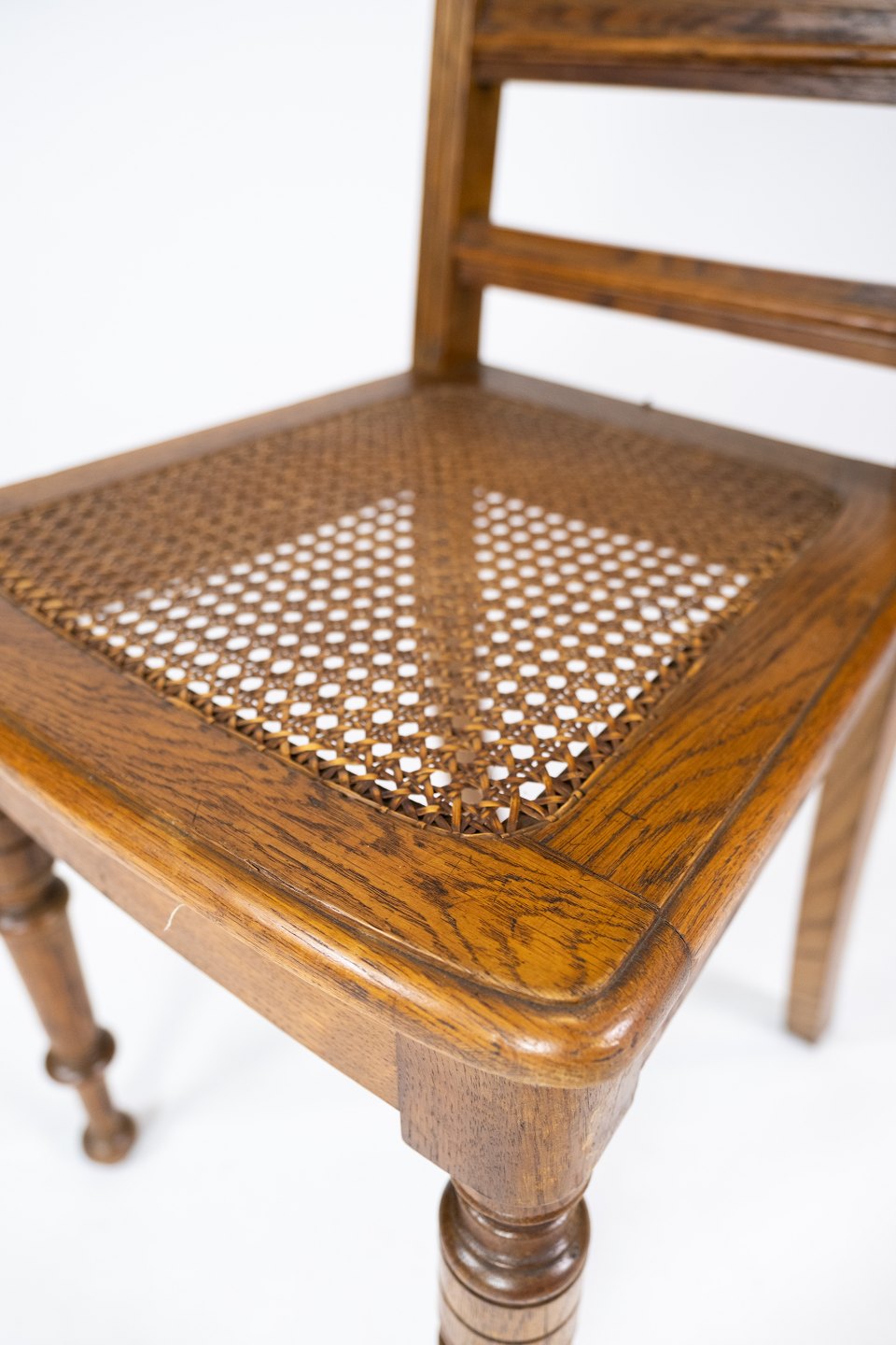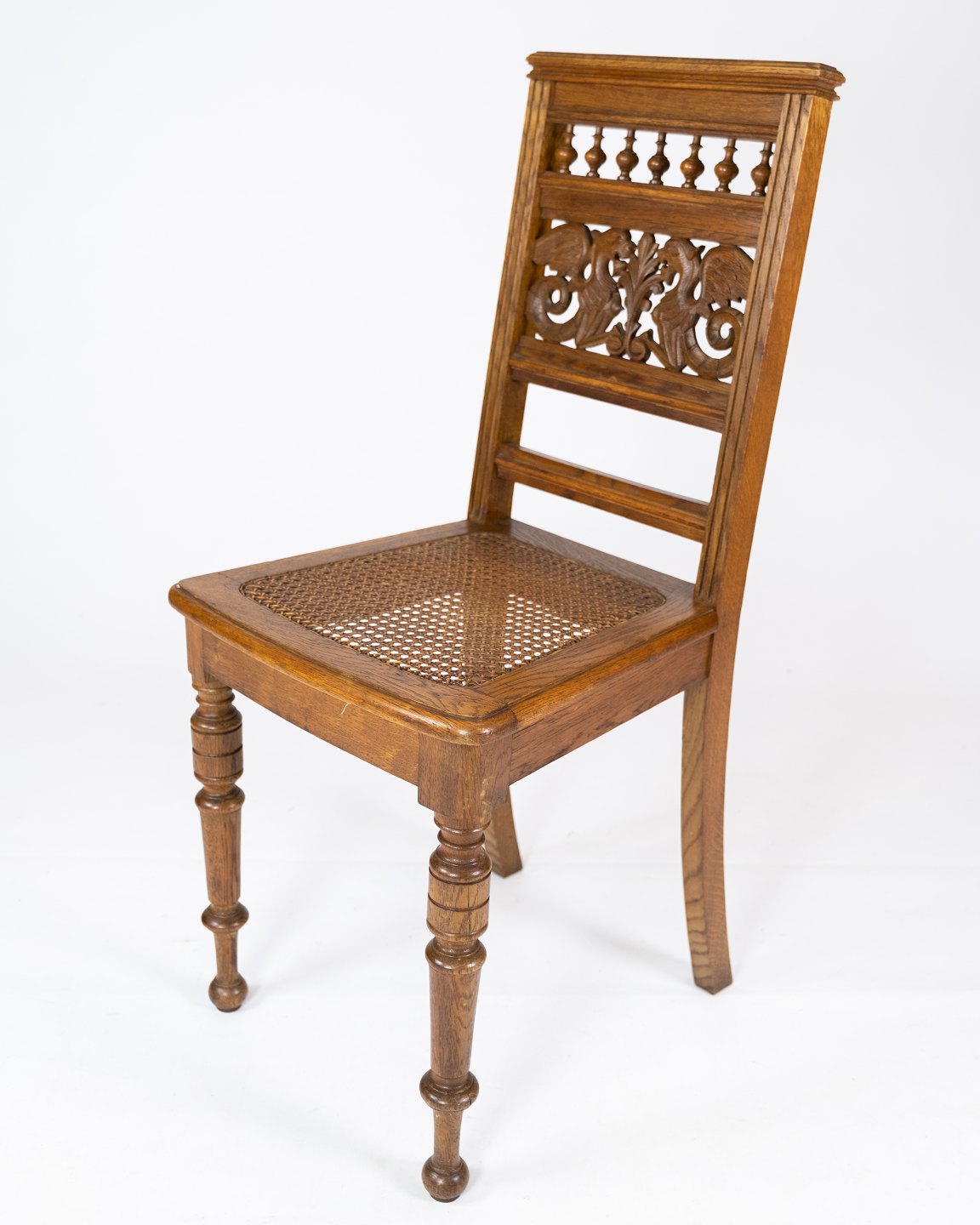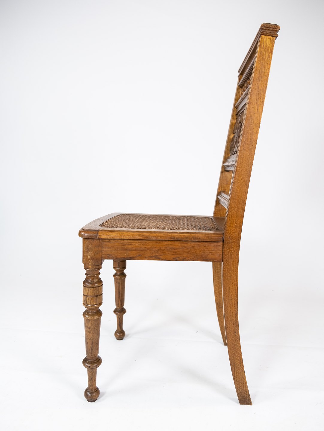 Sæt af spisestuestole af poleret eg dekoreret med udskæringer og rørflet fra 1920erne. Stolene er i flot brugt stand og vi har i alt 12 stk. på lager.