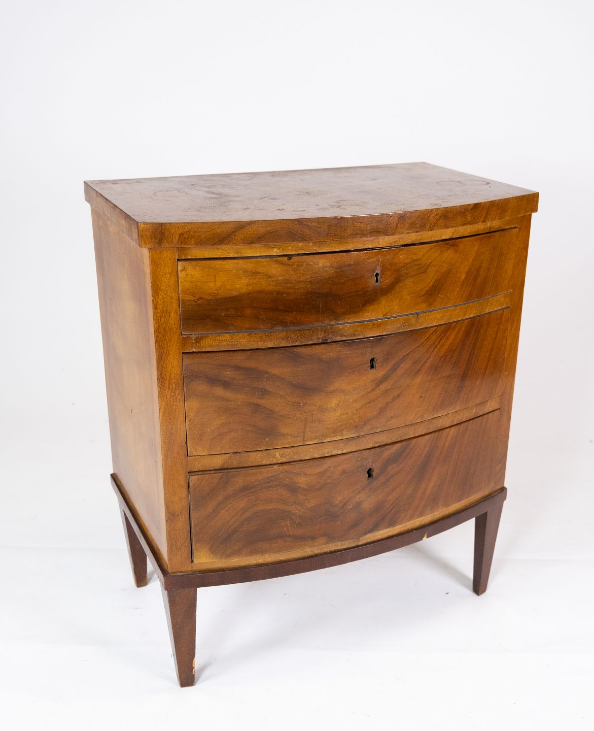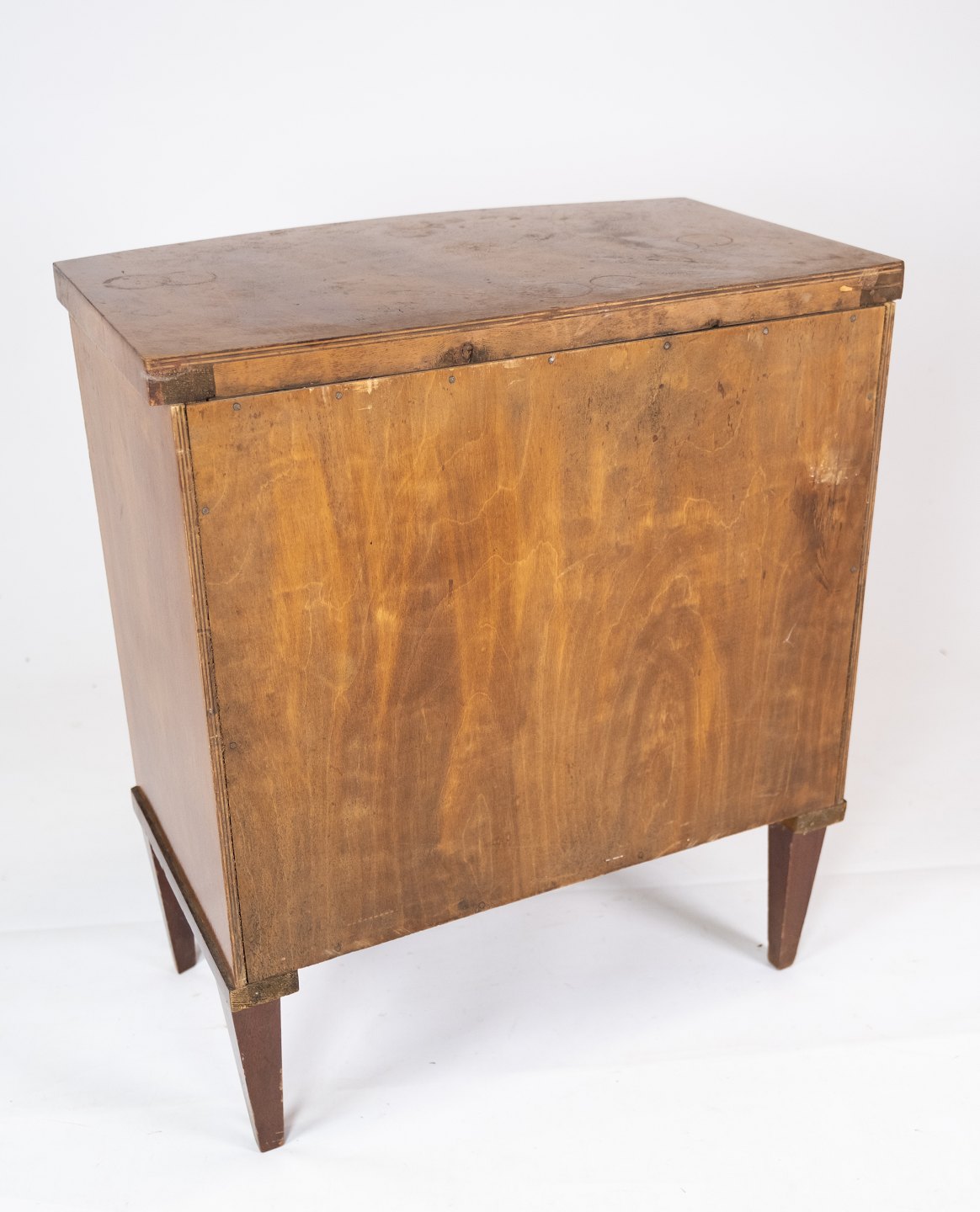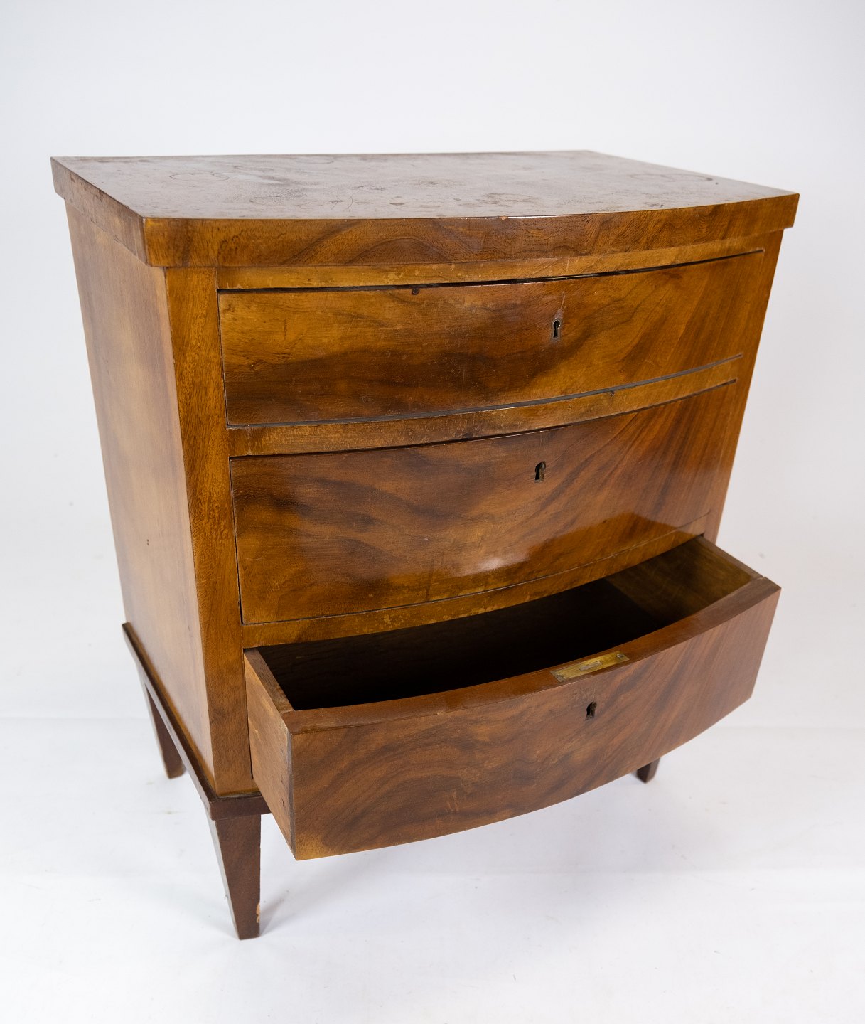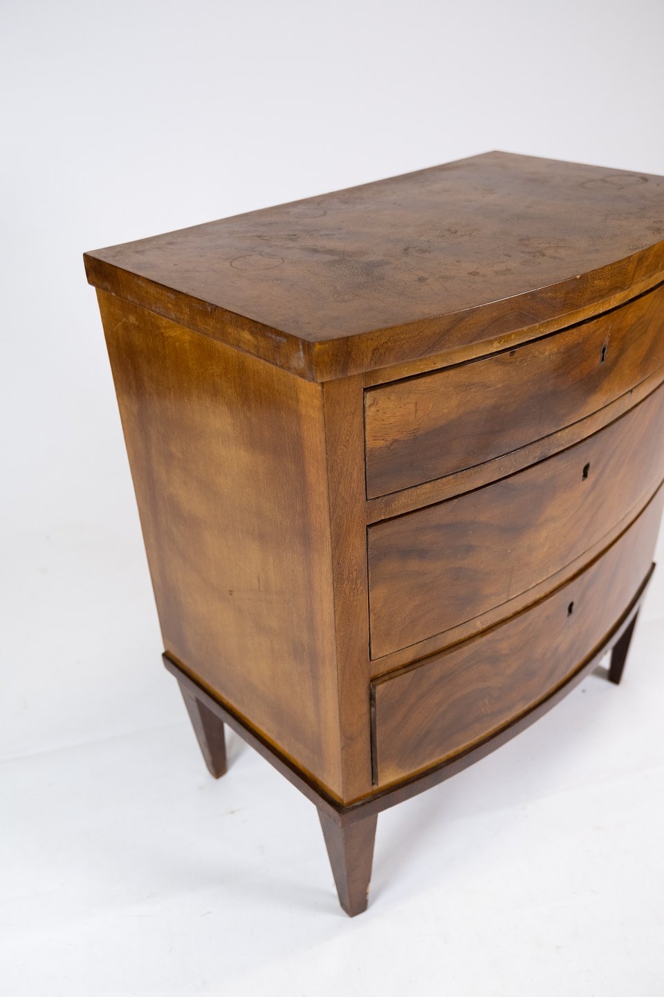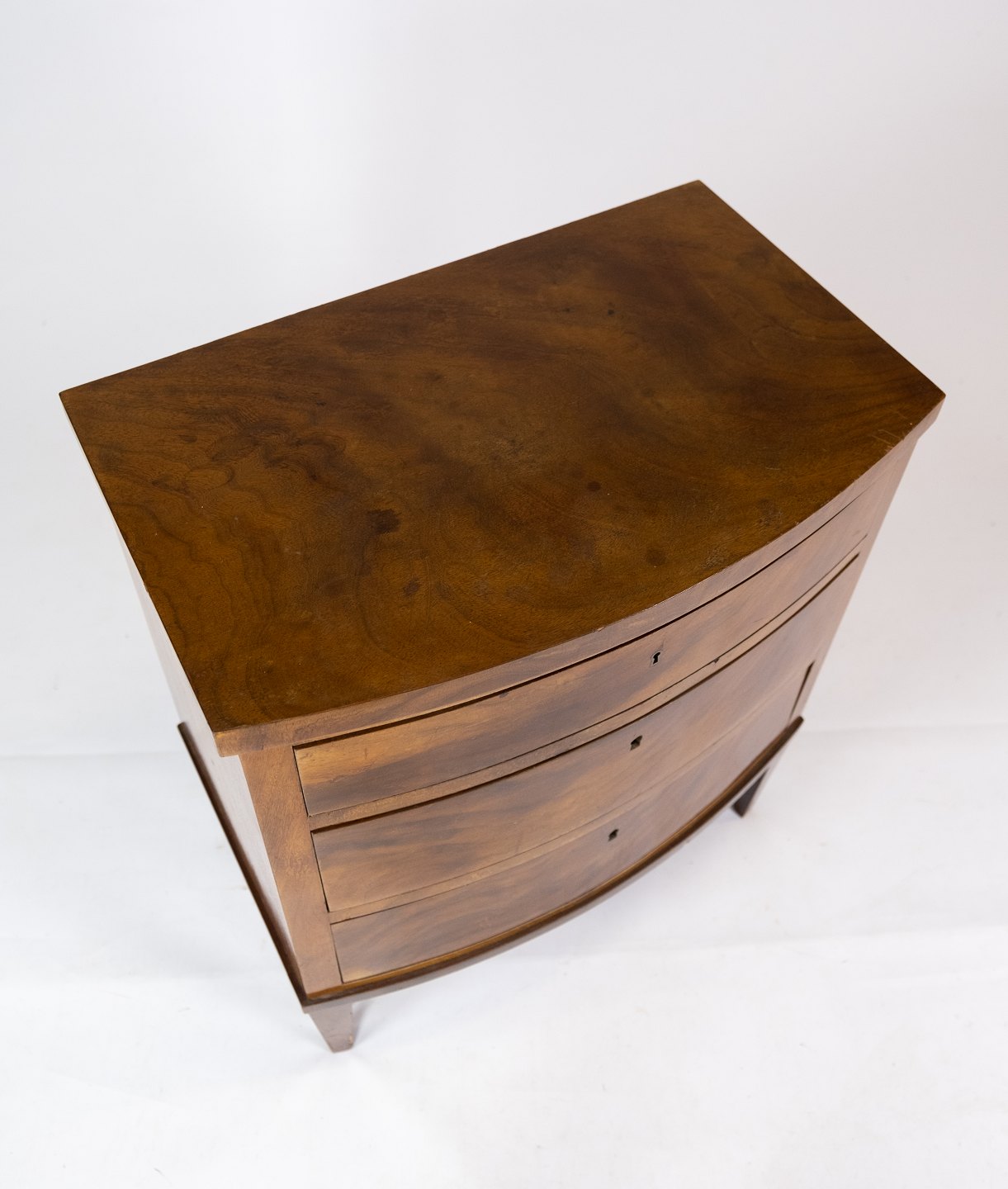 Buet kommode af mahogni og tre skuffer, i flot antik stand fra 1890erne.
