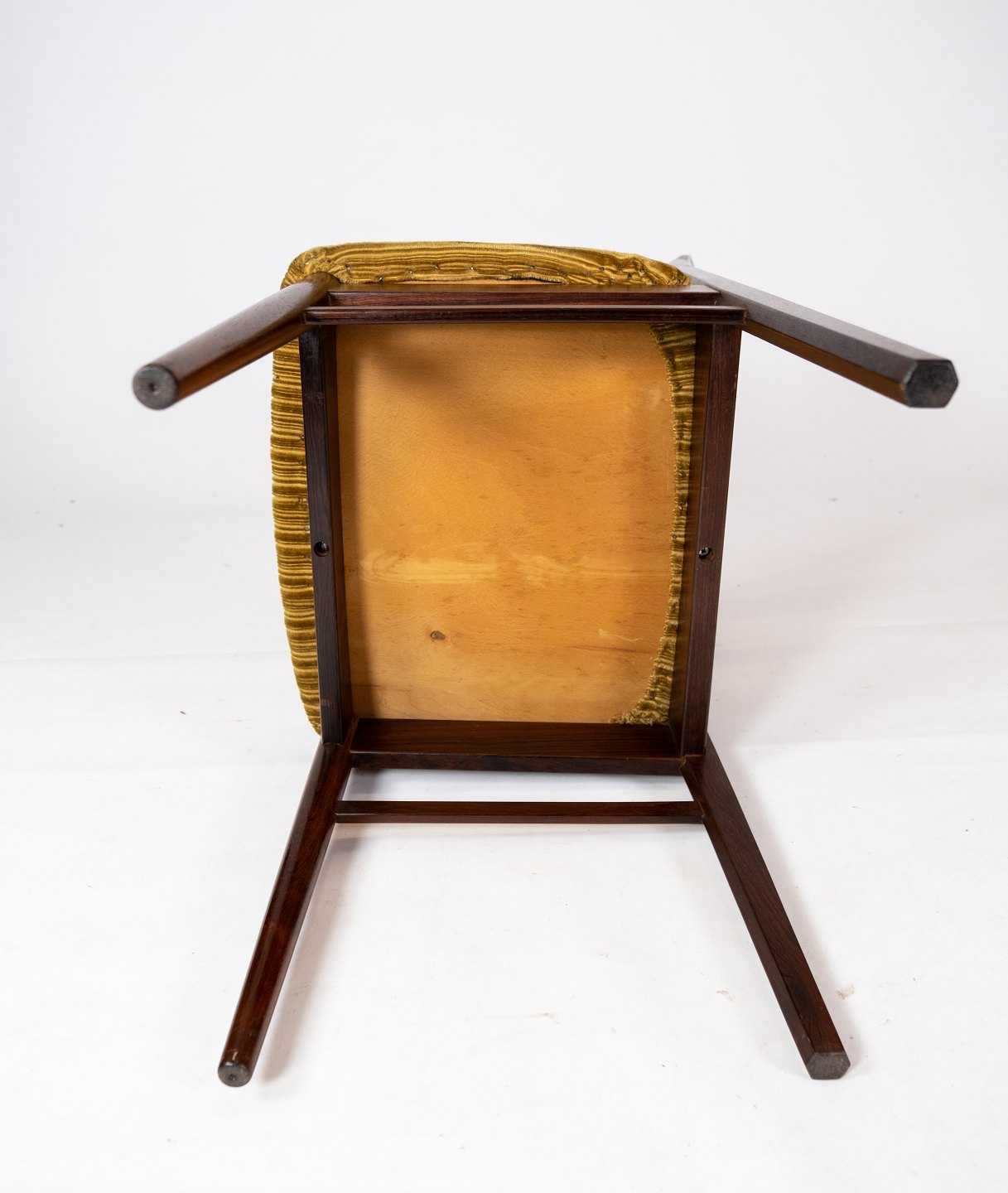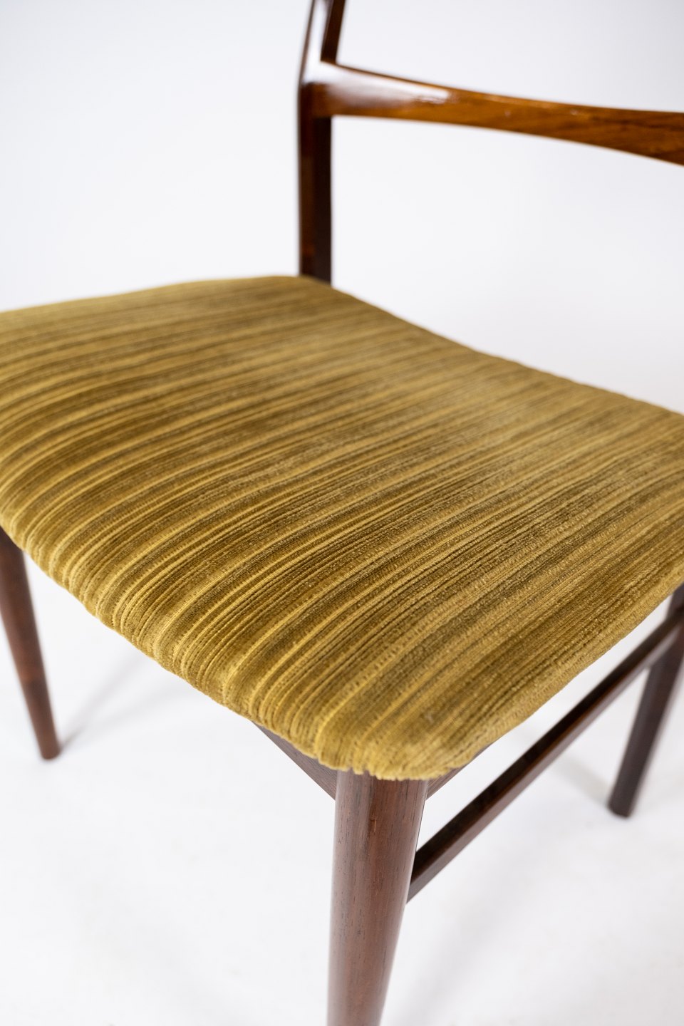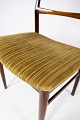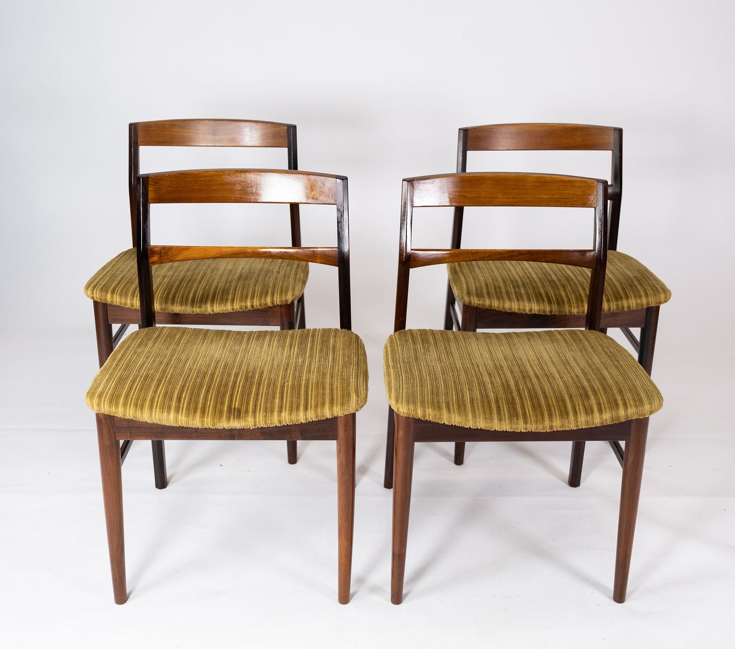 Et sæt spisestuestole i palisander og grønt stof, af dansk design fra 1960'erne, udstråler en tidløs elegance og enkelhed, der kendetegner den skandinaviske designtradition fra denne periode.