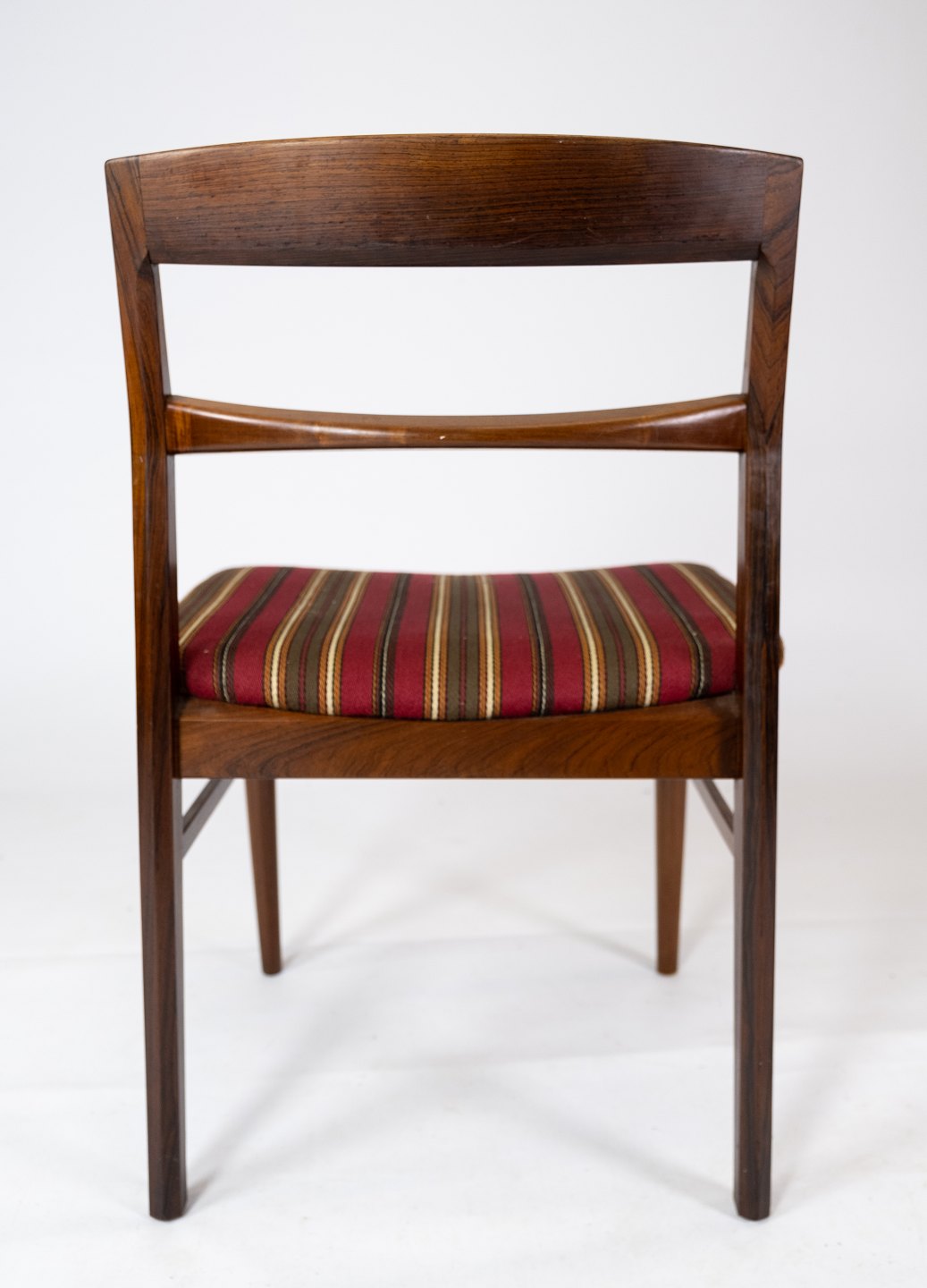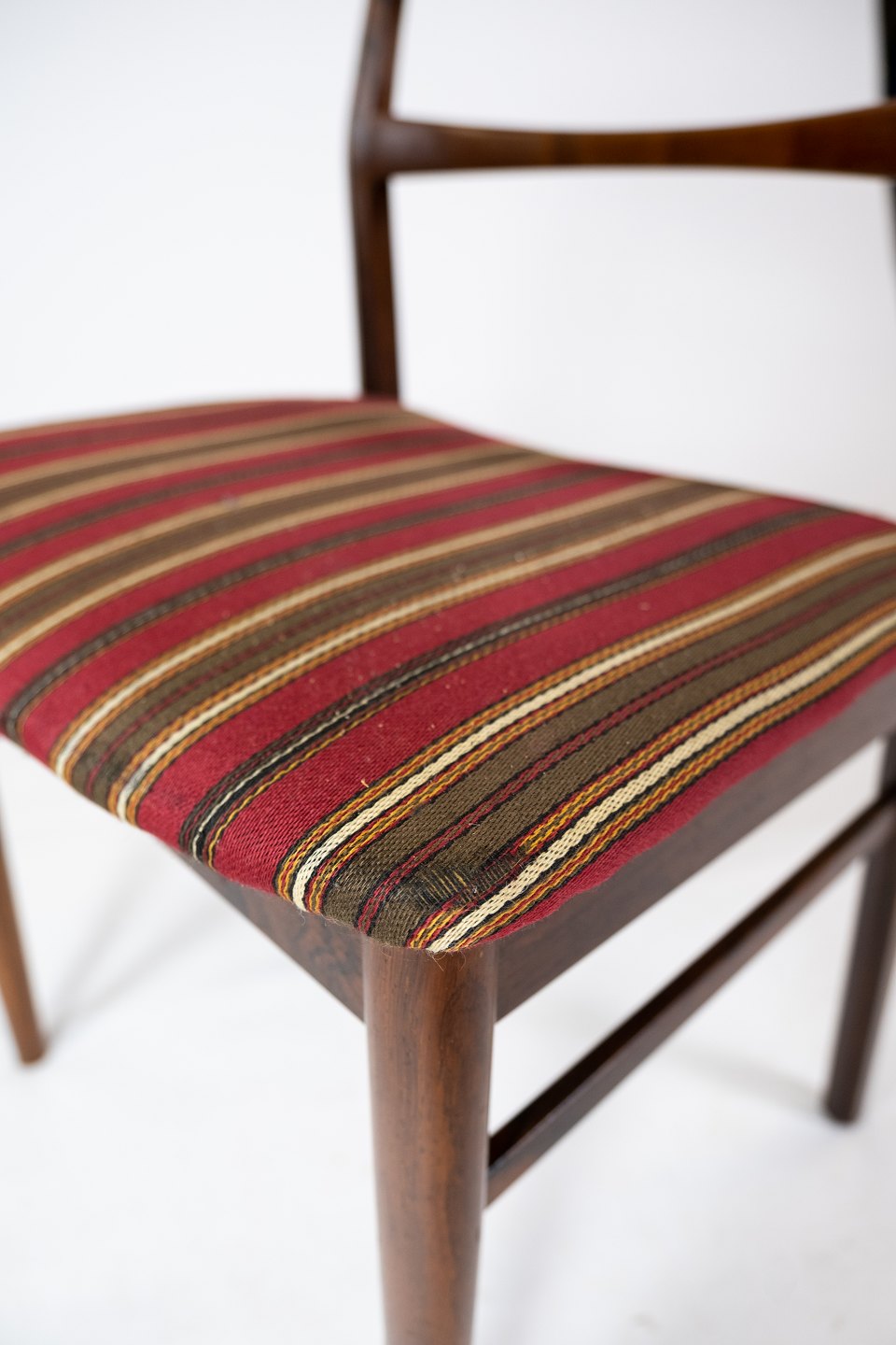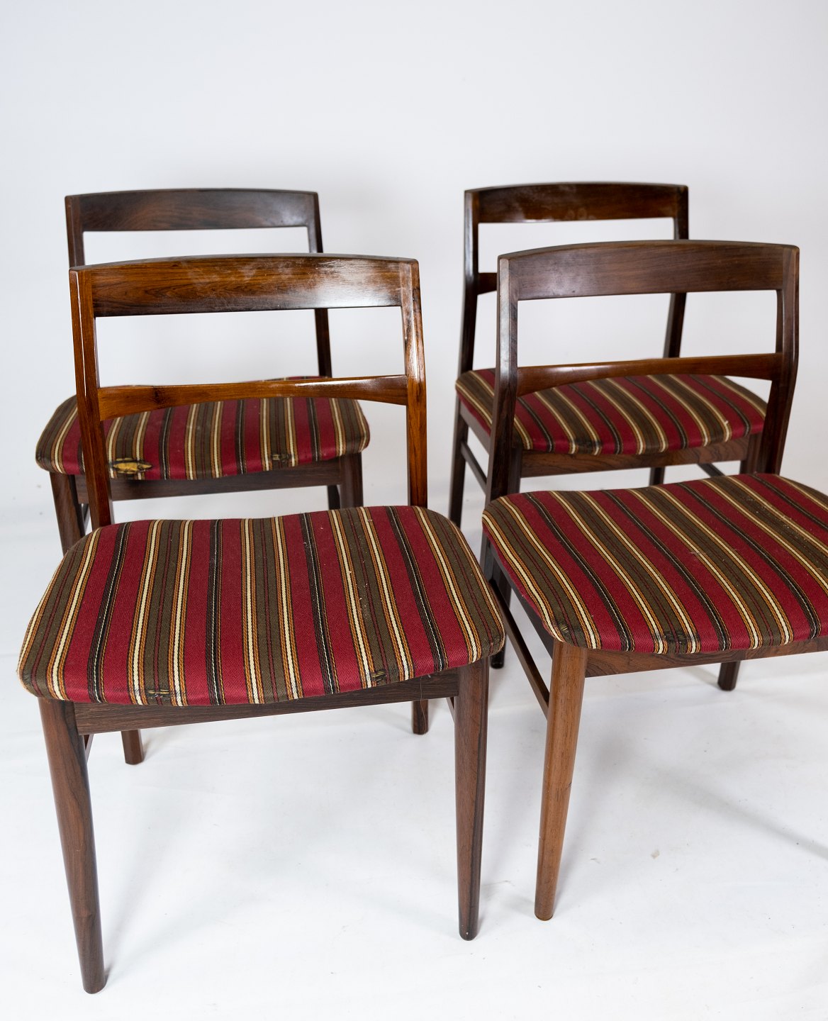Et sæt af fire spisestuestole i palisander og stribet stof, af dansk design fra 1960'erne, fremviser en klassisk skandinavisk æstetik og håndværksmæssig finesse. Disse stole er et smukt eksempel på den enkle elegance og funktionalitet, der kendetegner dansk møbeldesign fra denne periode.