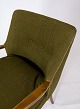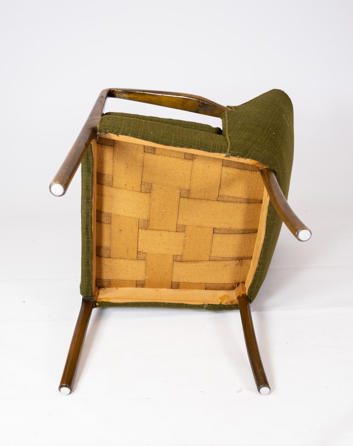 En armstol i birketræ med originalt mørkegrønt stof, af dansk design fra 1950'erne, fremviser en tidløs elegance og enkelhed, der karakteriserer den skandinaviske designtradition fra denne æra.