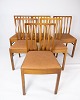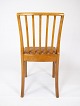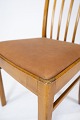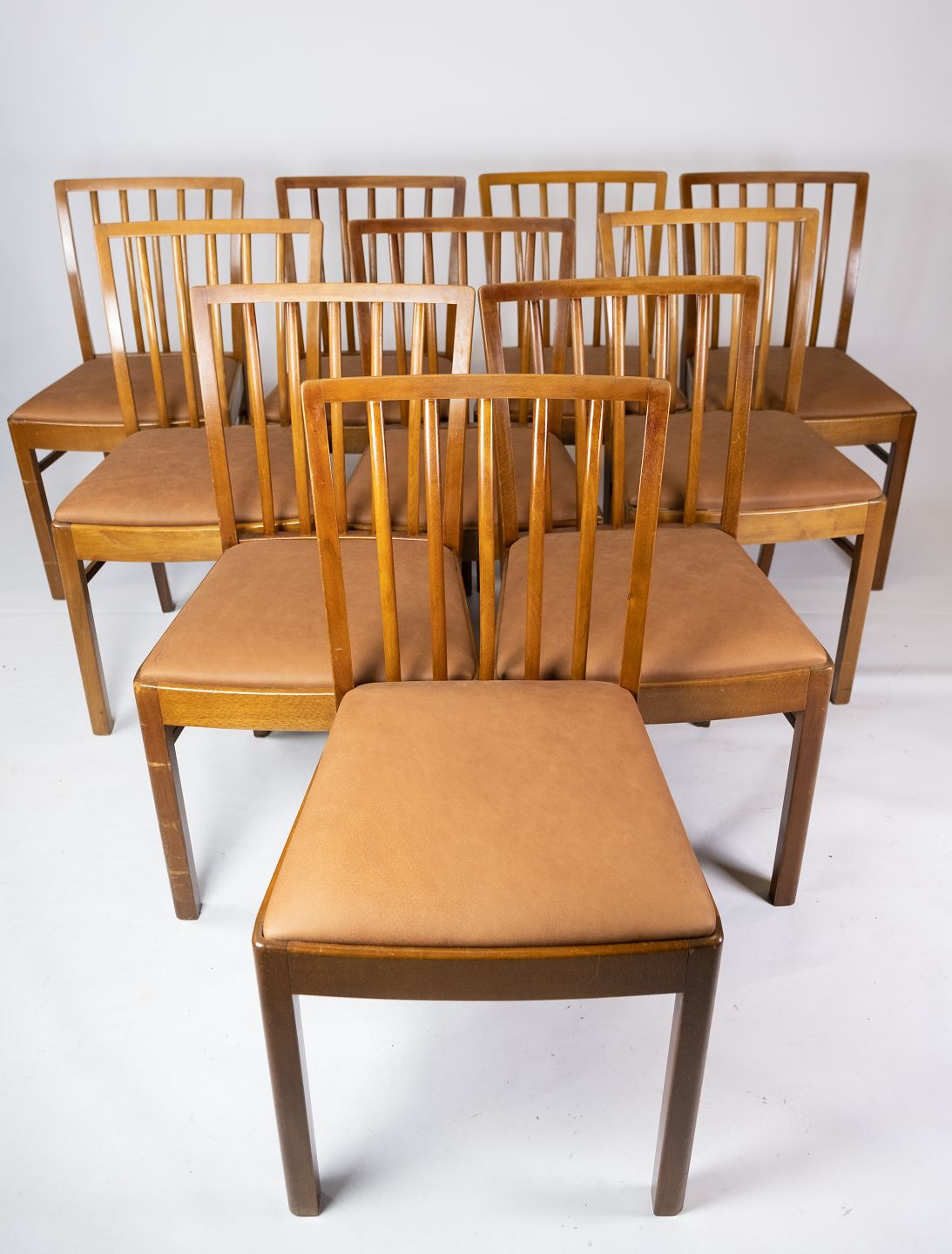 Set of 10 dining room chairs of light wood and upholstered with cognac leather from the 1940s. The chairs are in great vintage condition.