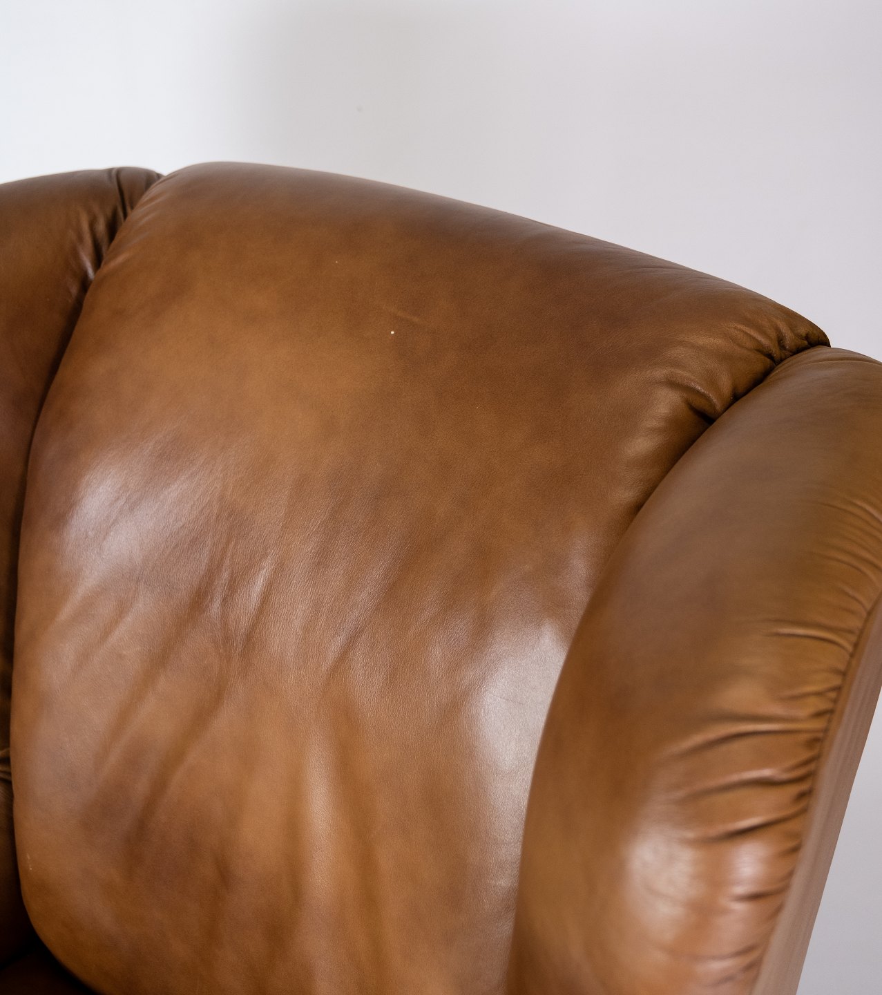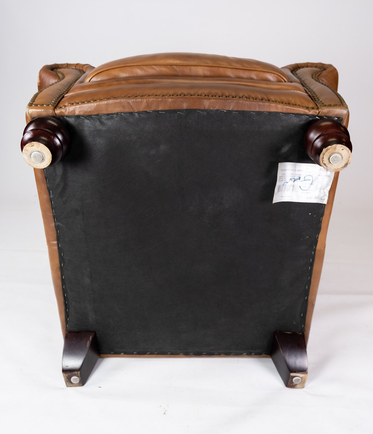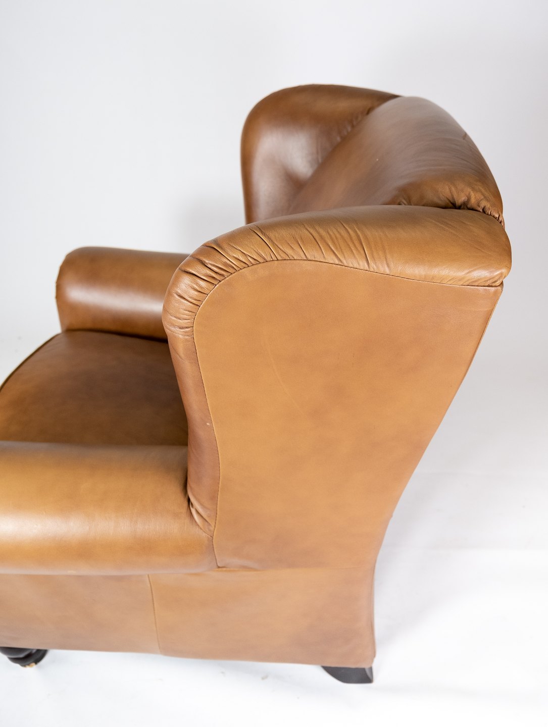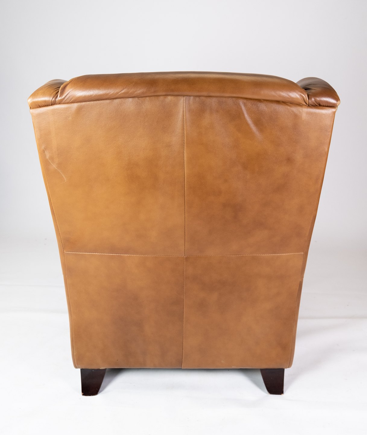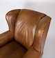 Stor hvilestole/øreklapstol i cognacfarvet læder.
