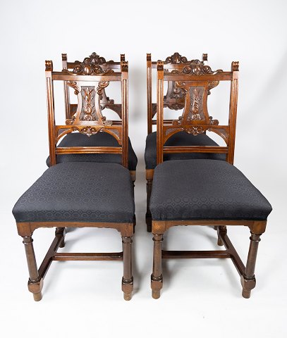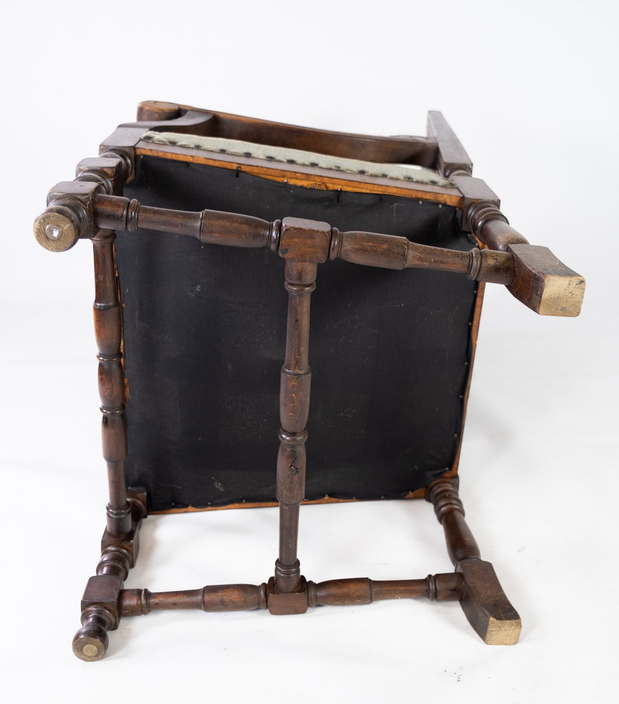 Armstol af nøddetræ og polstret med mørke grønt stof, i flot antik stand fra 1910erne.