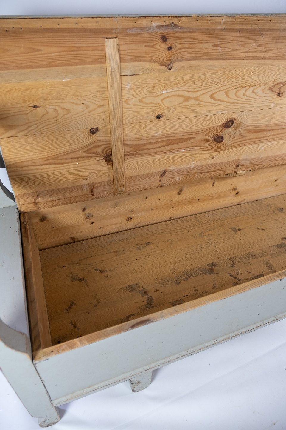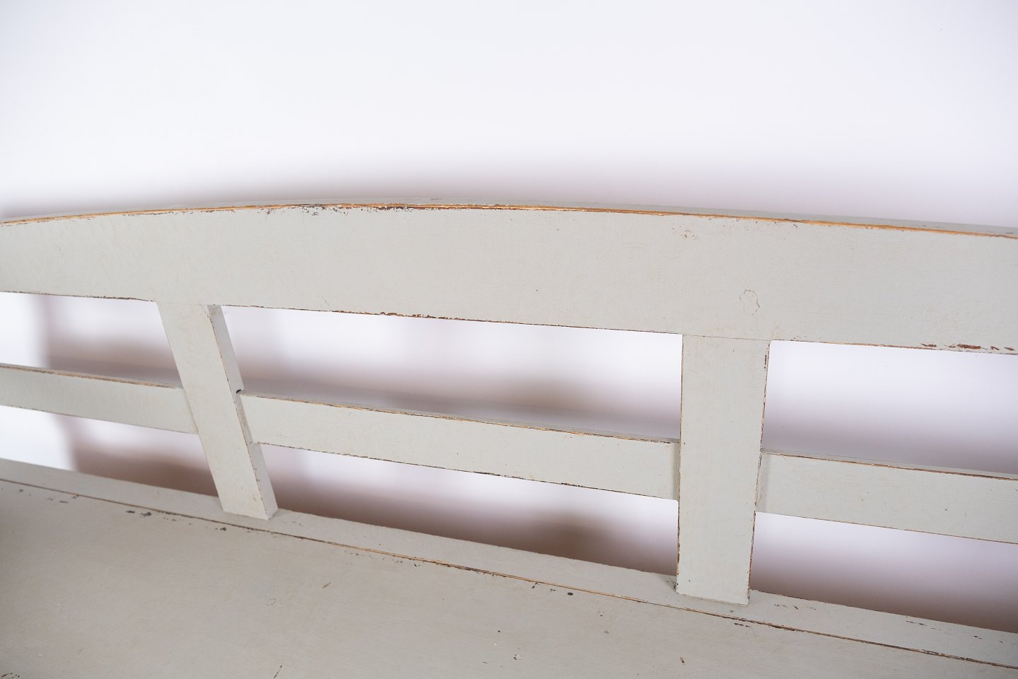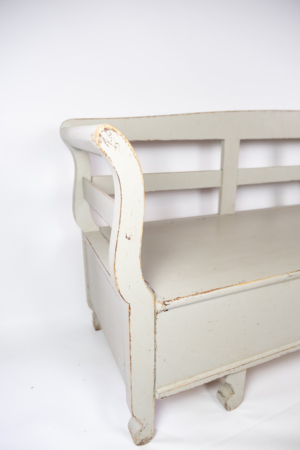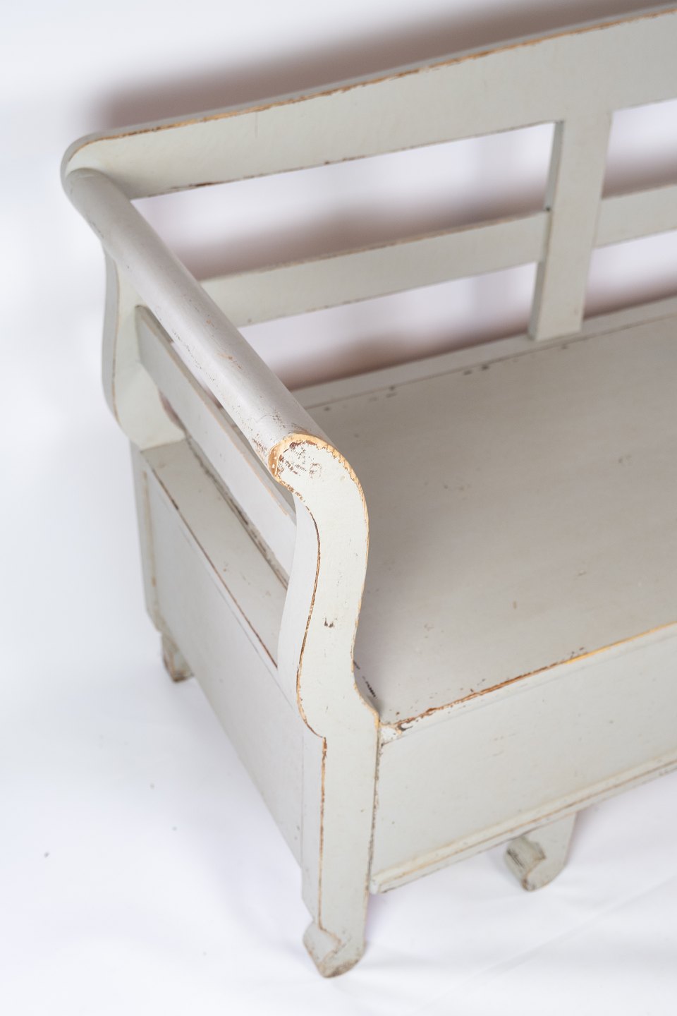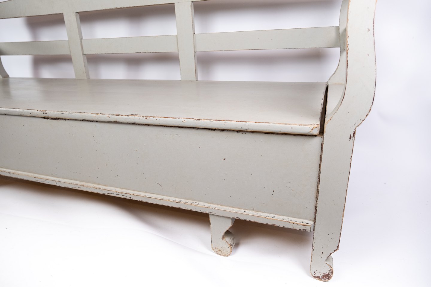 SolgtGråmalet gustaviansk slagbænk med opbevaring, i flot antik stand fra 1840erne.