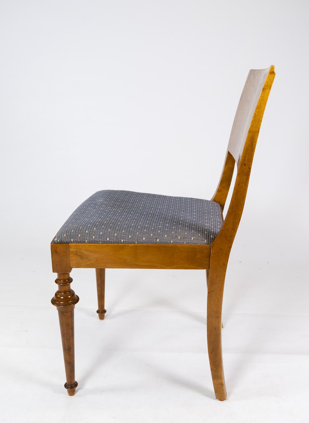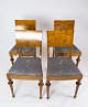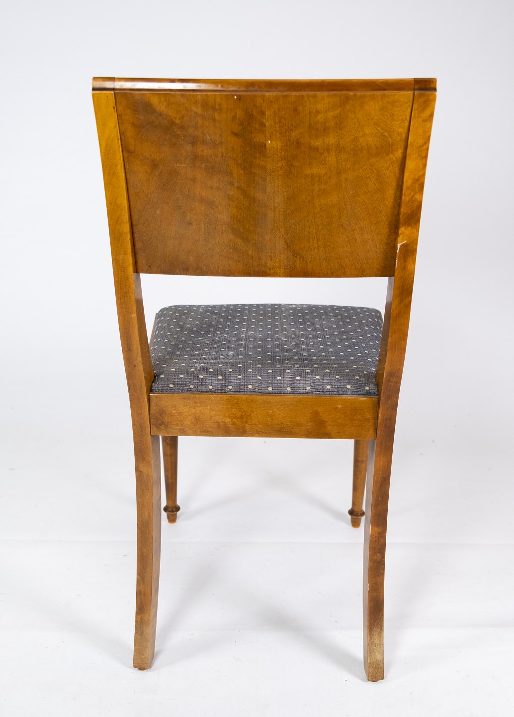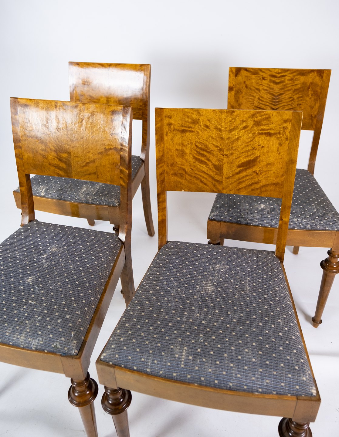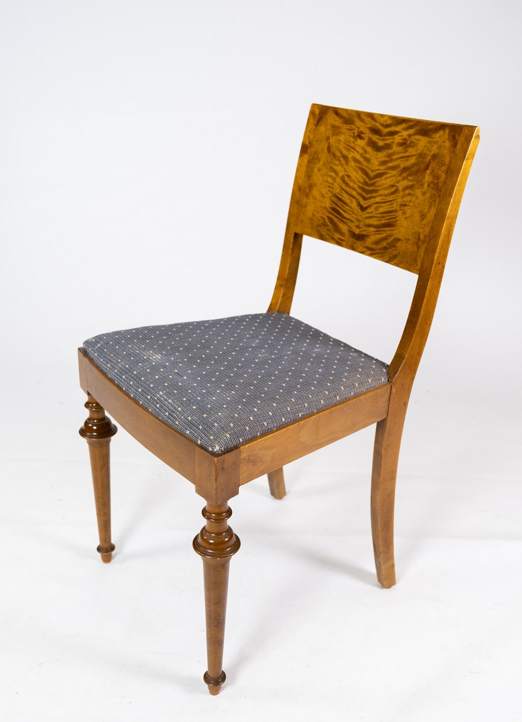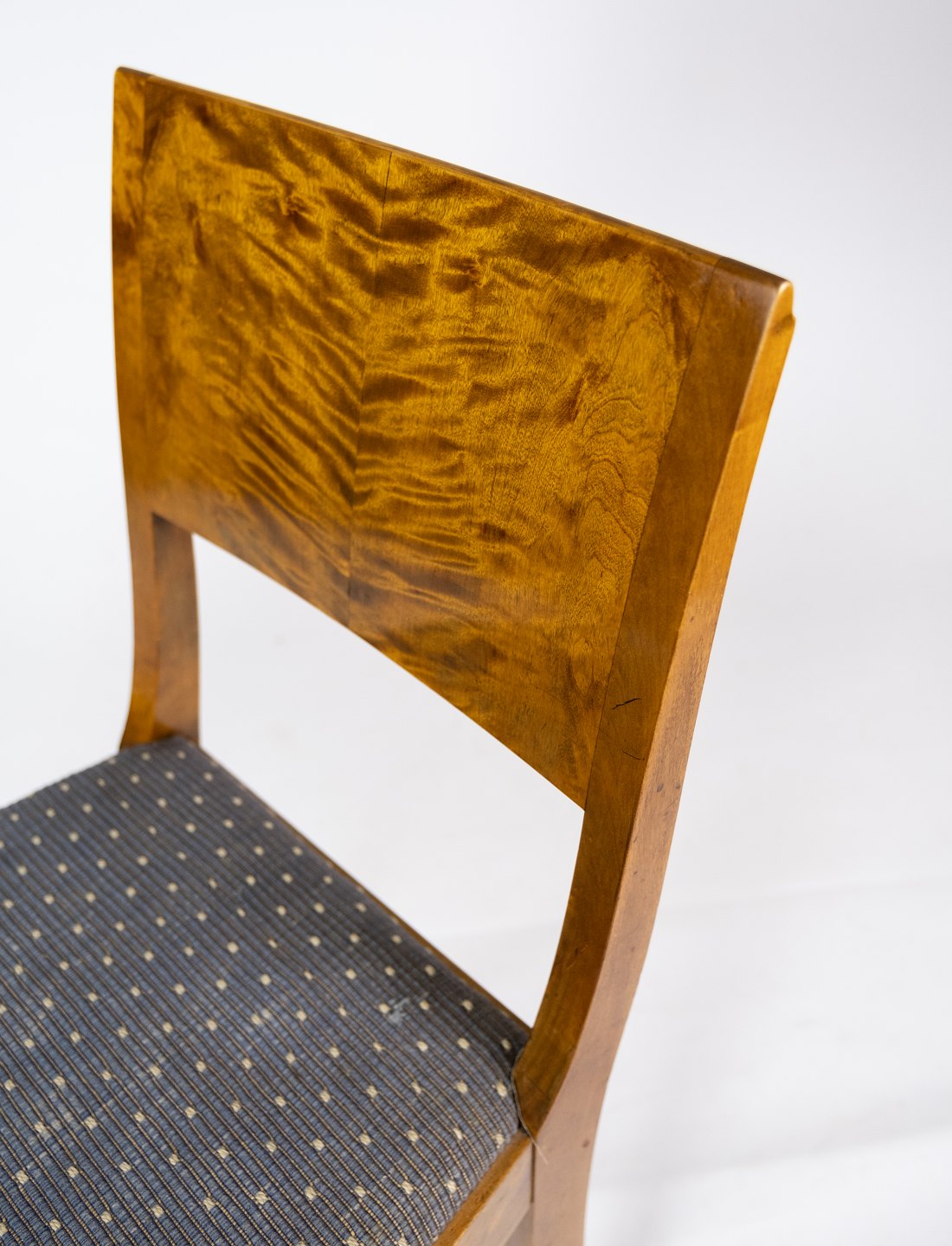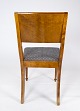 Set of 8 dining room chairs of birch and upholstered with blue fabric from the 1930s.
