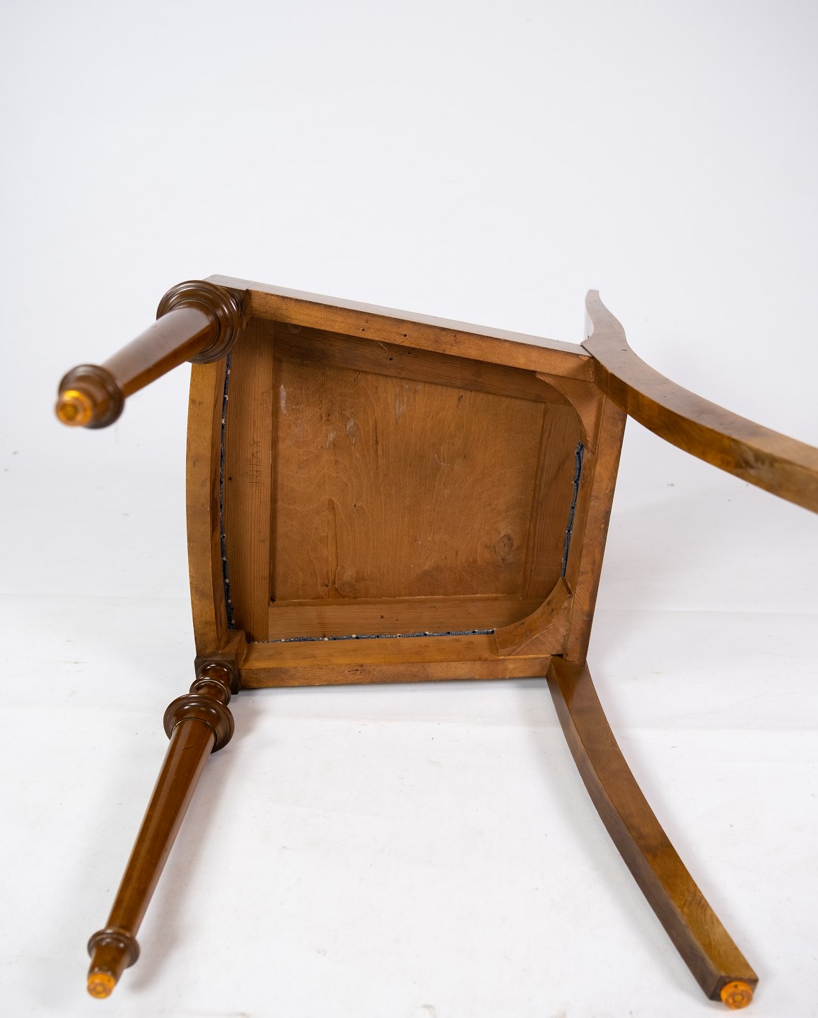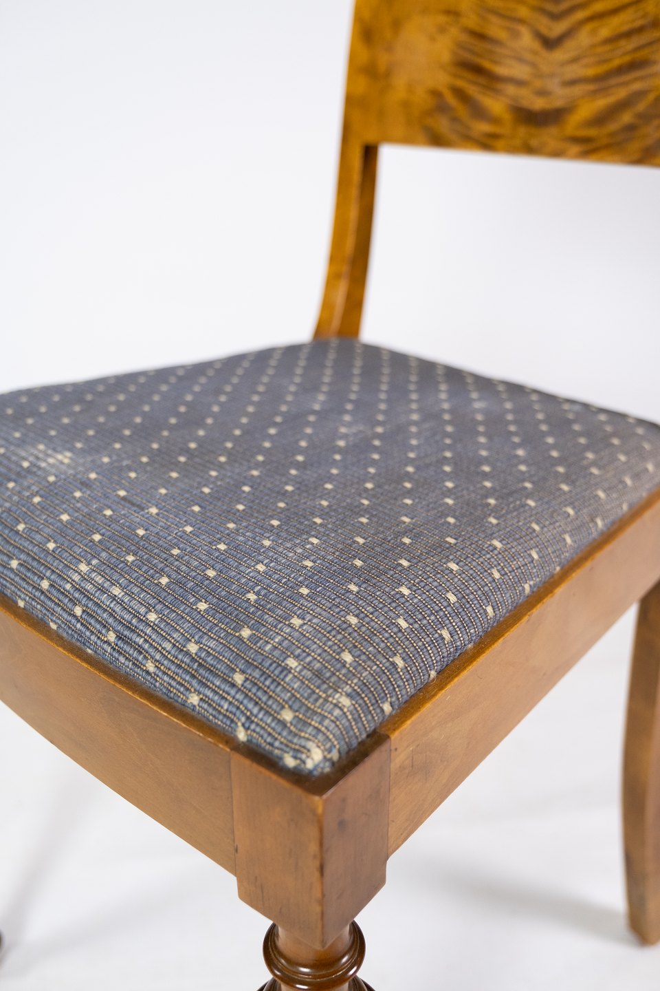 Set of 8 dining room chairs of birch and upholstered with blue fabric from the 1930s. The chairs are in great antique condition.