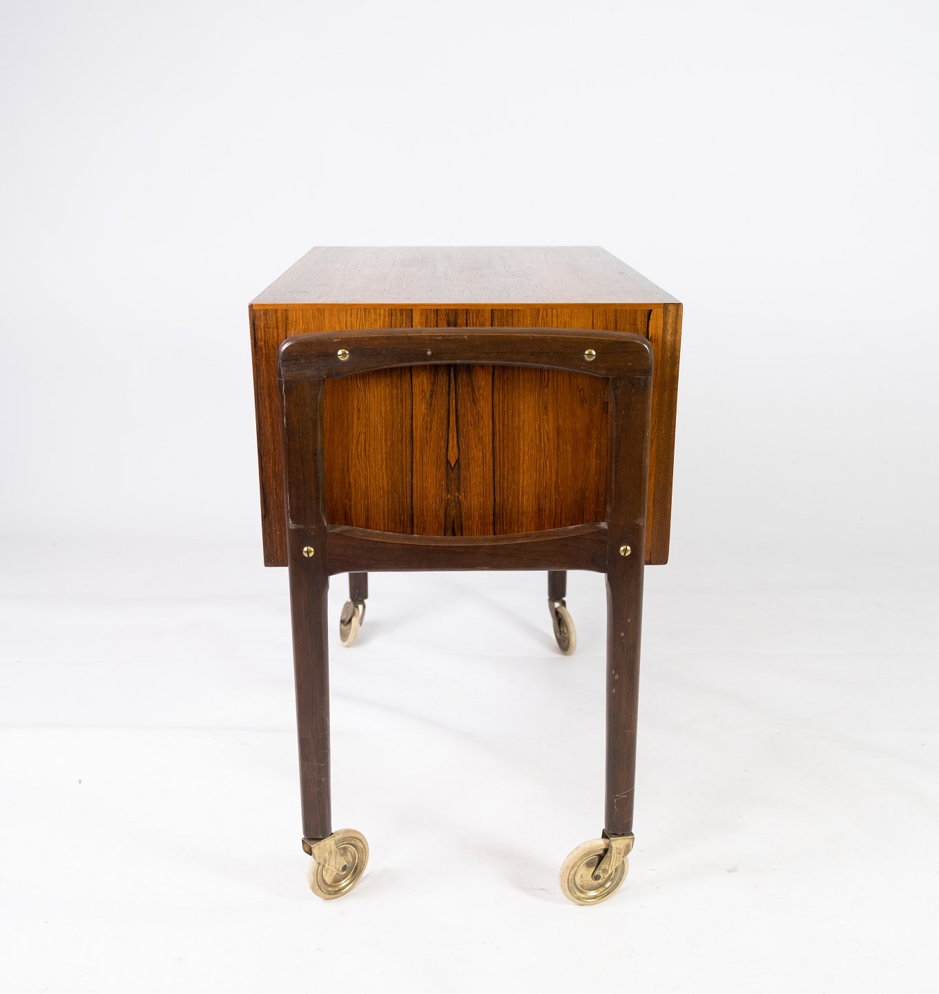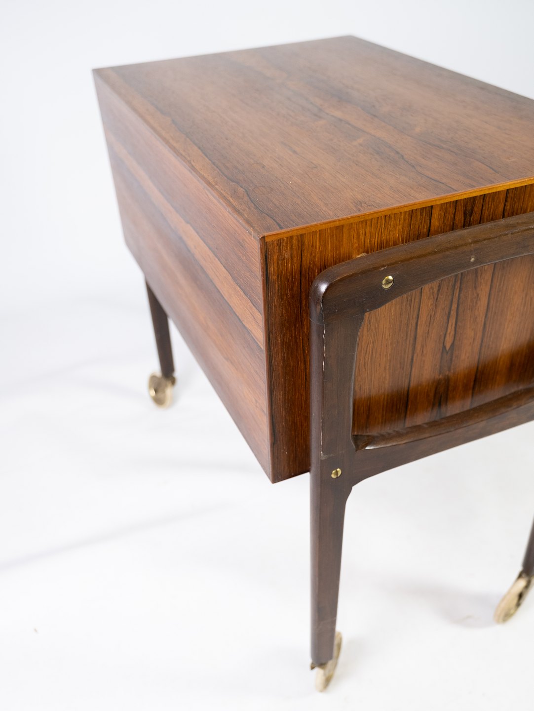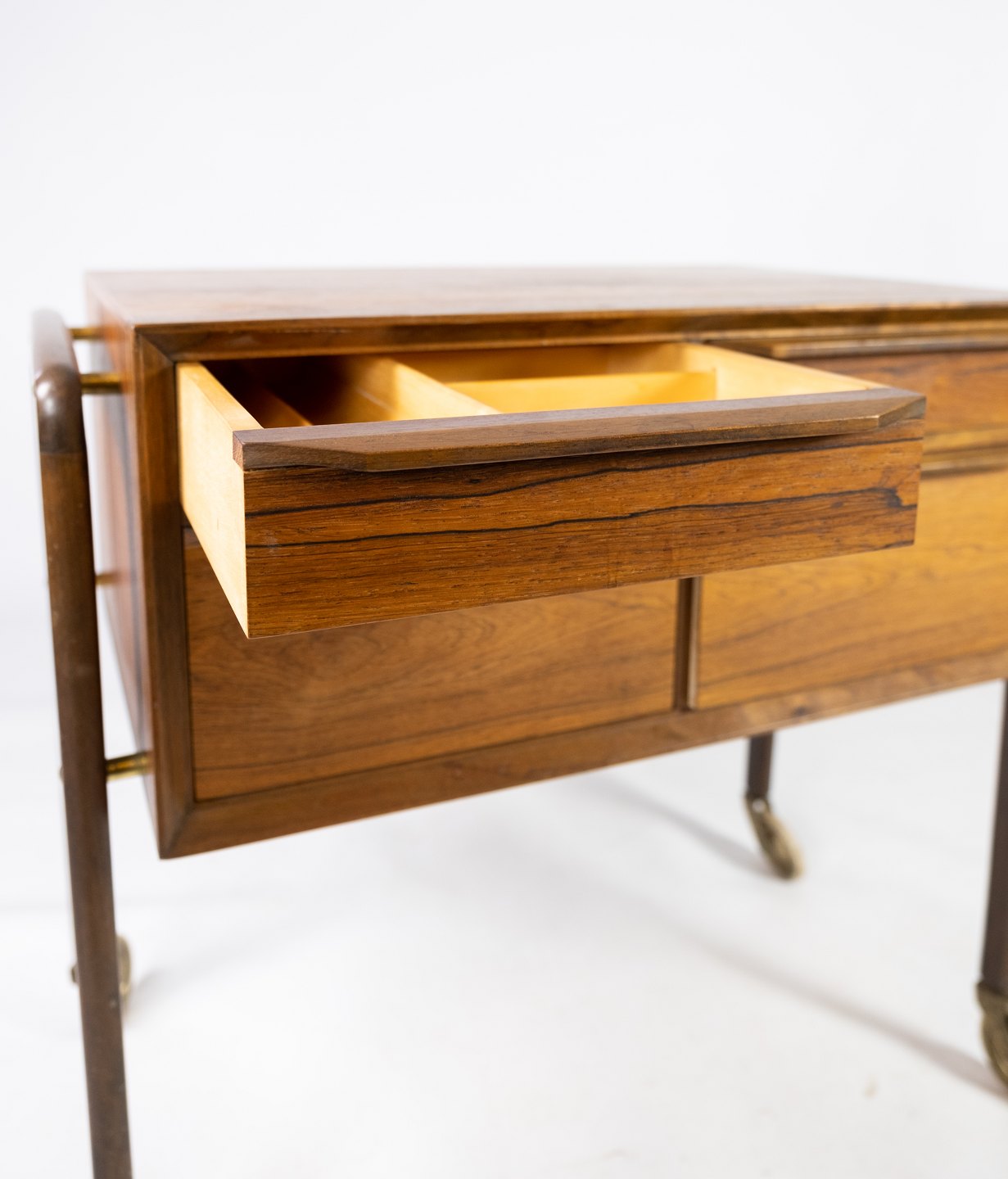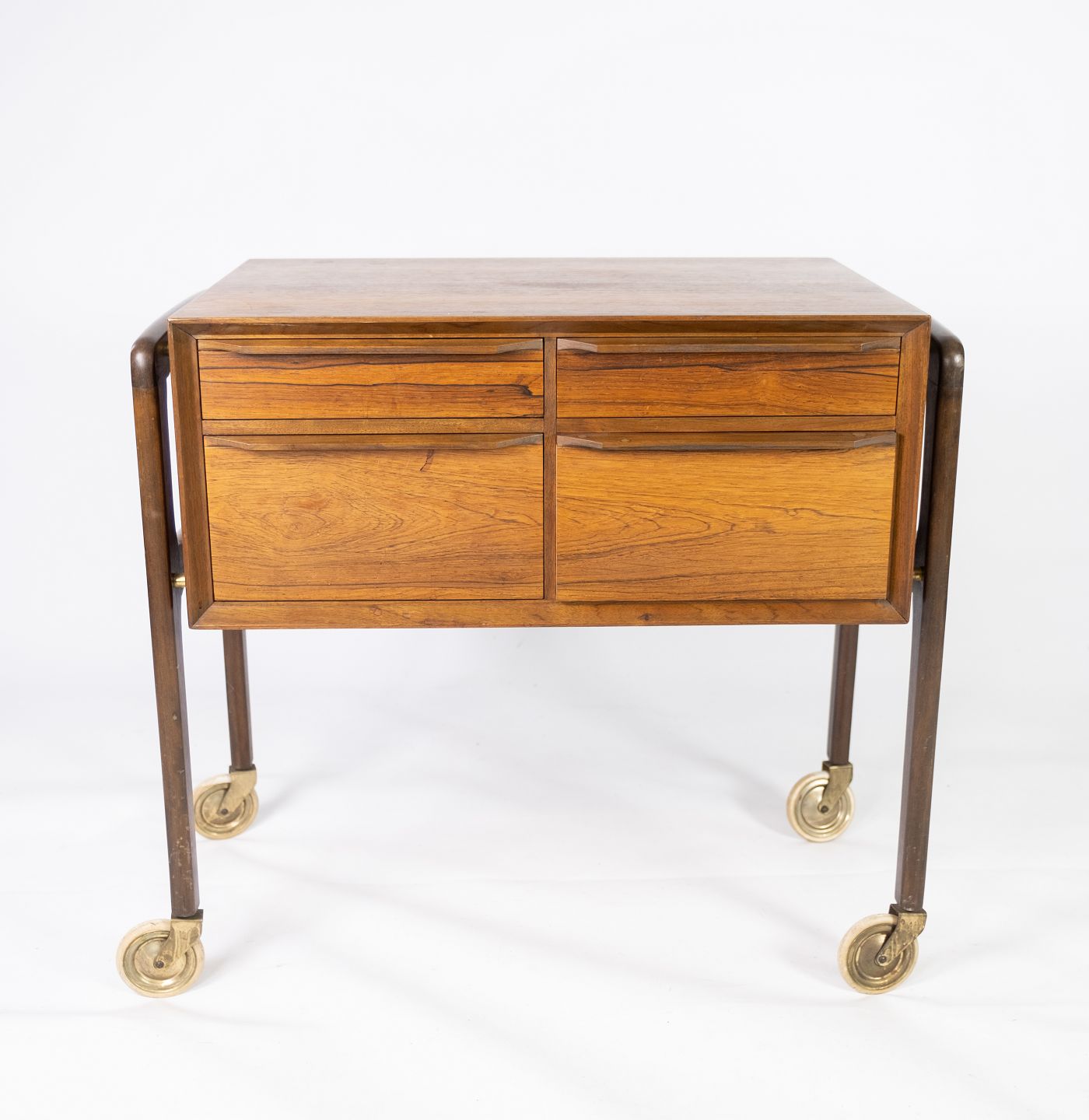 SoldThis small chest of drawers on wheels in rosewood, designed by Danish craftsmen in the 1960s, exudes a timeless elegance and functionality. The rosewood gives the chest of drawers a warm and deep color as well as a characteristic pattern structure that adds a touch of luxury to any room.