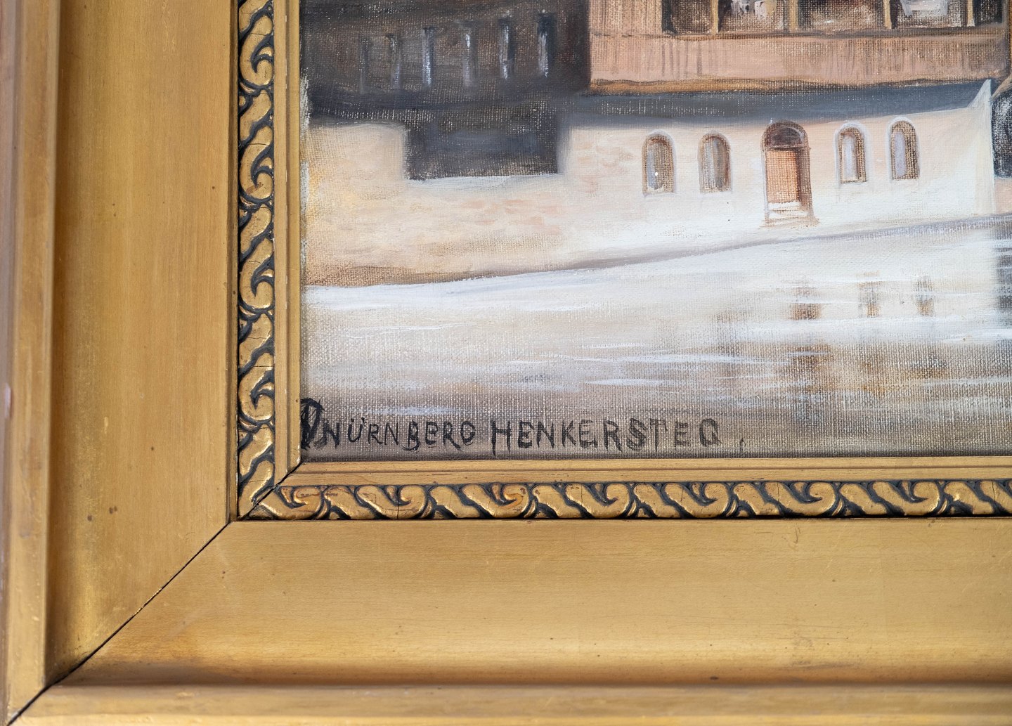 Oliemaleri med by motiv og forgyldt ramme, med ukendt signatur fra omkring 1910.