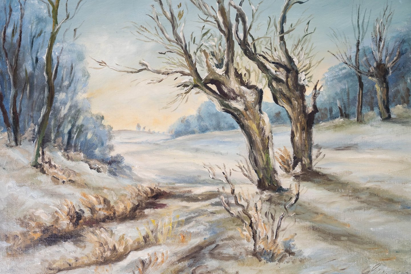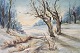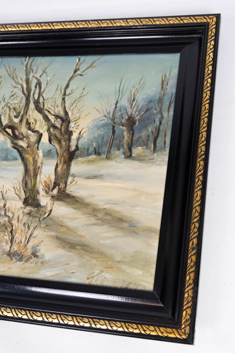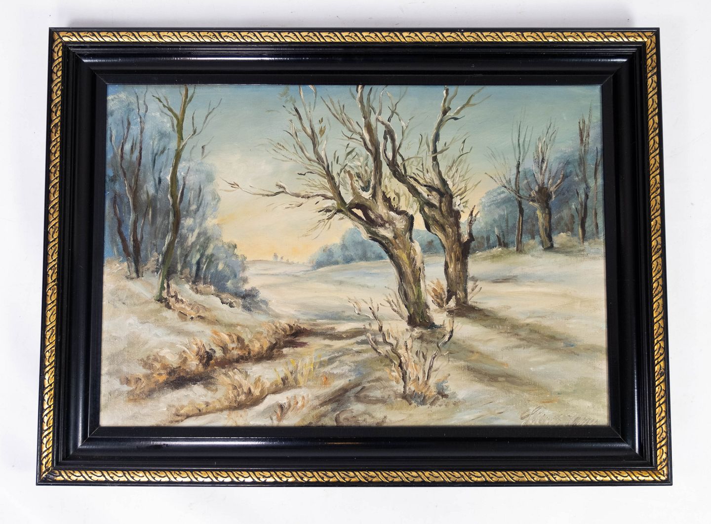 Oil painting with winter motif and black painted frame, with unknown signature from the 1920s.