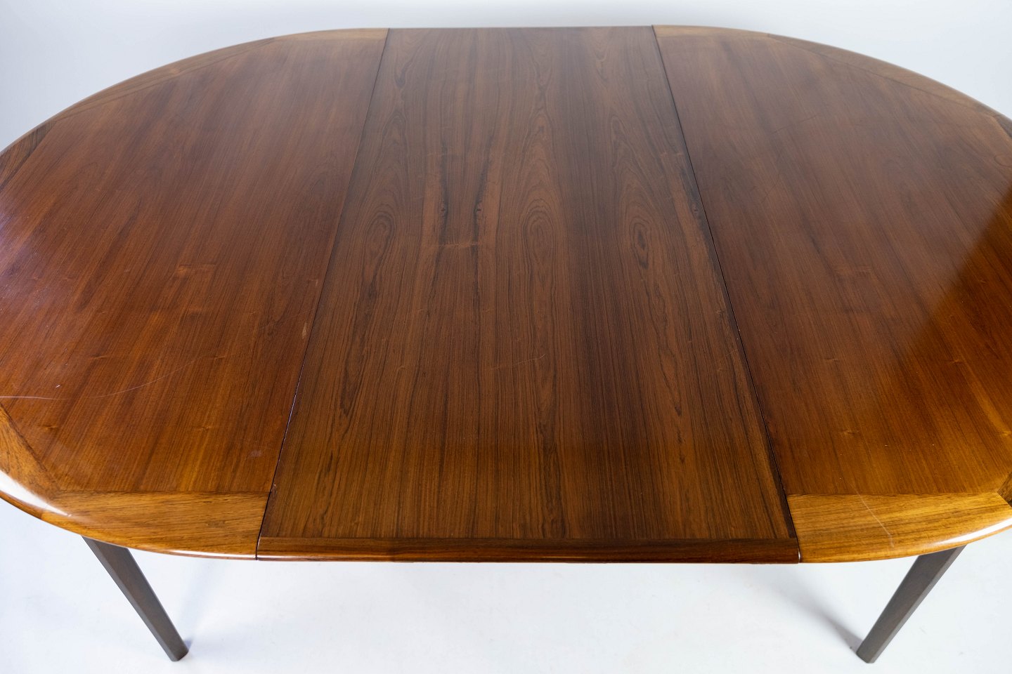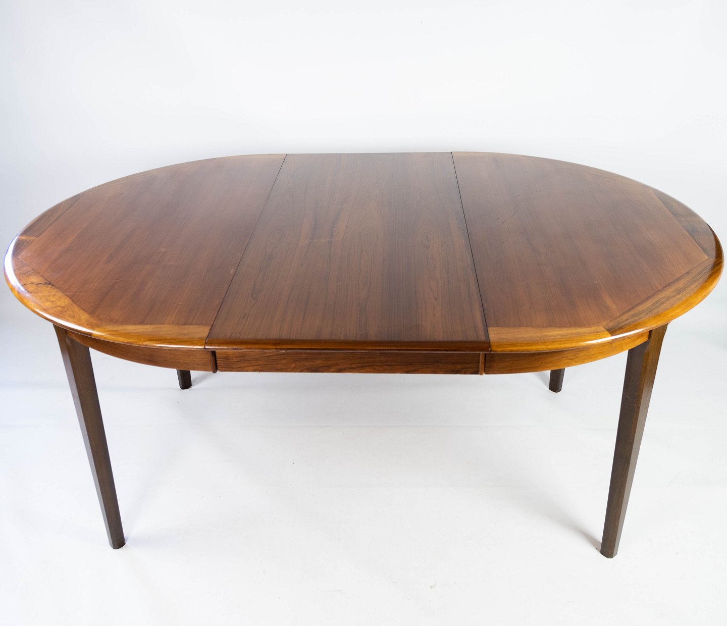 Dining table in rosewood with two extension plates, of danish design from the 1960s. The table is in great vintage condition.