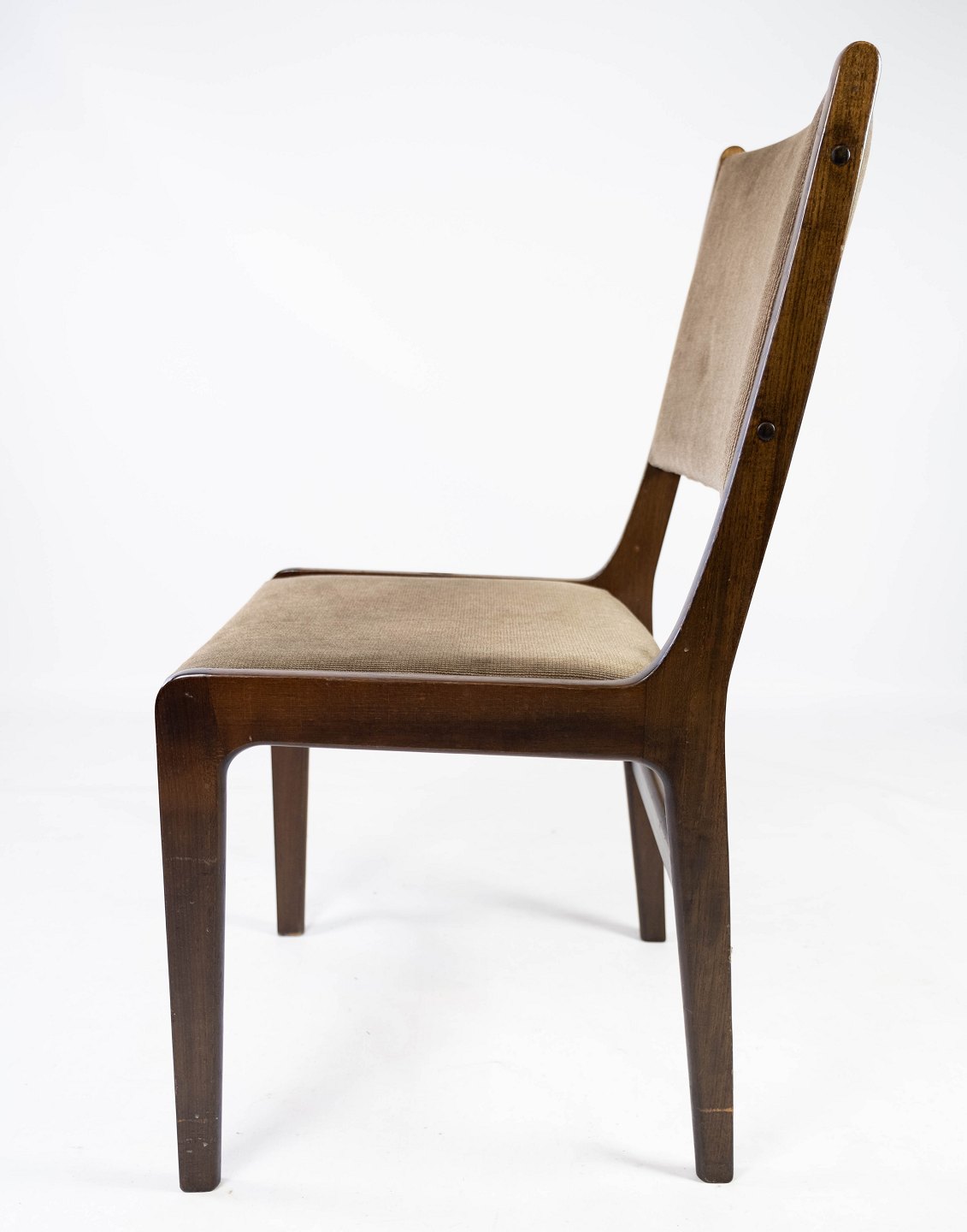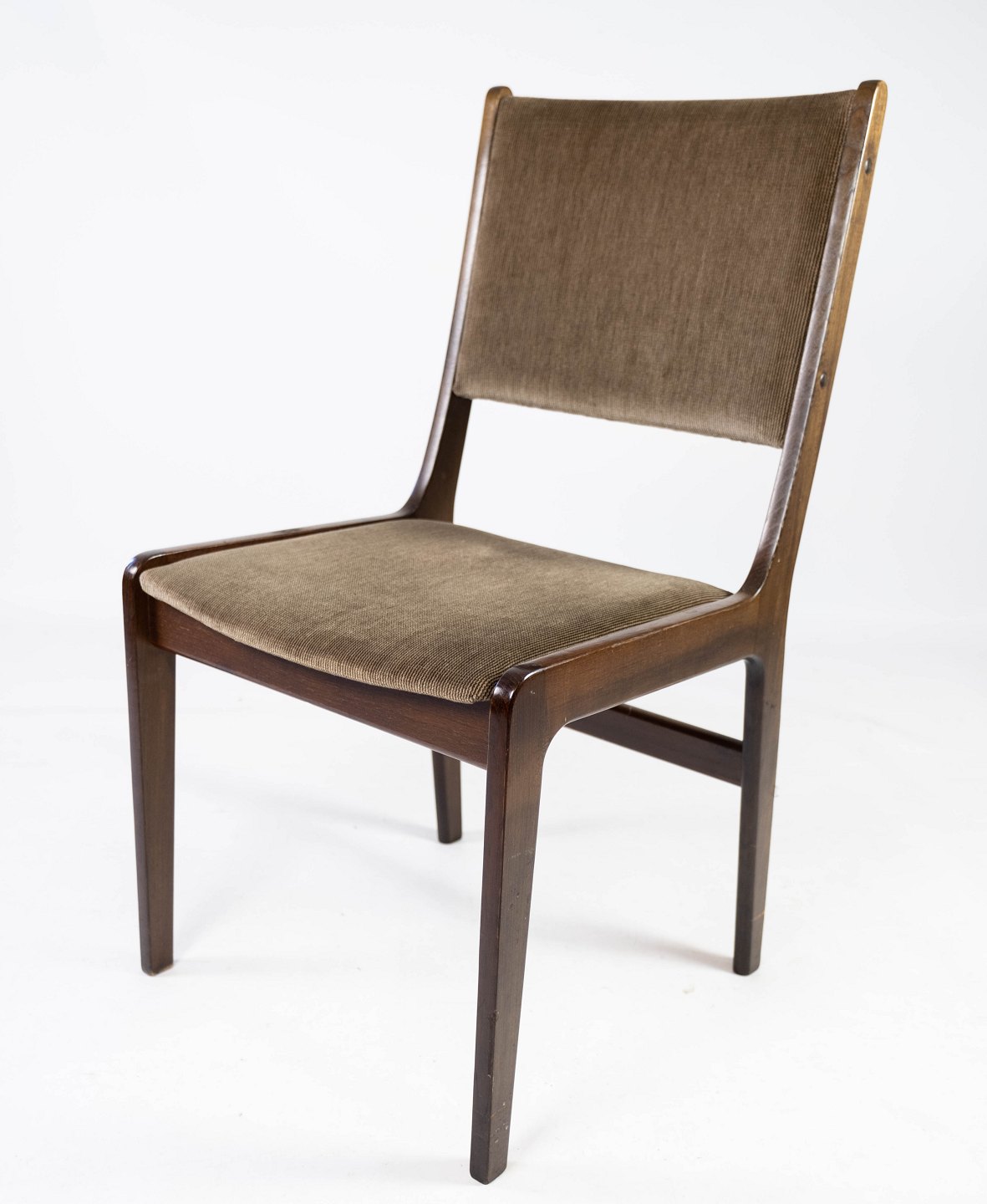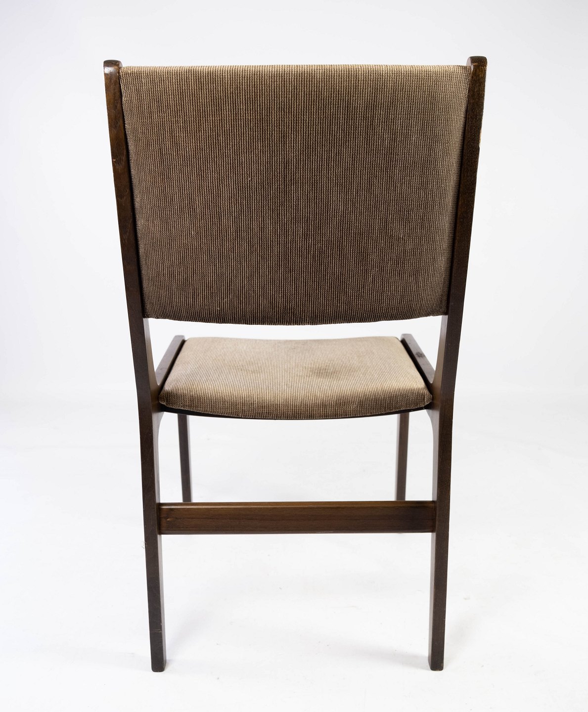 Sæt af fem spisestuestole I mørkt træ og mørkt stof af dansk design fremstillet af Farstrup i 1960erne.