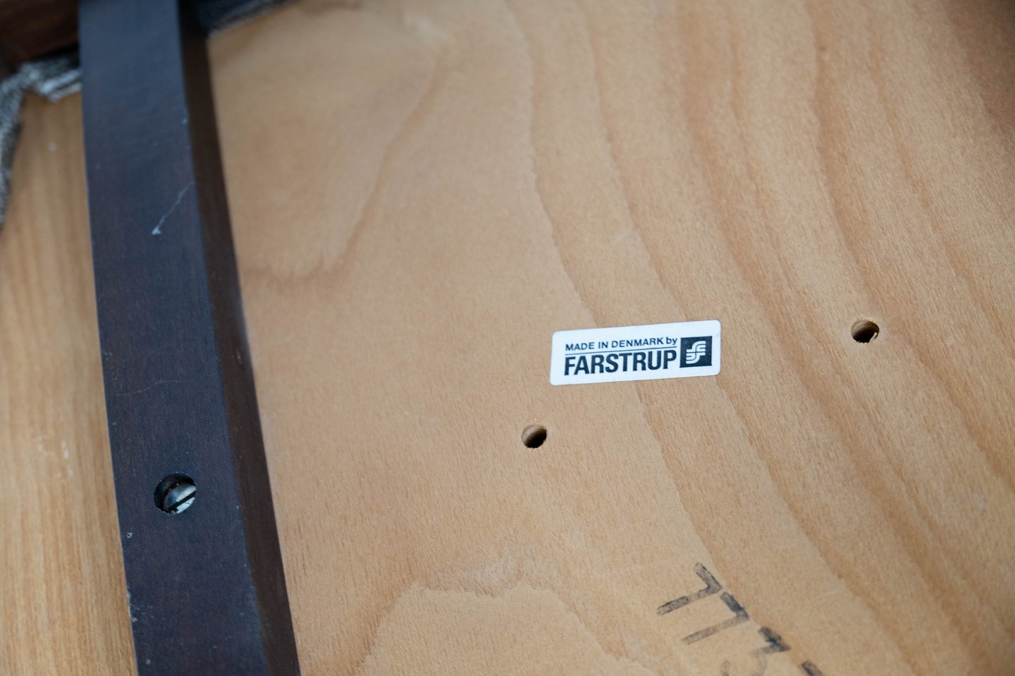 Sæt af fem spisestuestole I mørkt træ og mørkt stof af dansk design fremstillet af Farstrup i 1960erne. Stolene er i flot brugt stand.