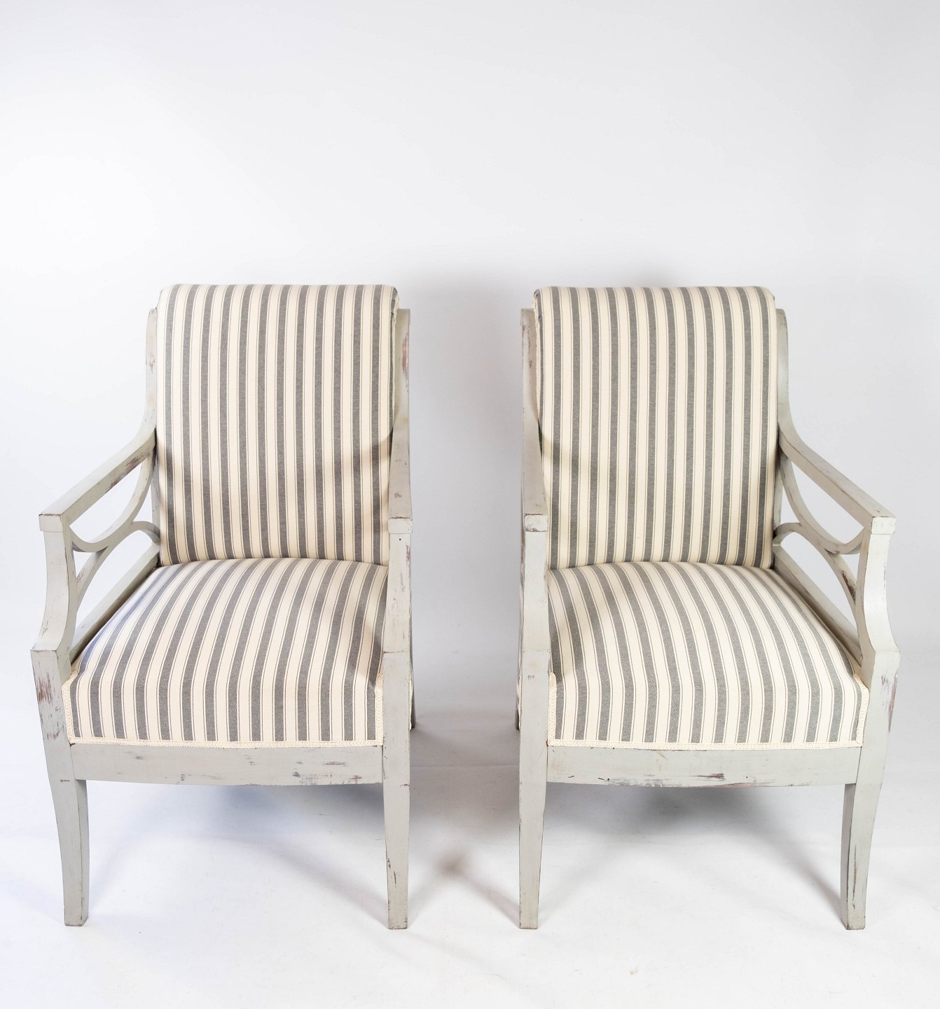 Sættet af to gustavianske armstole fra cirka 1810 fremstår med en smuk patina, der tilføjer karakter og historie til deres udseende. Stolene er udført i gråmalet træ, hvilket giver dem et tidløst og elegant udtryk, typisk for periodens stil.