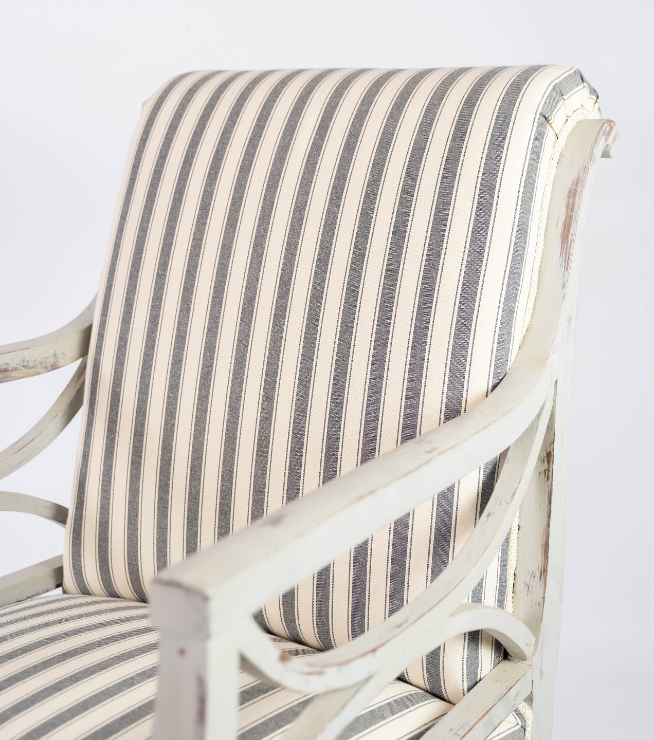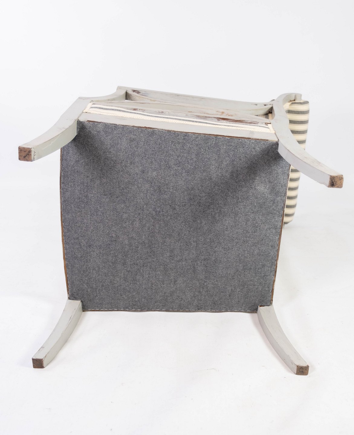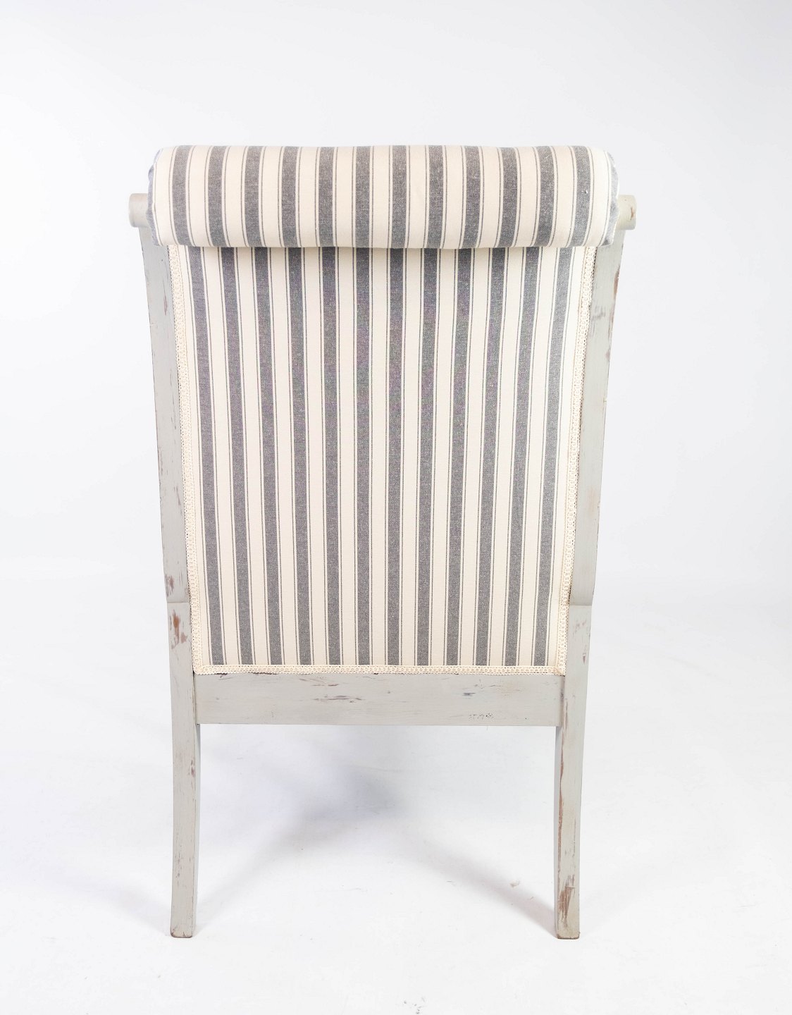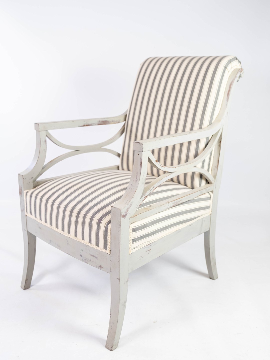 De er blevet nyligt polstret i et lyst stribet stof, der harmonerer smukt med det antikke design og tilføjer en fornemmelse af luksus og komfort. Disse armstole er ikke blot møbler, men også en kærkommen tilføjelse til enhver antiksamling, der beriger rummet med deres historie og æstetiske appel.