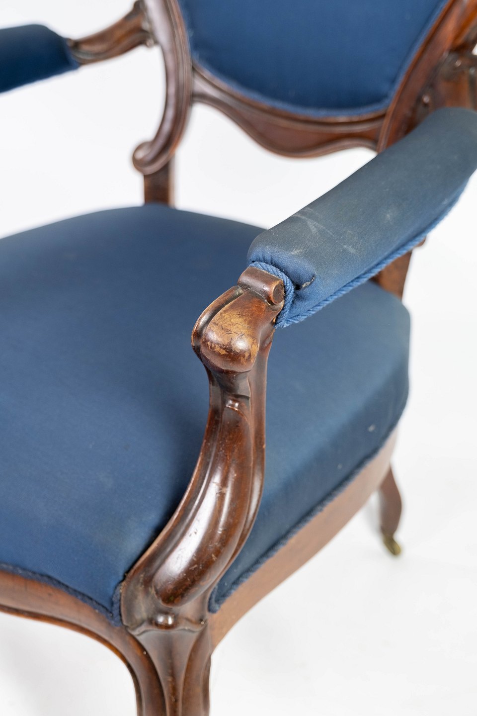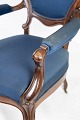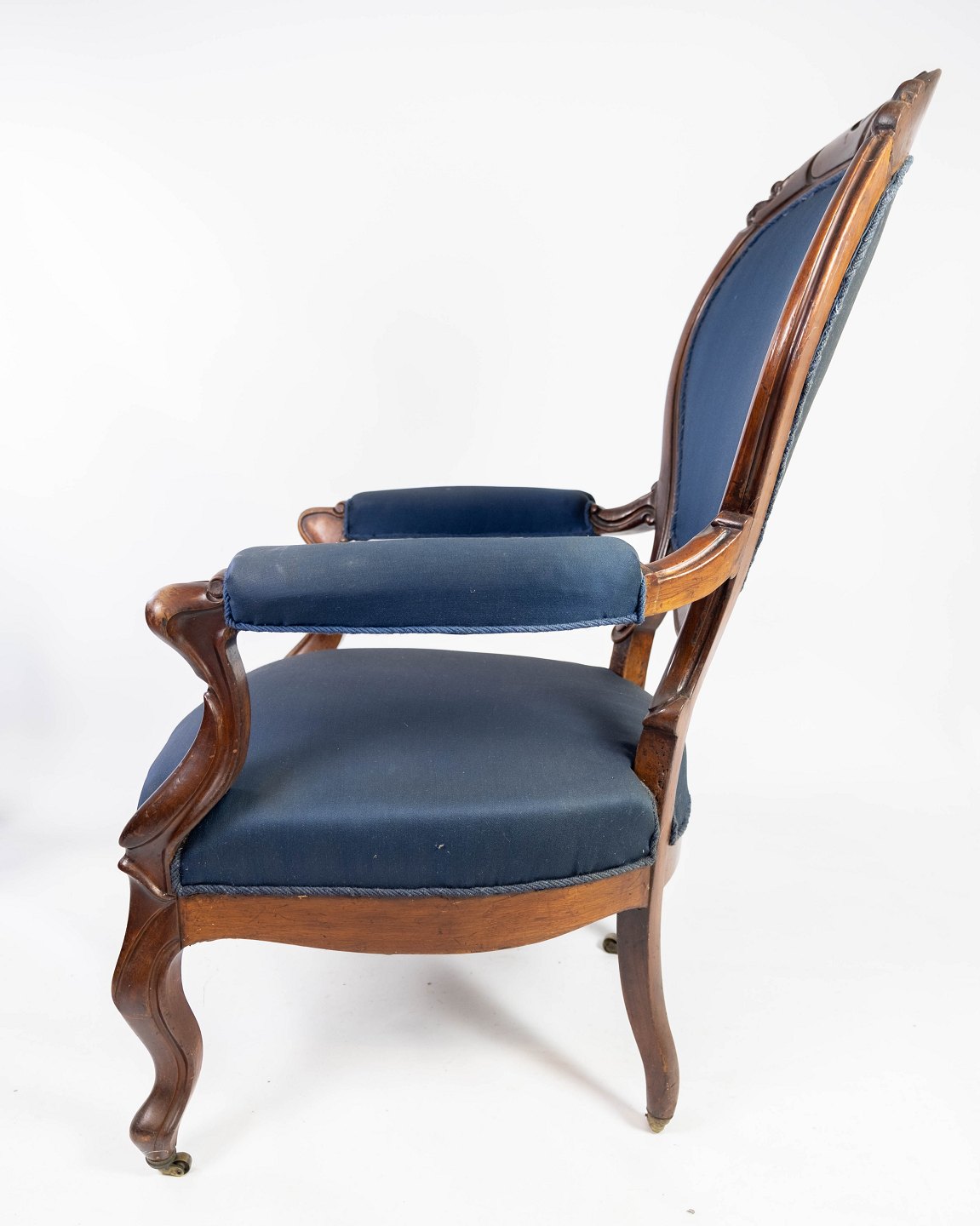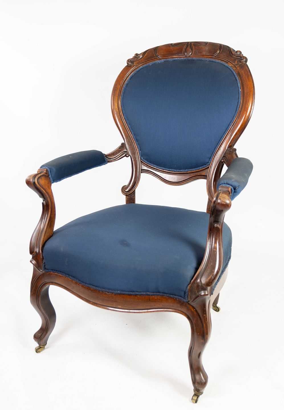 Antik armstol af mahogni og polstret med blåt stof fra 1880. Stolen er i flot brugt stand og med hjul.