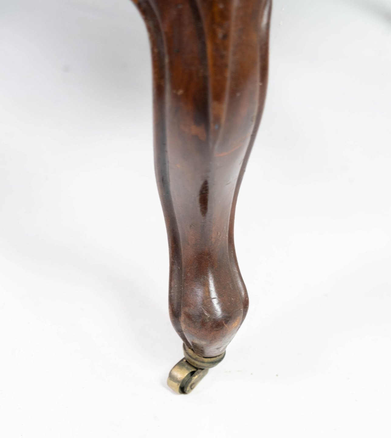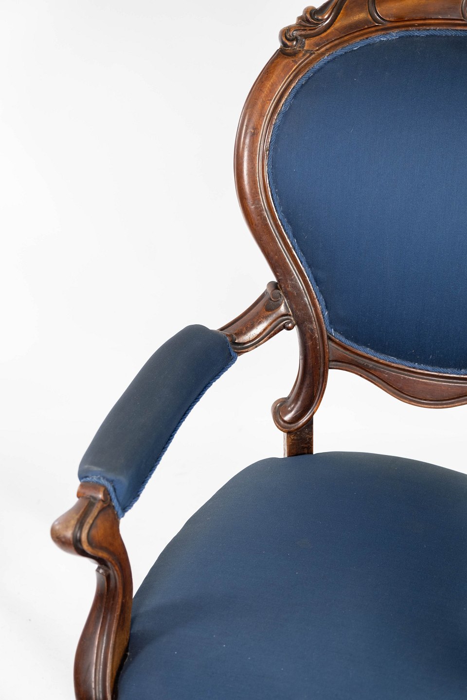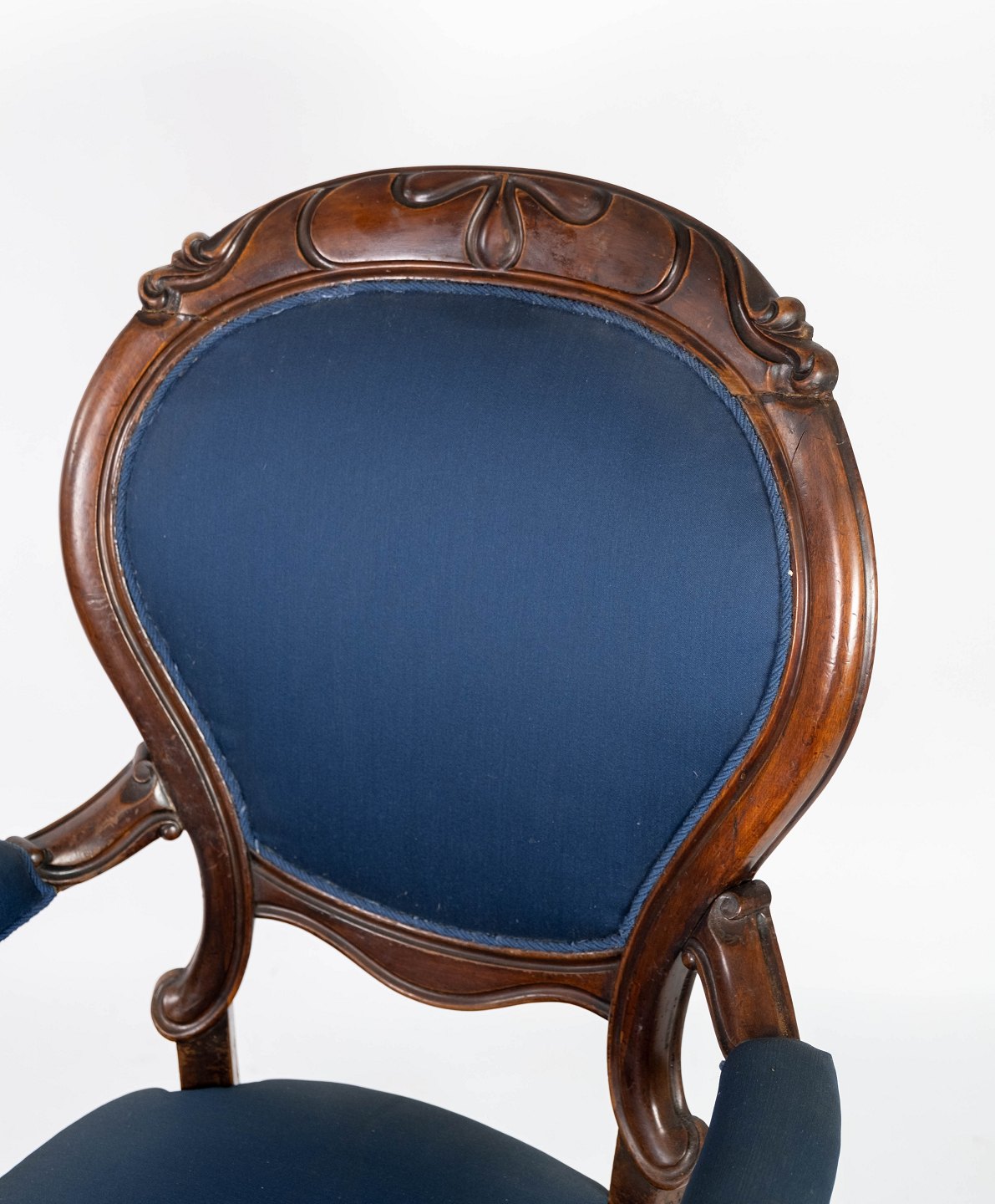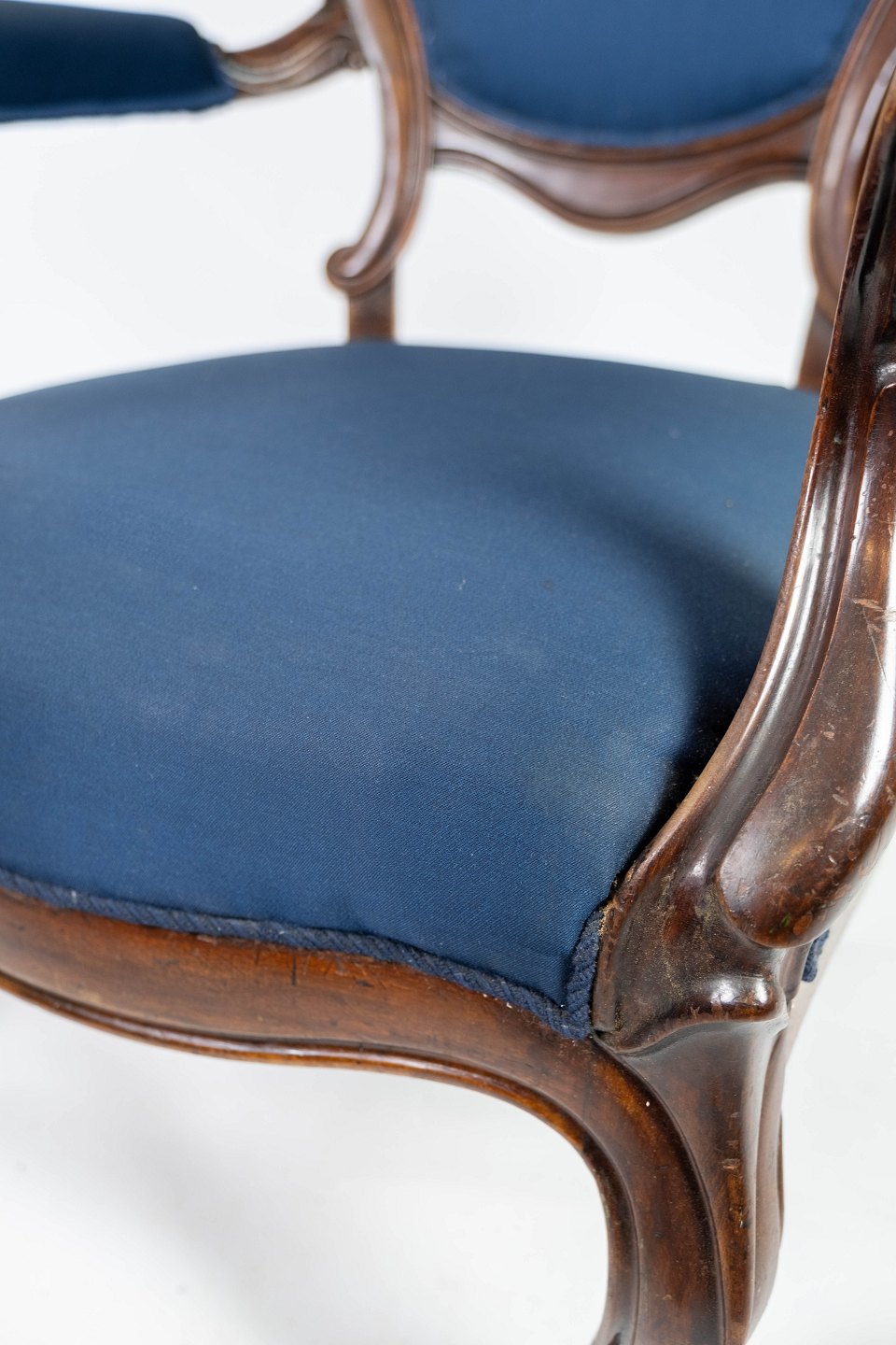 Antik armstol af mahogni og polstret med blåt stof fra 1880. Stolen er i flot brugt stand og med hjul.
