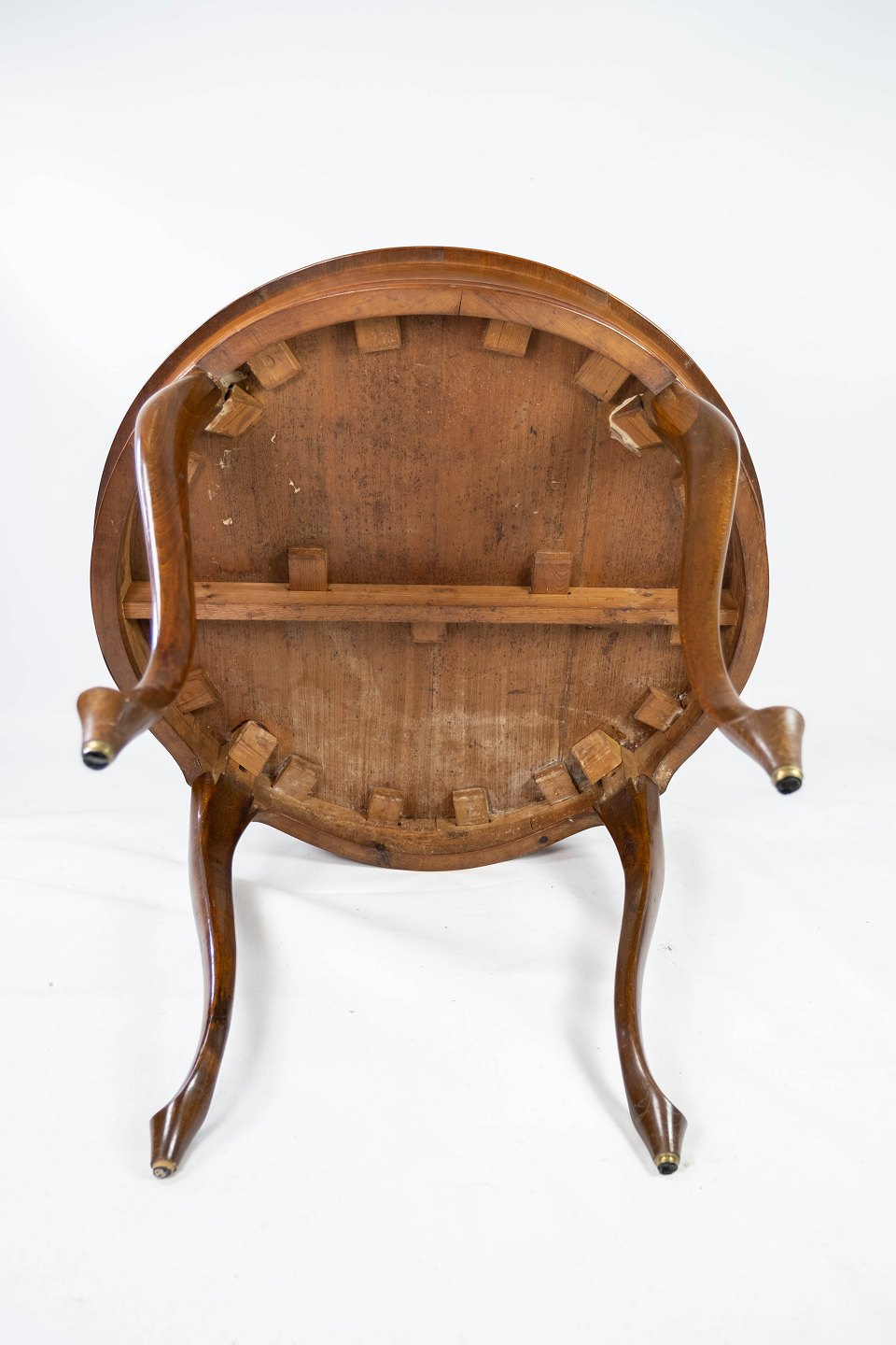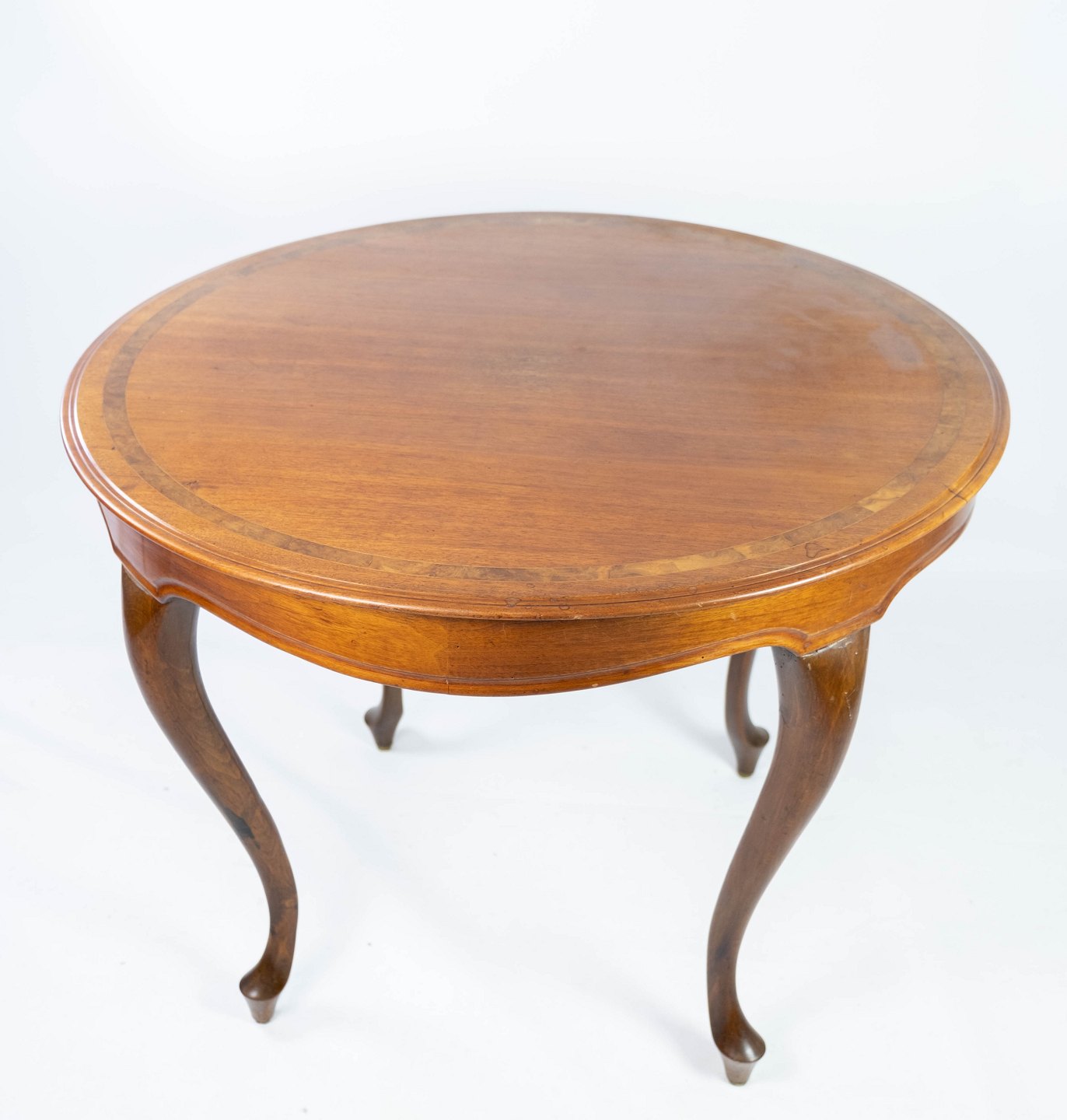 Rundt spisebord af mahogni med intarsia af valnød, i flot brugt stand fra 1880.