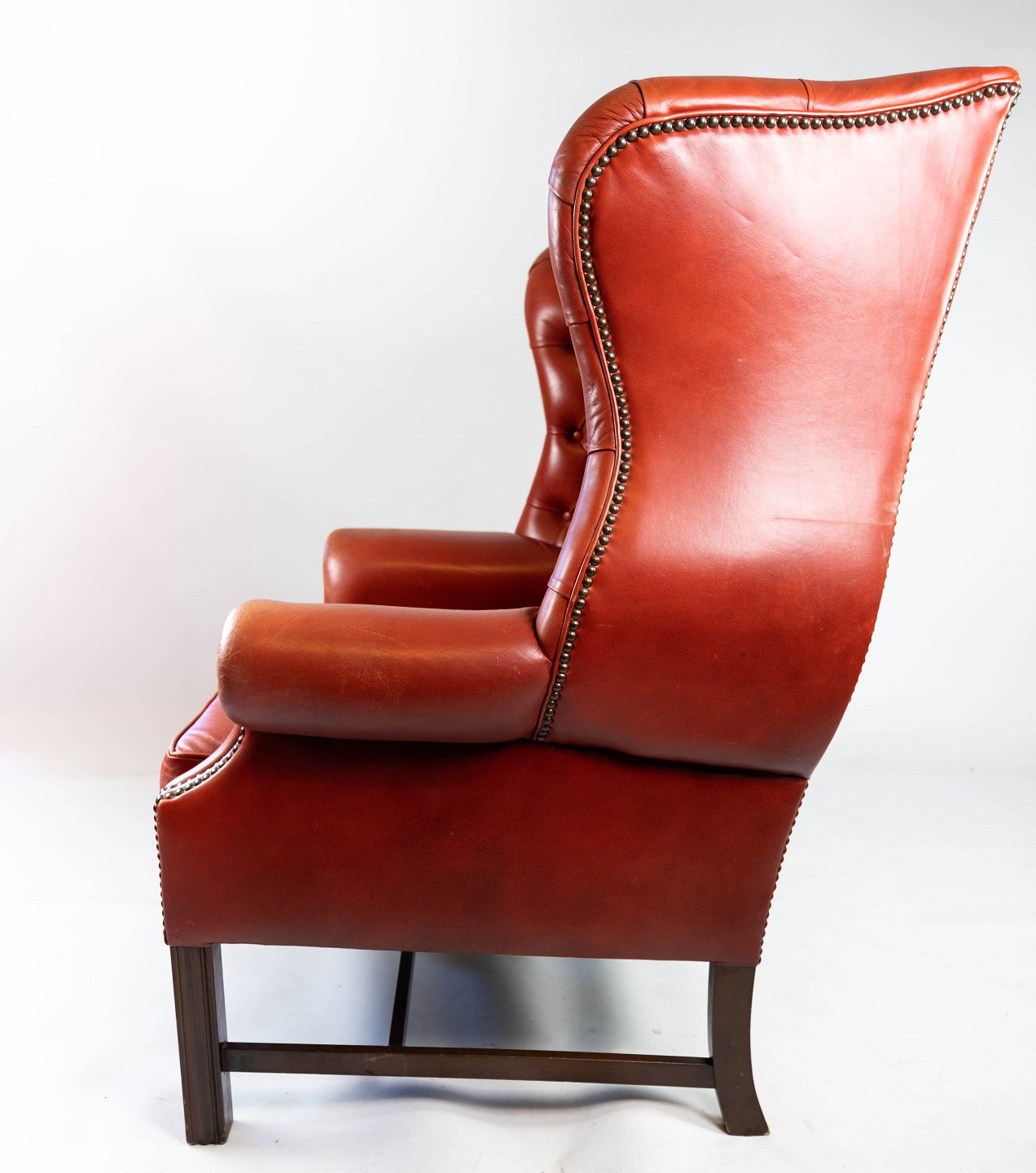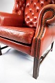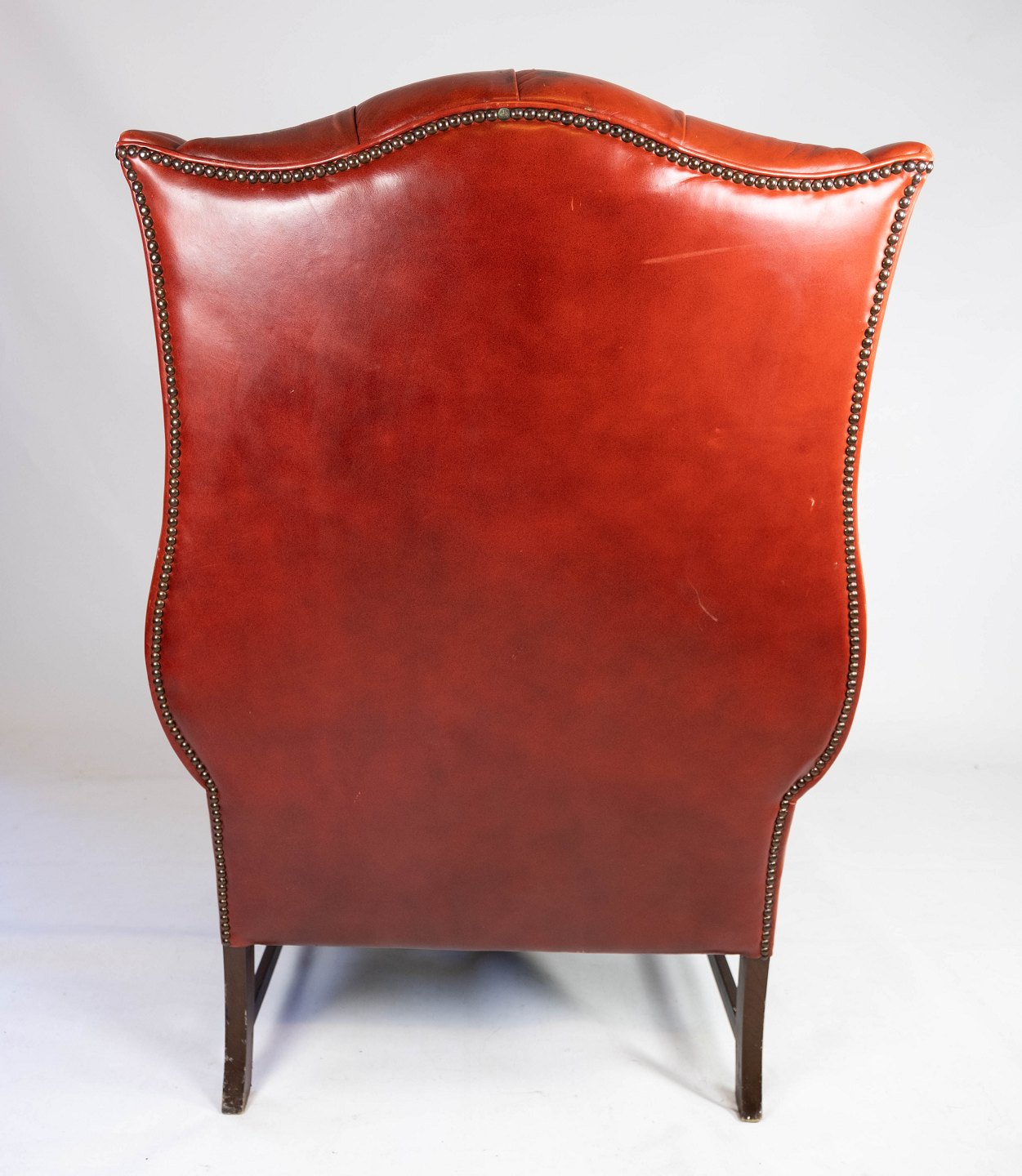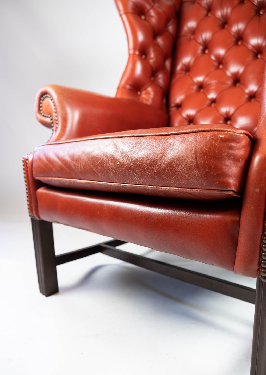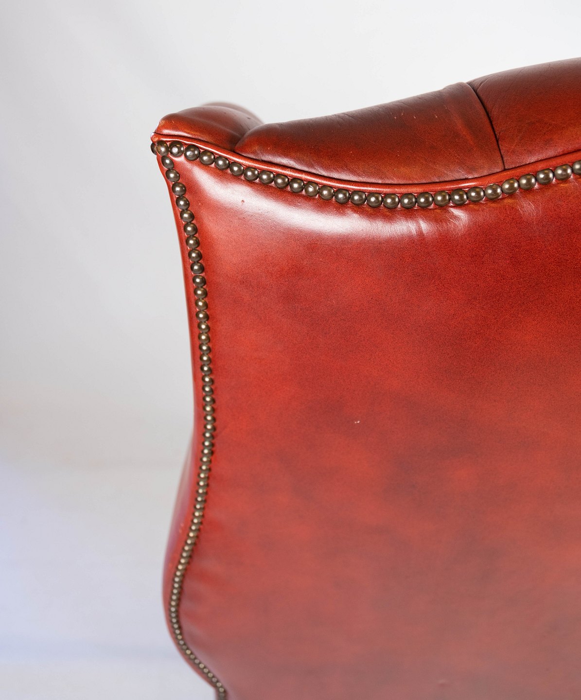 Chesterfield easy chair and stool upholstered with red leather and with legs of mahogany. The set is in great vintage condition.