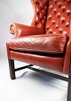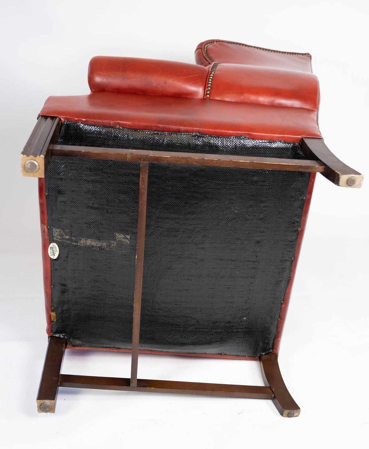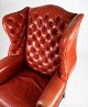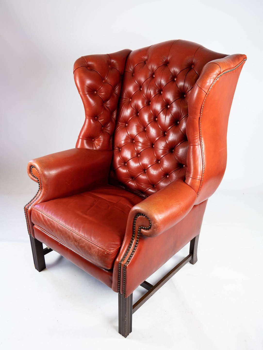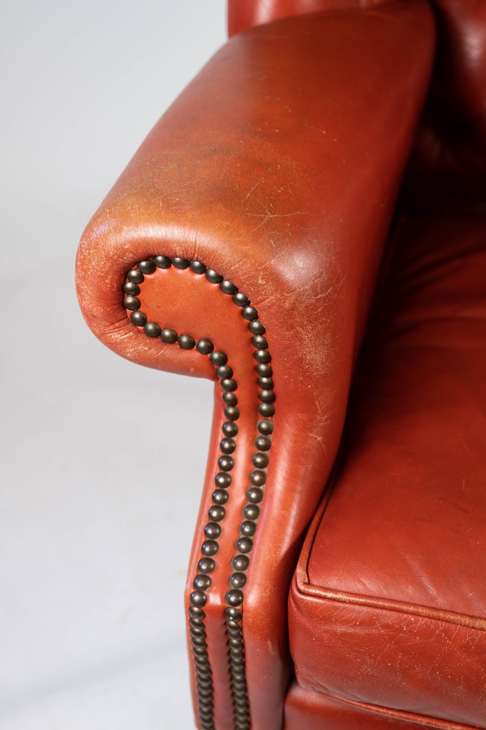 Chesterfield easy chair and stool upholstered with red leather and with legs of mahogany. The set is in great vintage condition.
