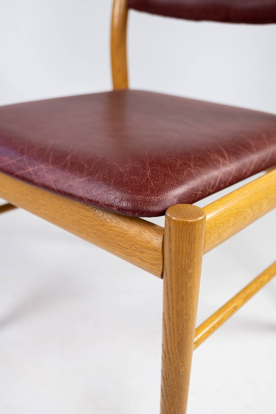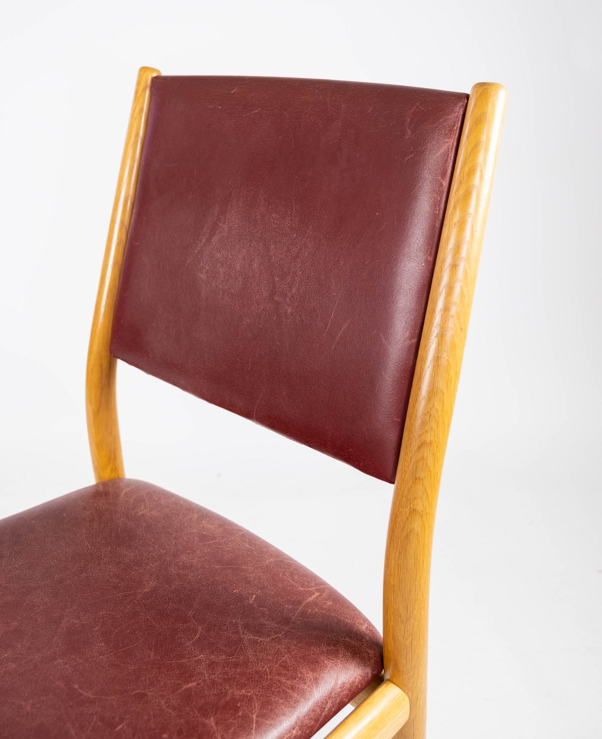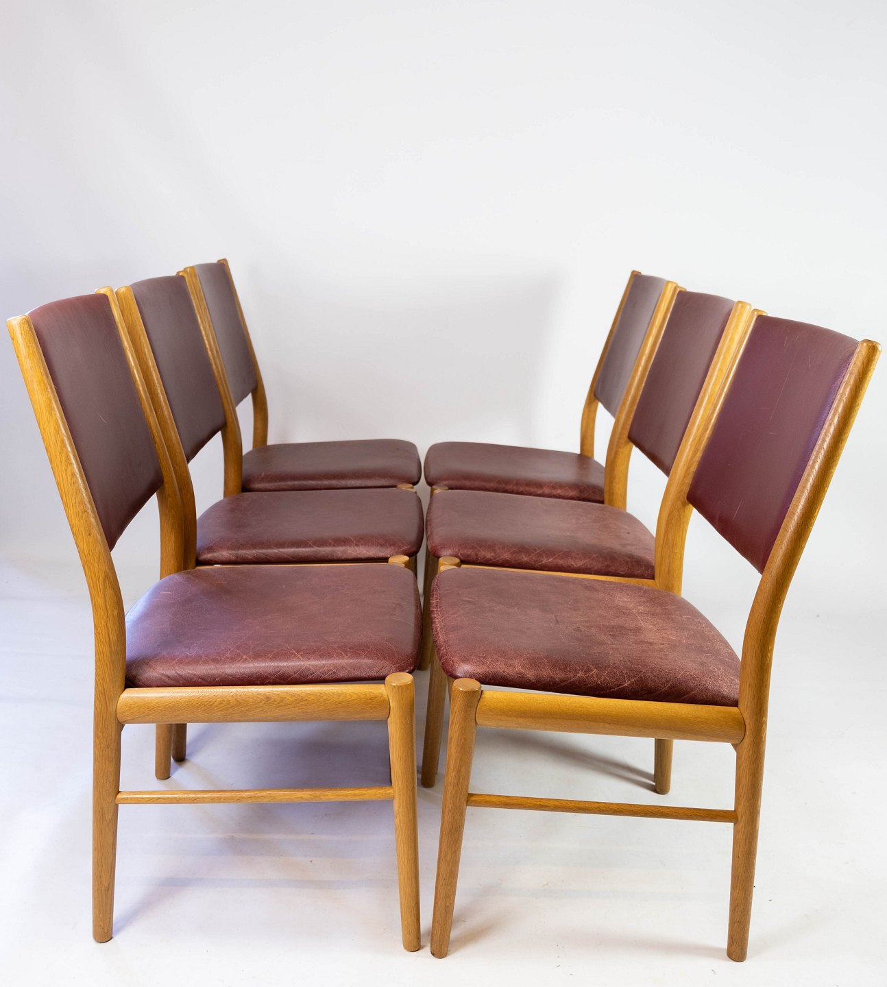 SoldSet of six dining room chairs of oak and upholstered with bordeaux leather, of danish design from the 1960s.