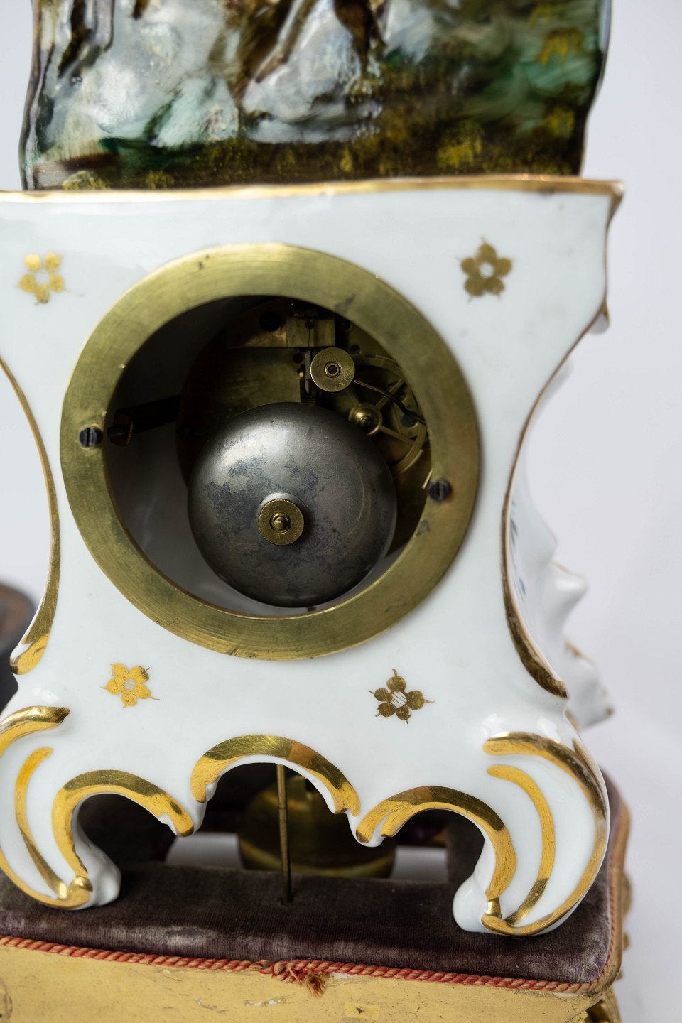 French table clock with glass dome and decorated with figure of porcelain from 1860. The clock is in great vintage condition.