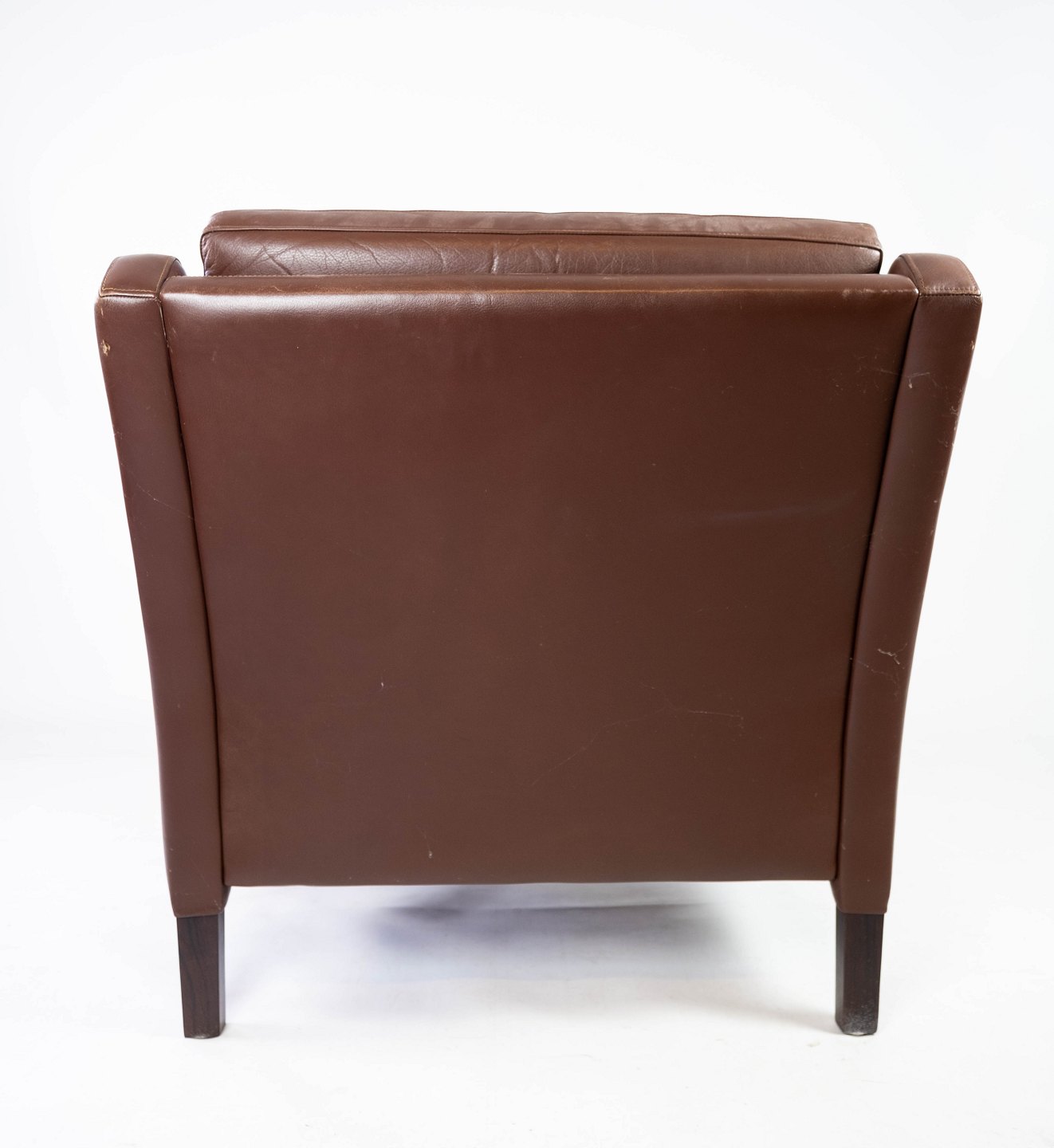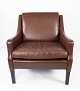 Easy chair upholstered with dark brown leather and legs of dark wood, of danish design from the 1960s. The chair is in great vintage condition.