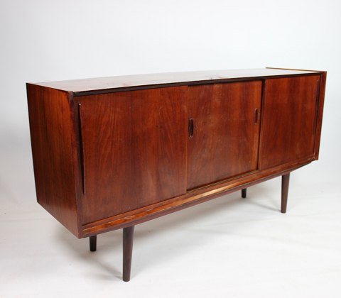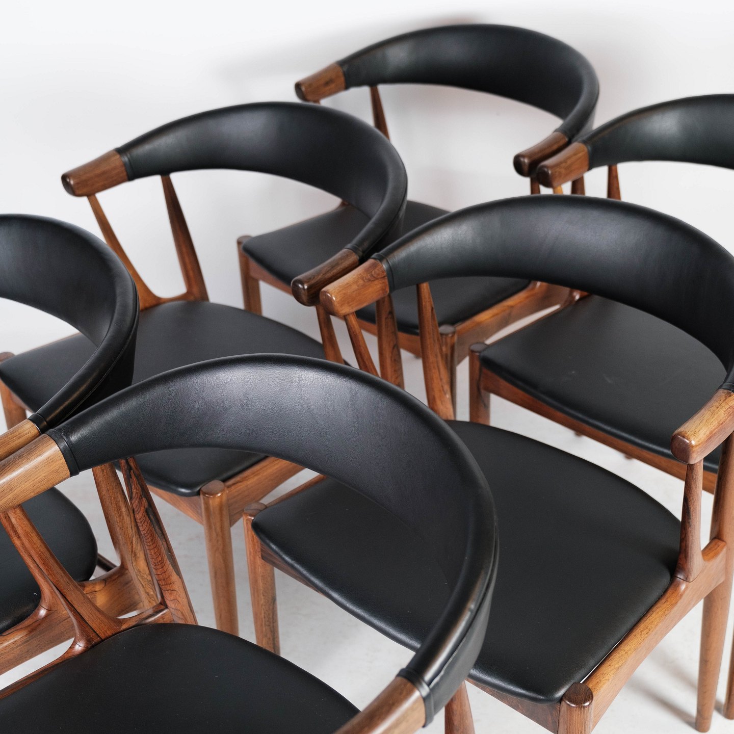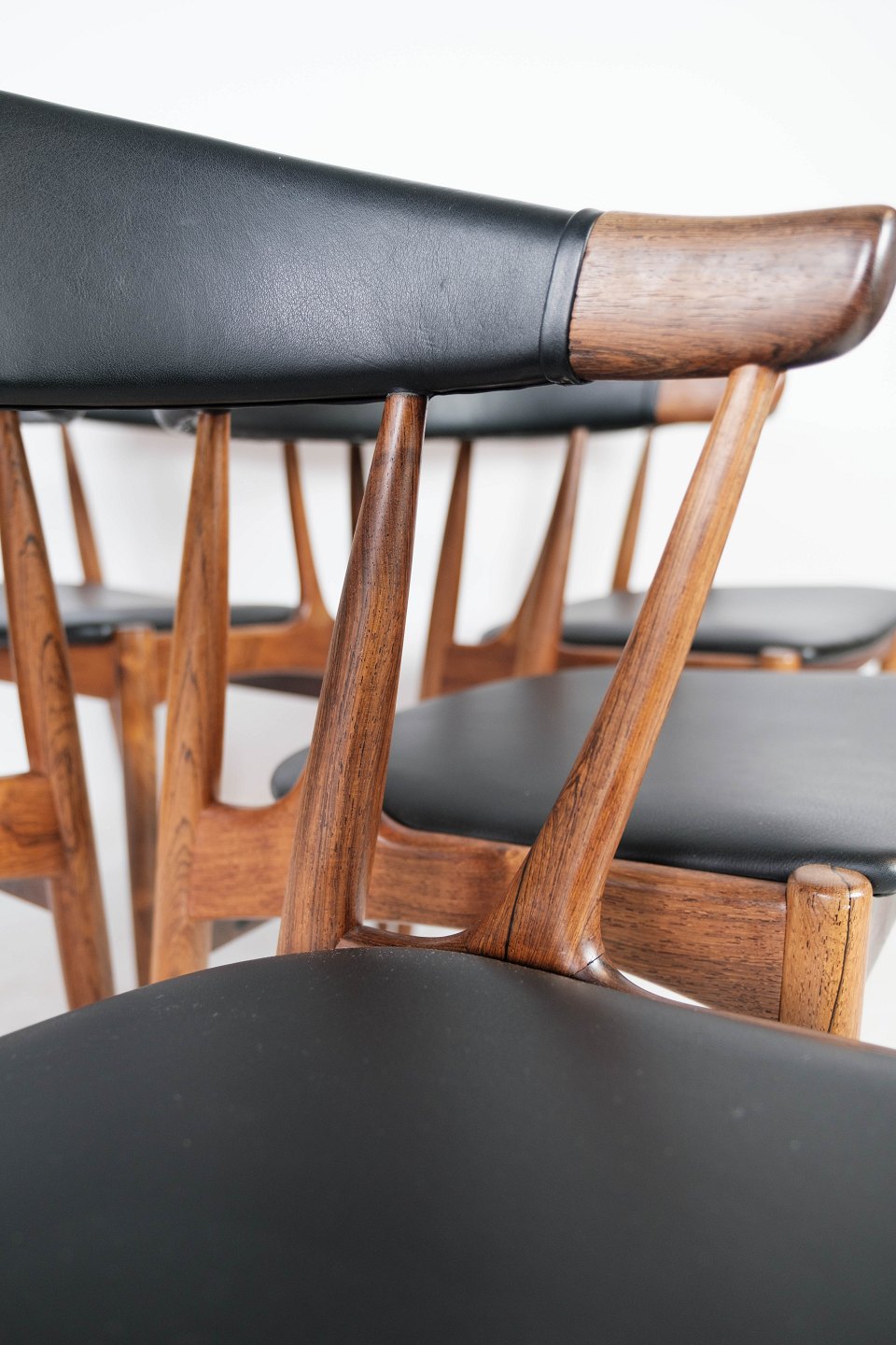 SoldSet of six dining room chairs in rosewood and newly upholstered with black elegance leather, designed by Johannes Andersen, model BA113, Manufactored by Brdr. Andersens møbelfabrik A/S. The chairs are in great vintage condition.