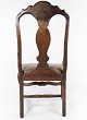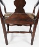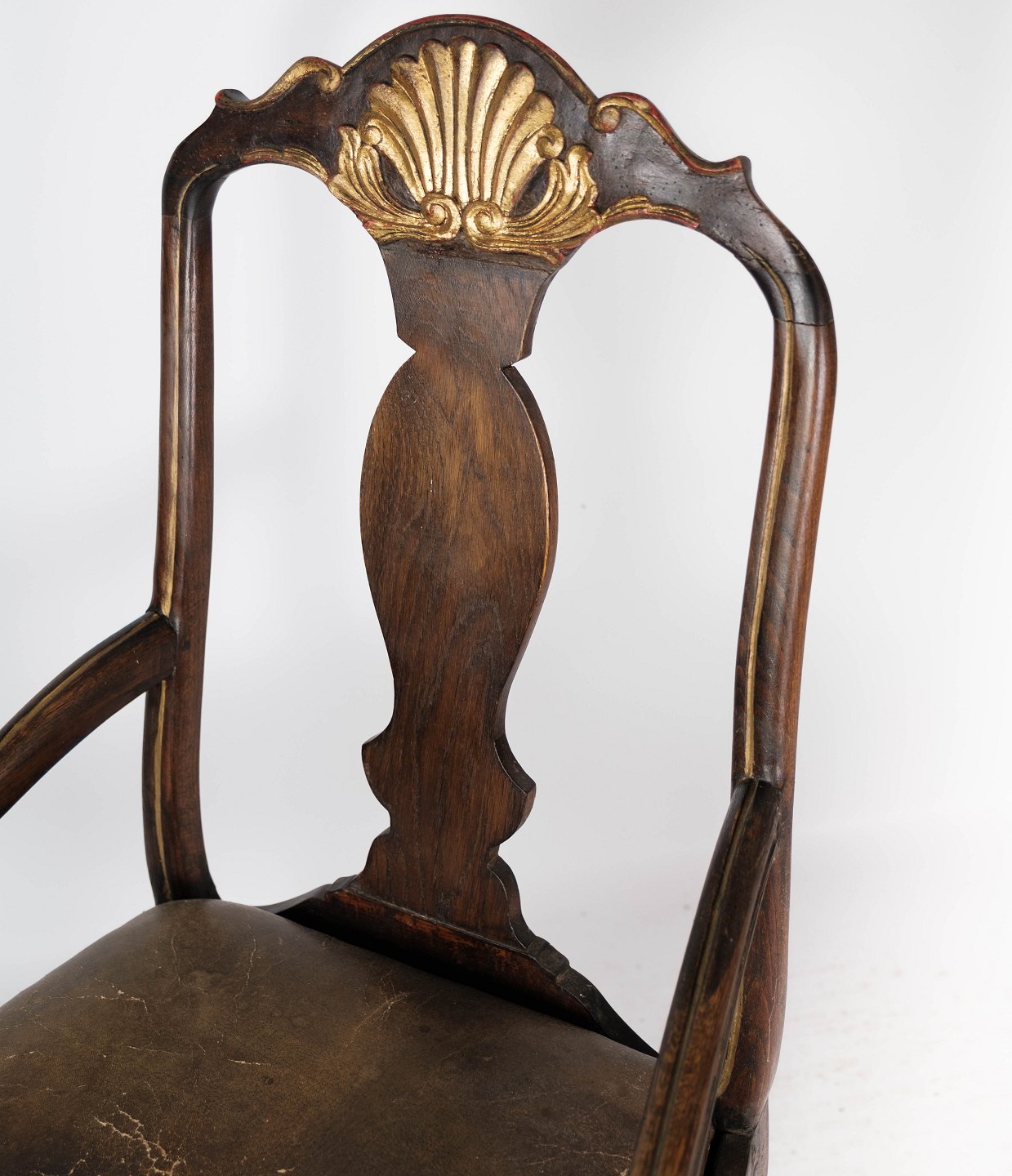 Baroque armchair of dark wood decorated with gold leaf and upholstered with dark leather from 1860. The chair is in great antique condition.