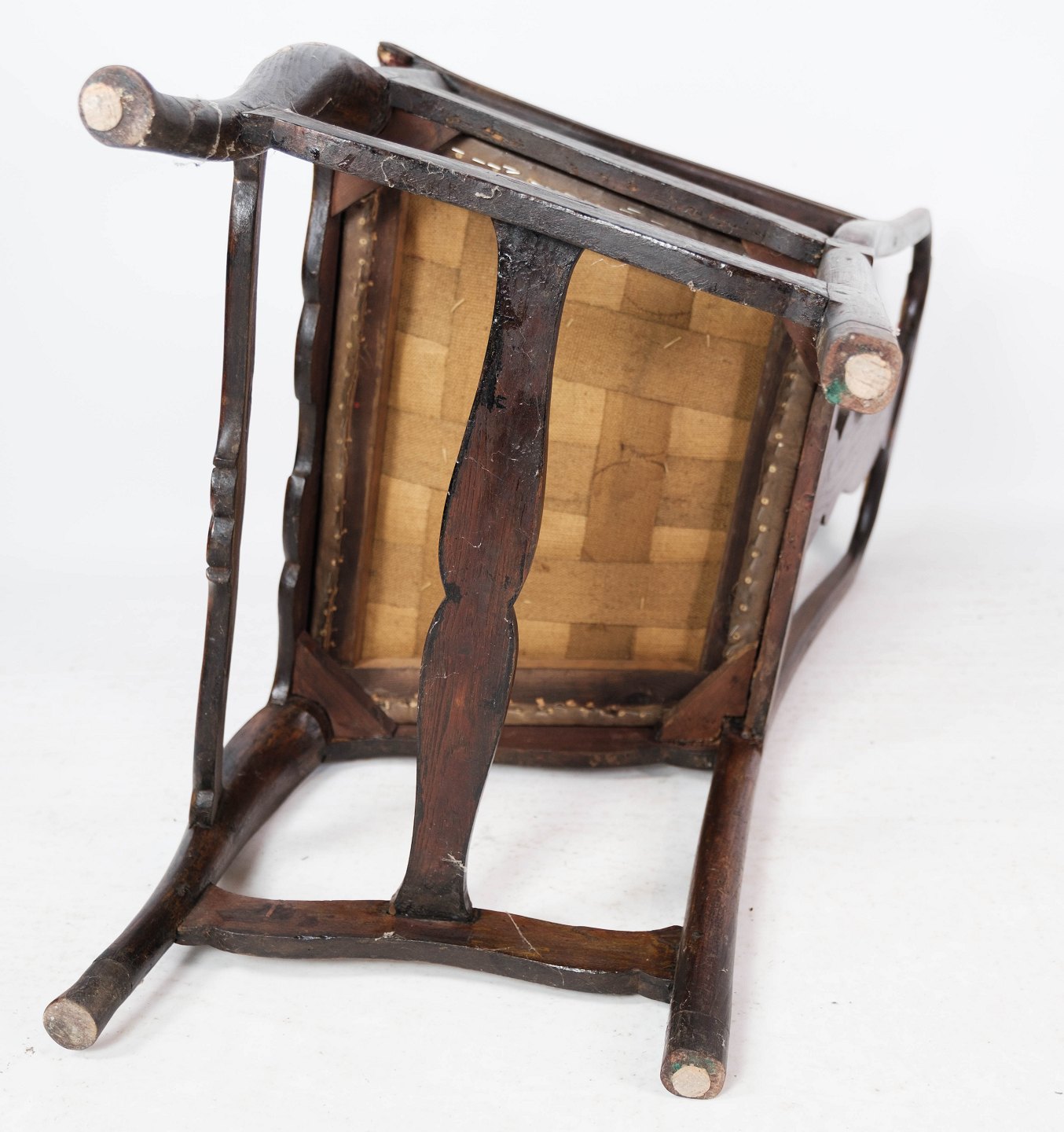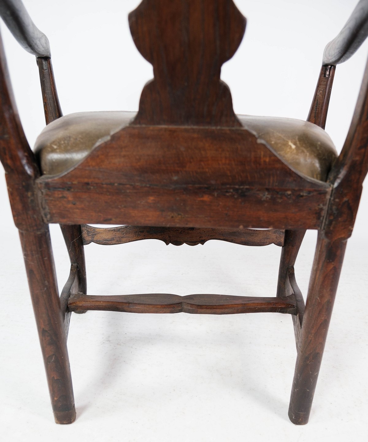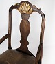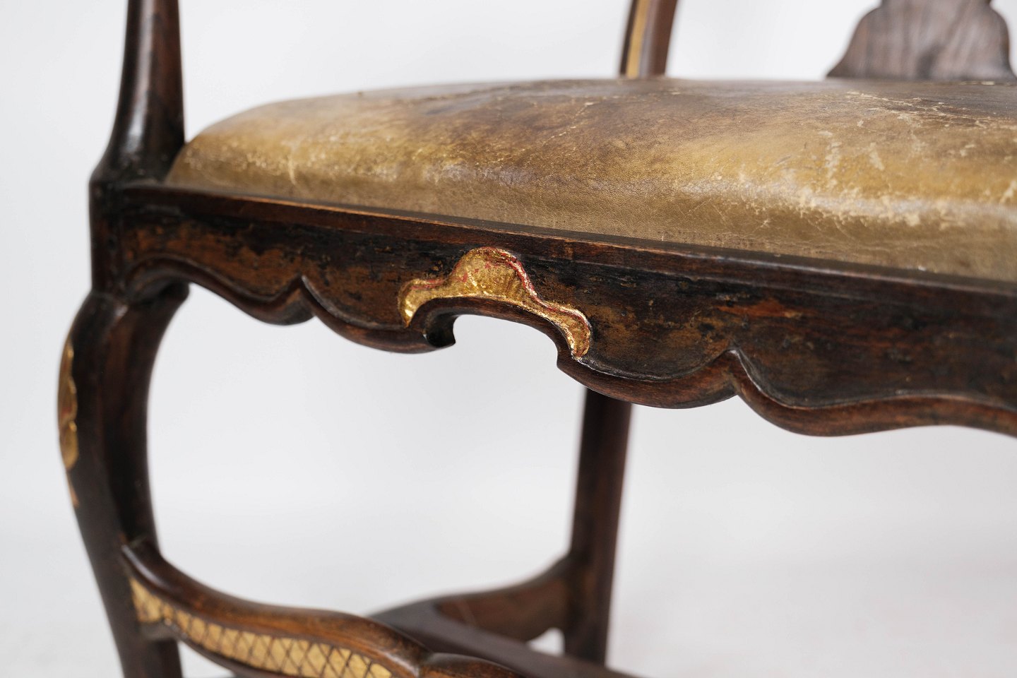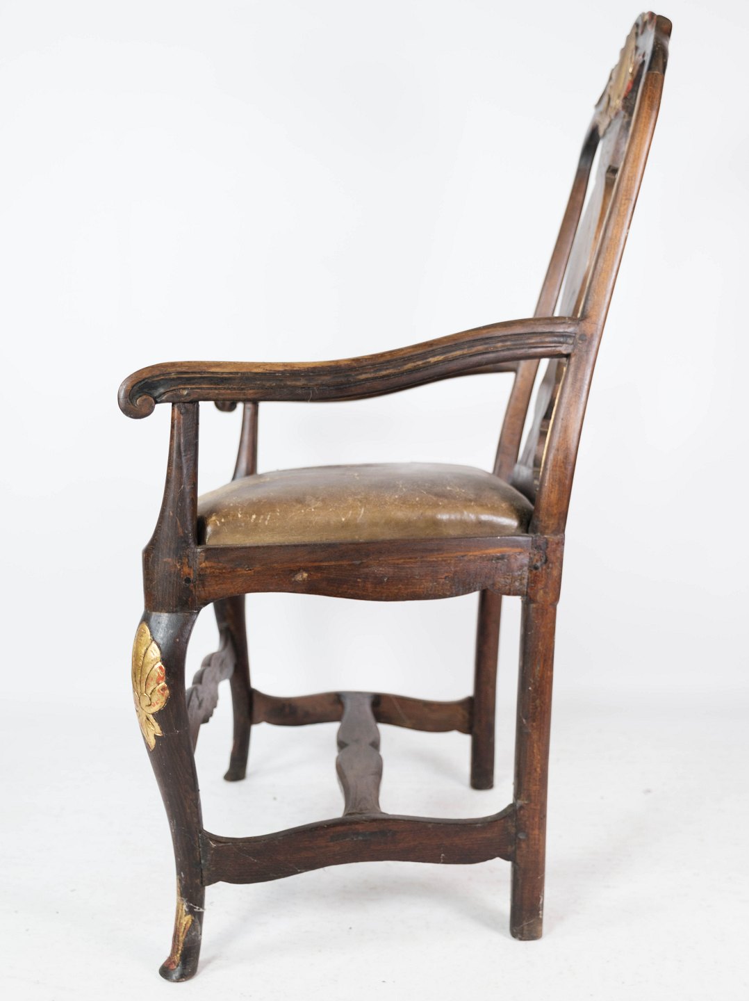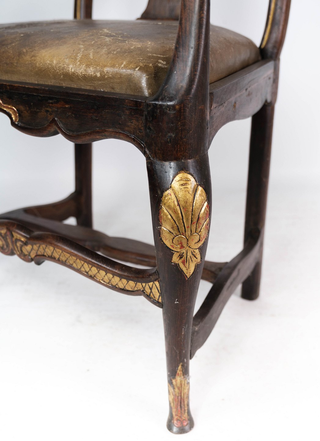 Baroque armchair of dark wood decorated with gold leaf and upholstered with dark leather from 1860.