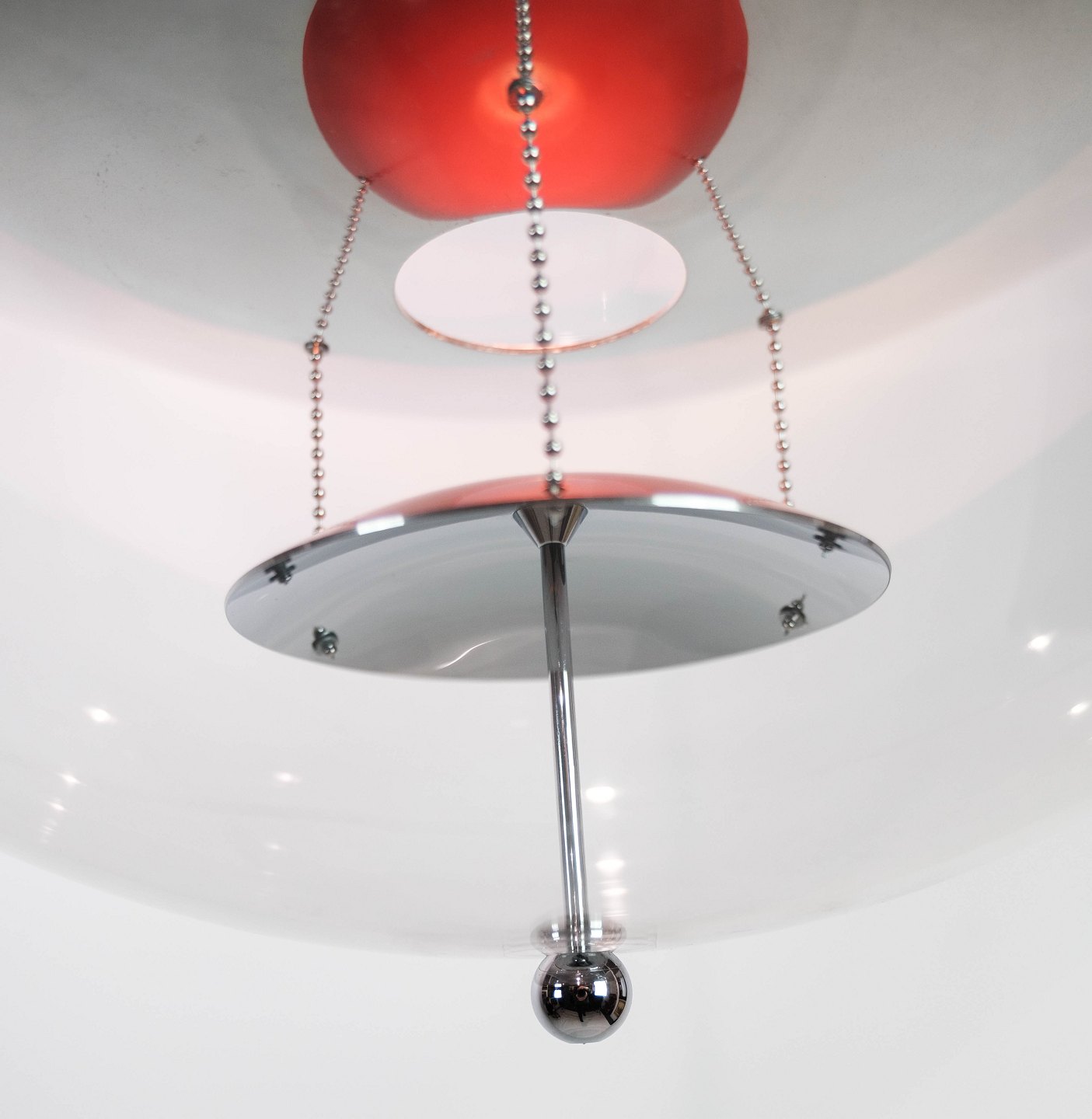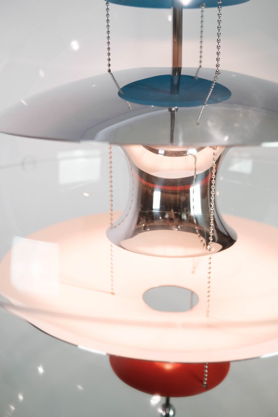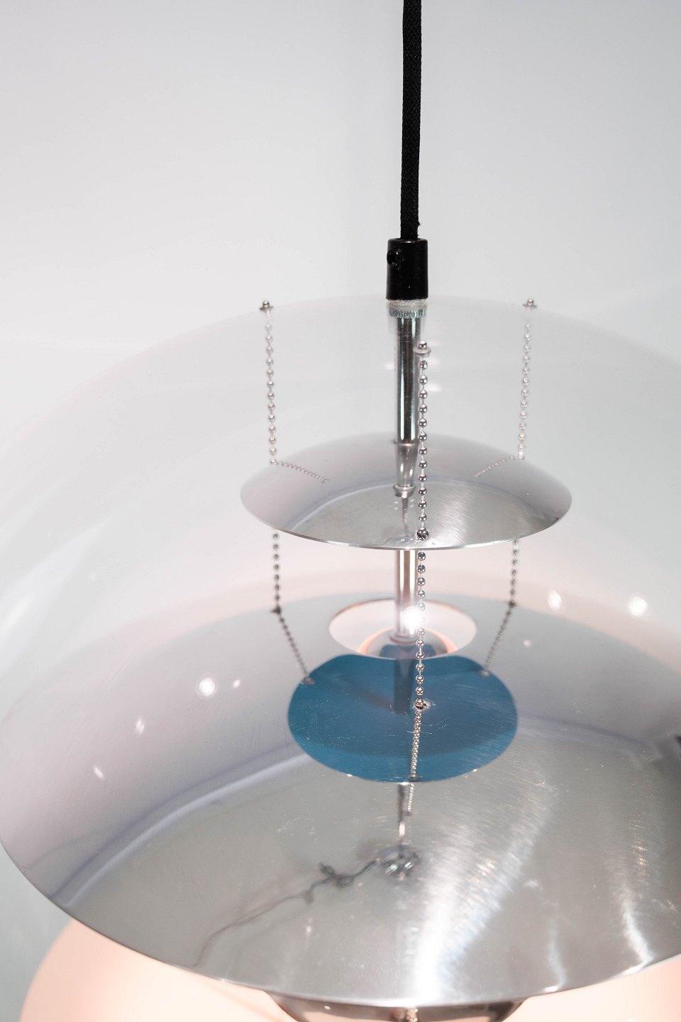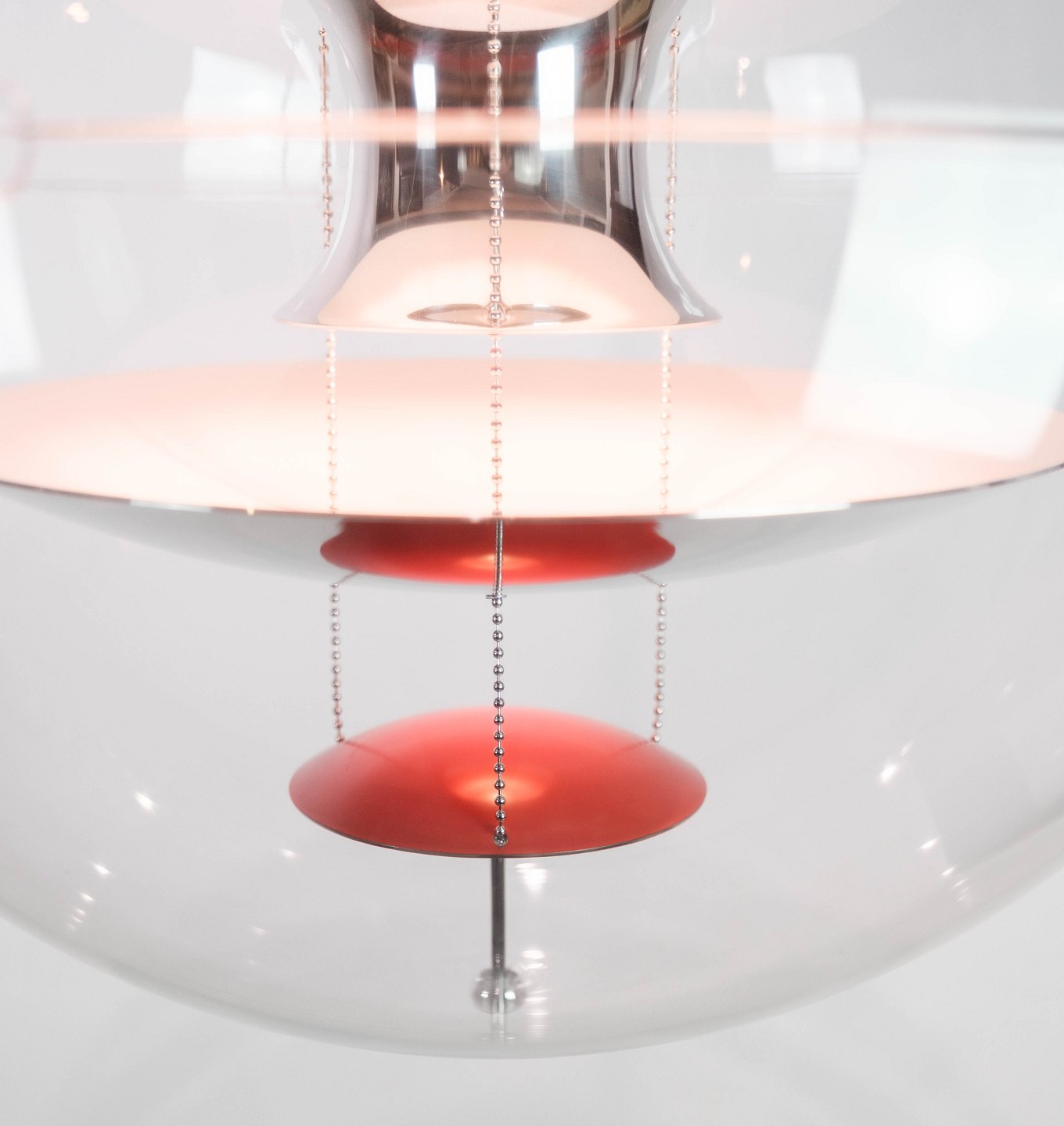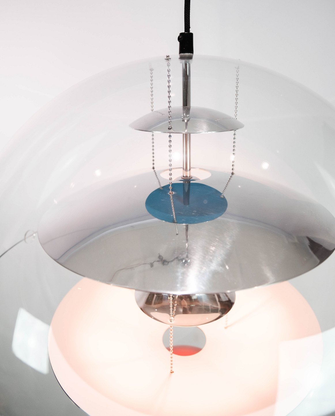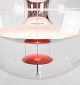 Globe, Ø50, designet af Verner Panton i 1969. Lampen er af transparent akryl med 5 ned hængte metal reflektorer, som er lakeret i hvid, rød og blå. Verner Panton Globe pendlen er super flot og tidløs. Den passer godt ind i mange af hjemmets run, og kan places for en hyggelig og stemningsfyldt belysning. Lyskilden er E14 MAX 60 Watt i Ø40 og lyskilden er E27 MAX 75 Watt i Ø50.