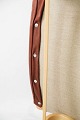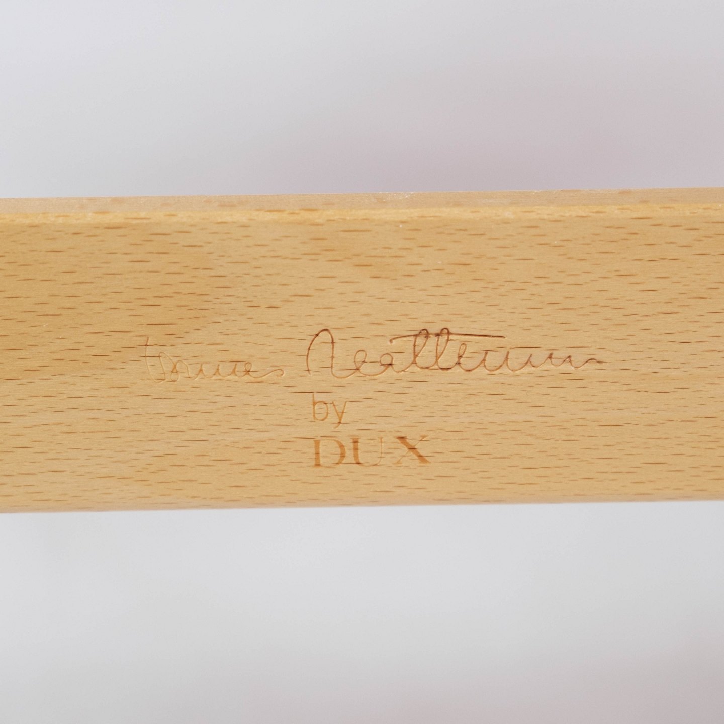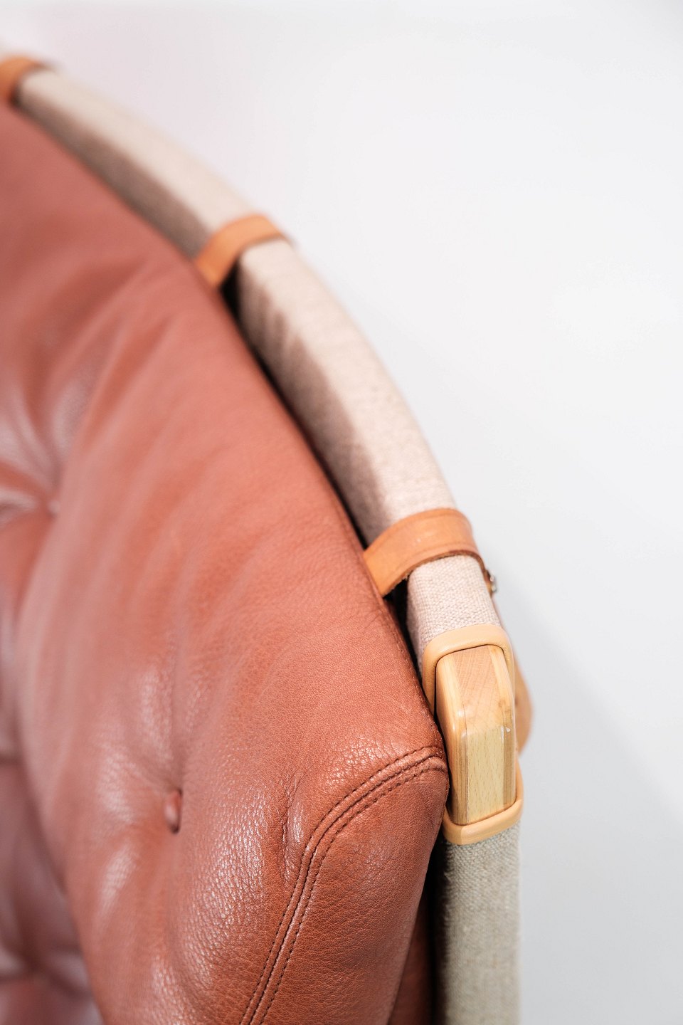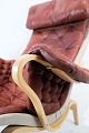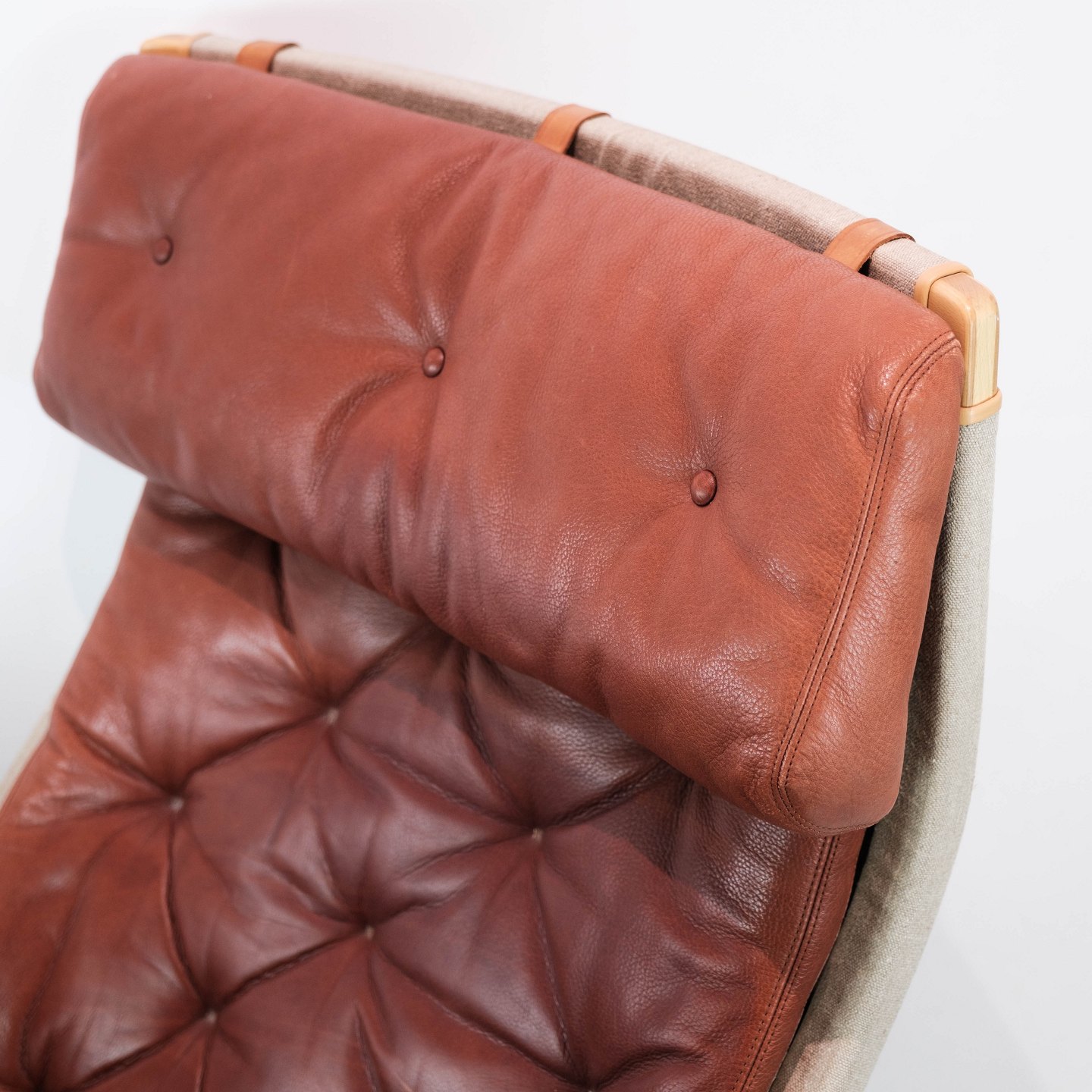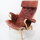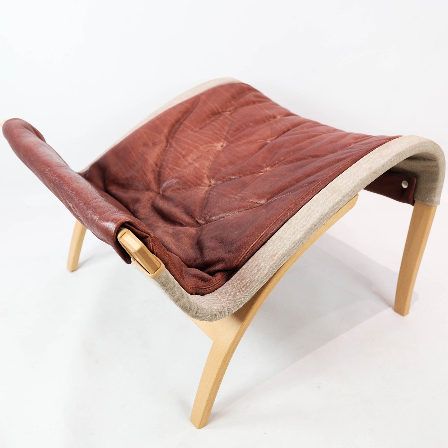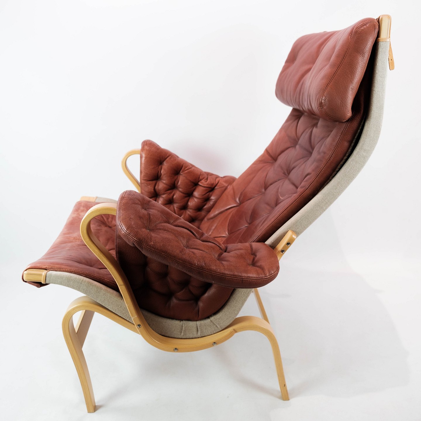 SoldPernilla easy chair with stool of beech and upholstered with red leather designed by Bruno Mathsson and manufactured by Dux in the 1970s. The chair is in great vintage condition.