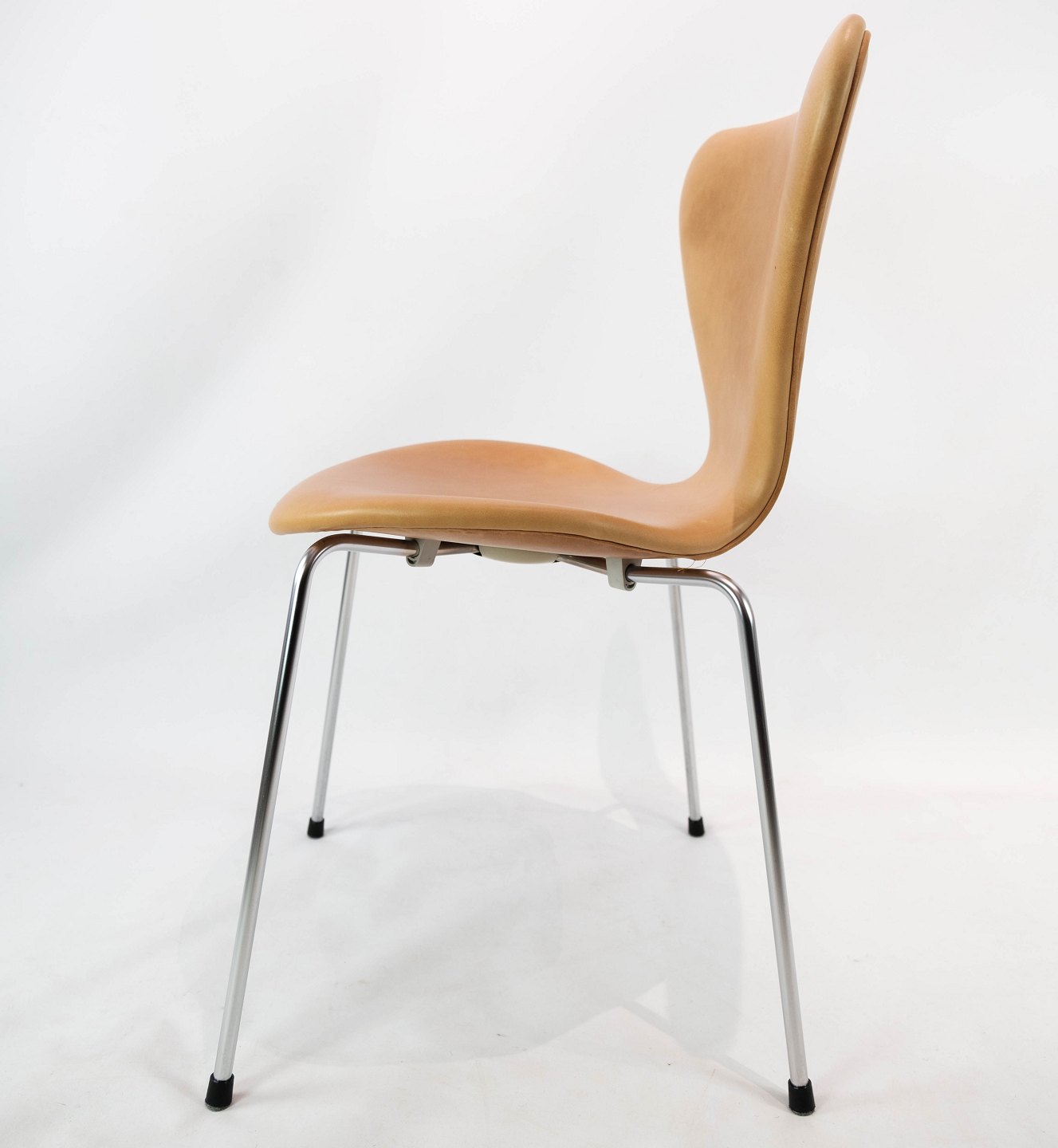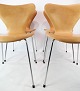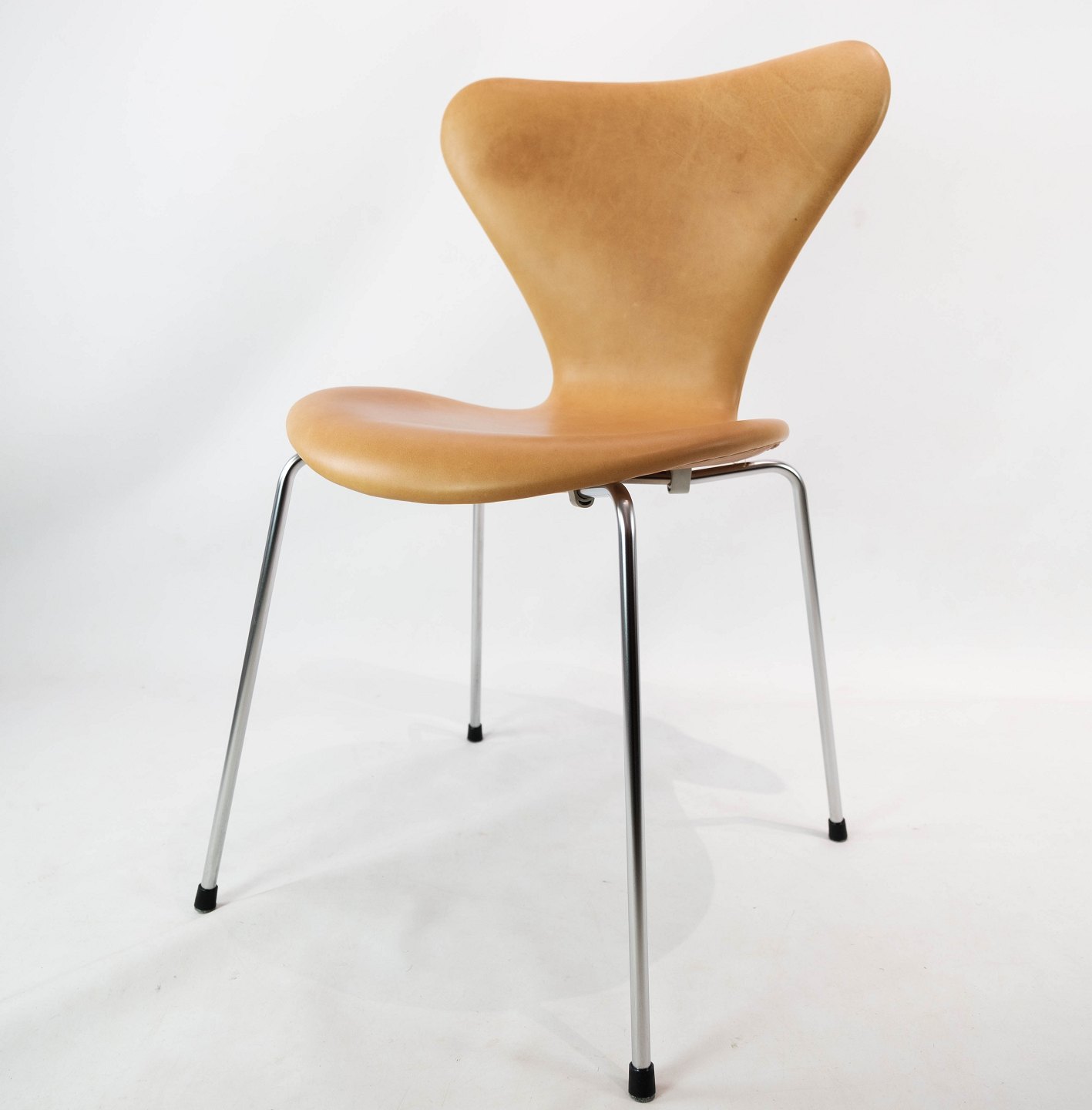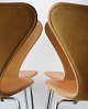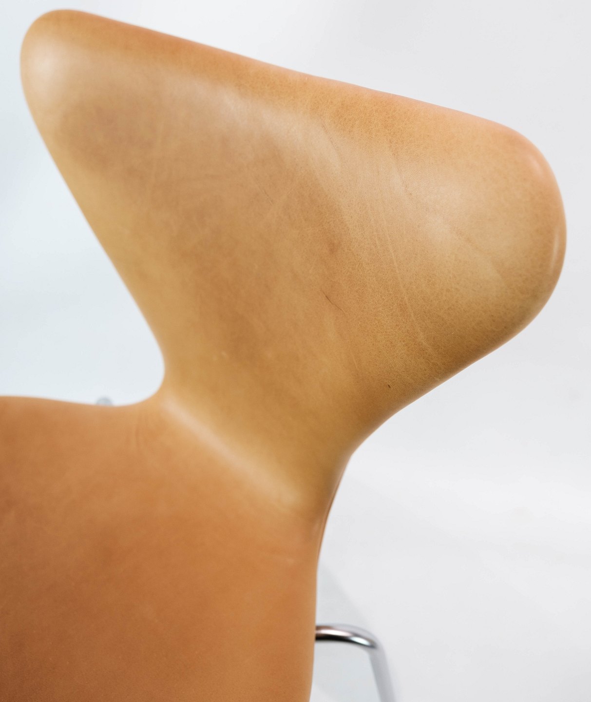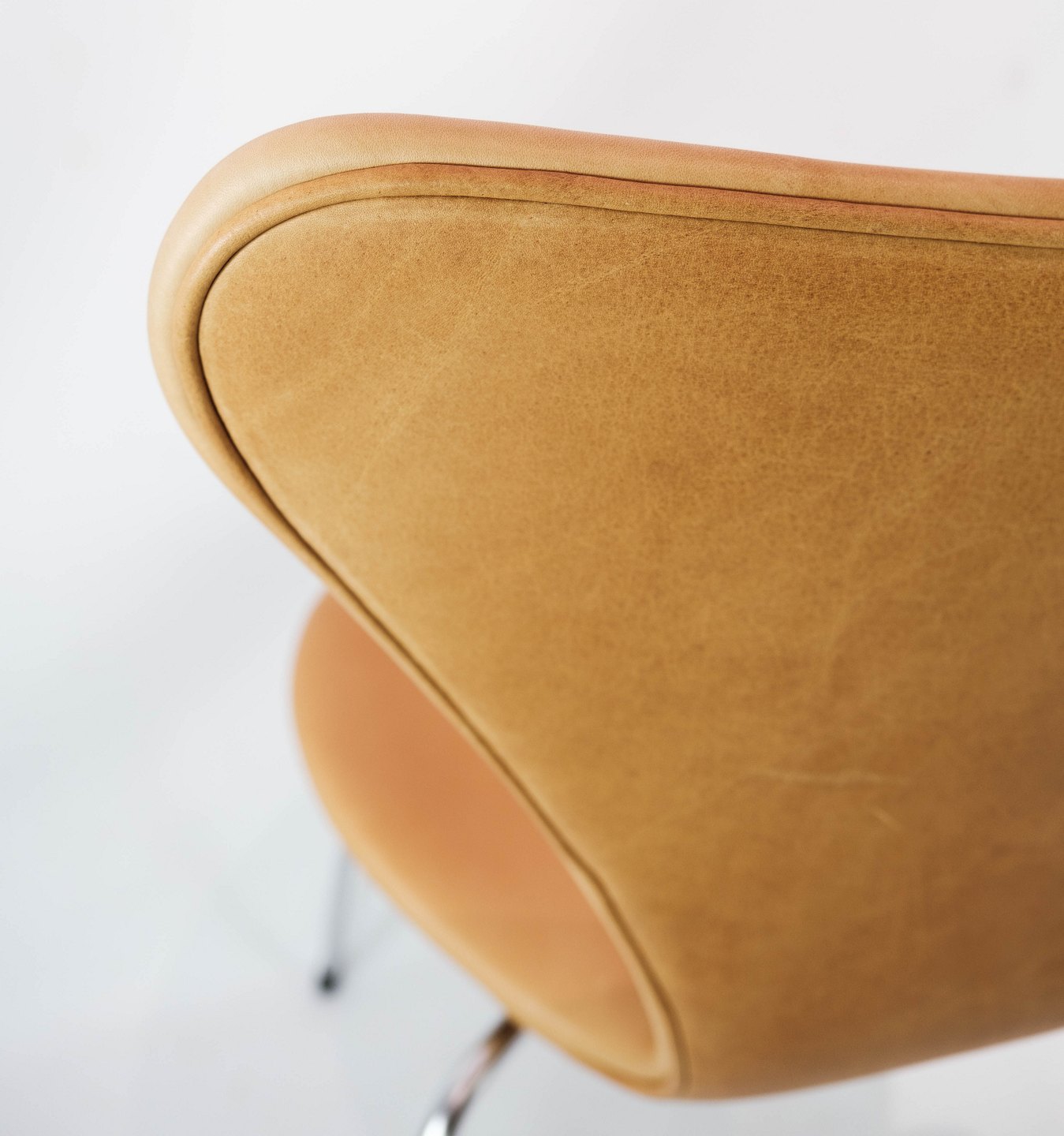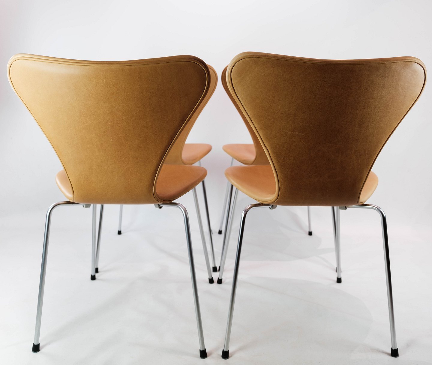 Dette sæt af fire Syver stole, også kendt som Model 3107, er et eksempel på dansk design af Arne Jacobsen og fremstillet hos Fritz Hansen. Stolene er polstret i patineret cognac læder, hvilket tilføjer en varm og indbydende atmosfære til ethvert rum.