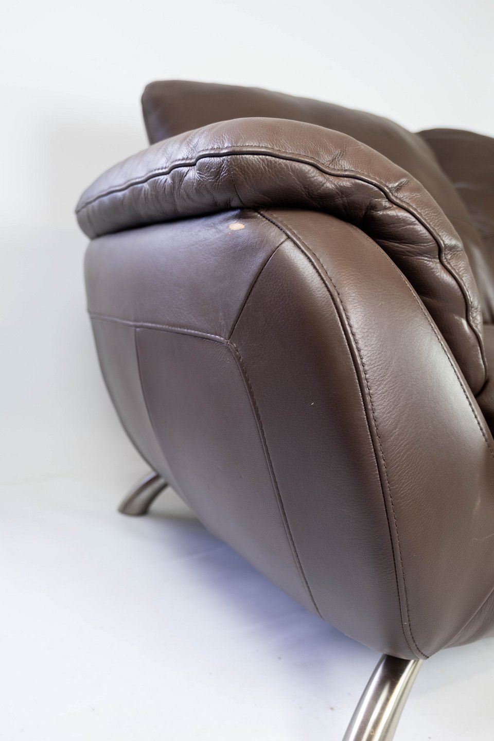 The brown leather gives the sofa a warm and inviting appearance, while being durable and easy to maintain. The metal frame adds a modern and industrial-inspired touch that gives the sofa a sophisticated look.