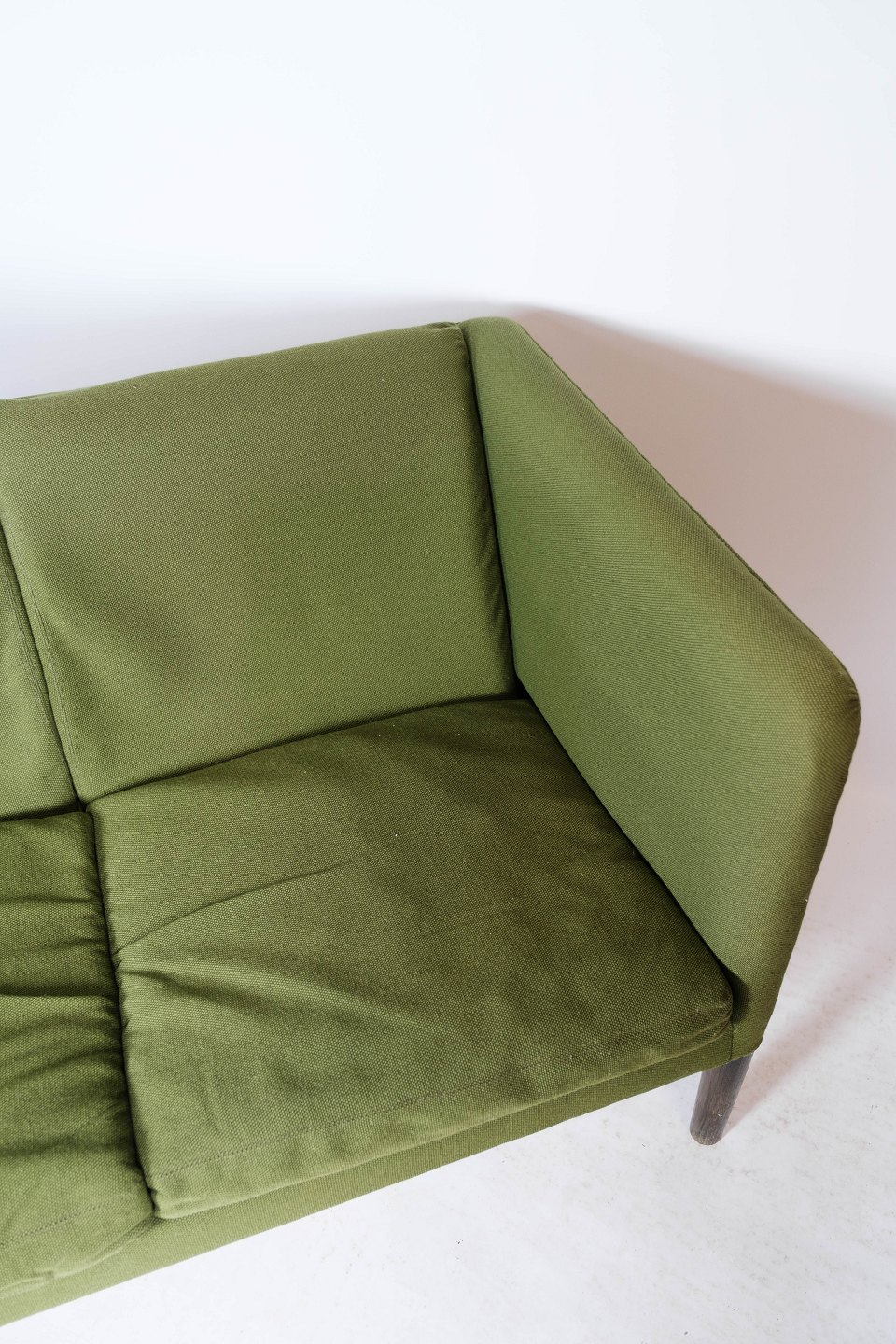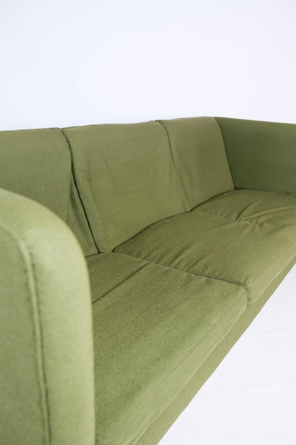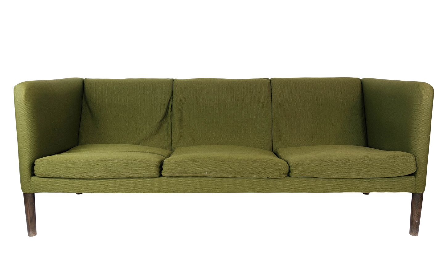 SoldThree seater sofa, Model AP 18S, upholstered with green wool fabric and legs of dark wood, designed by Hans J. Wegner from the 1960s.