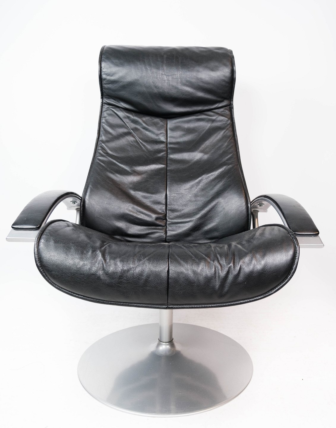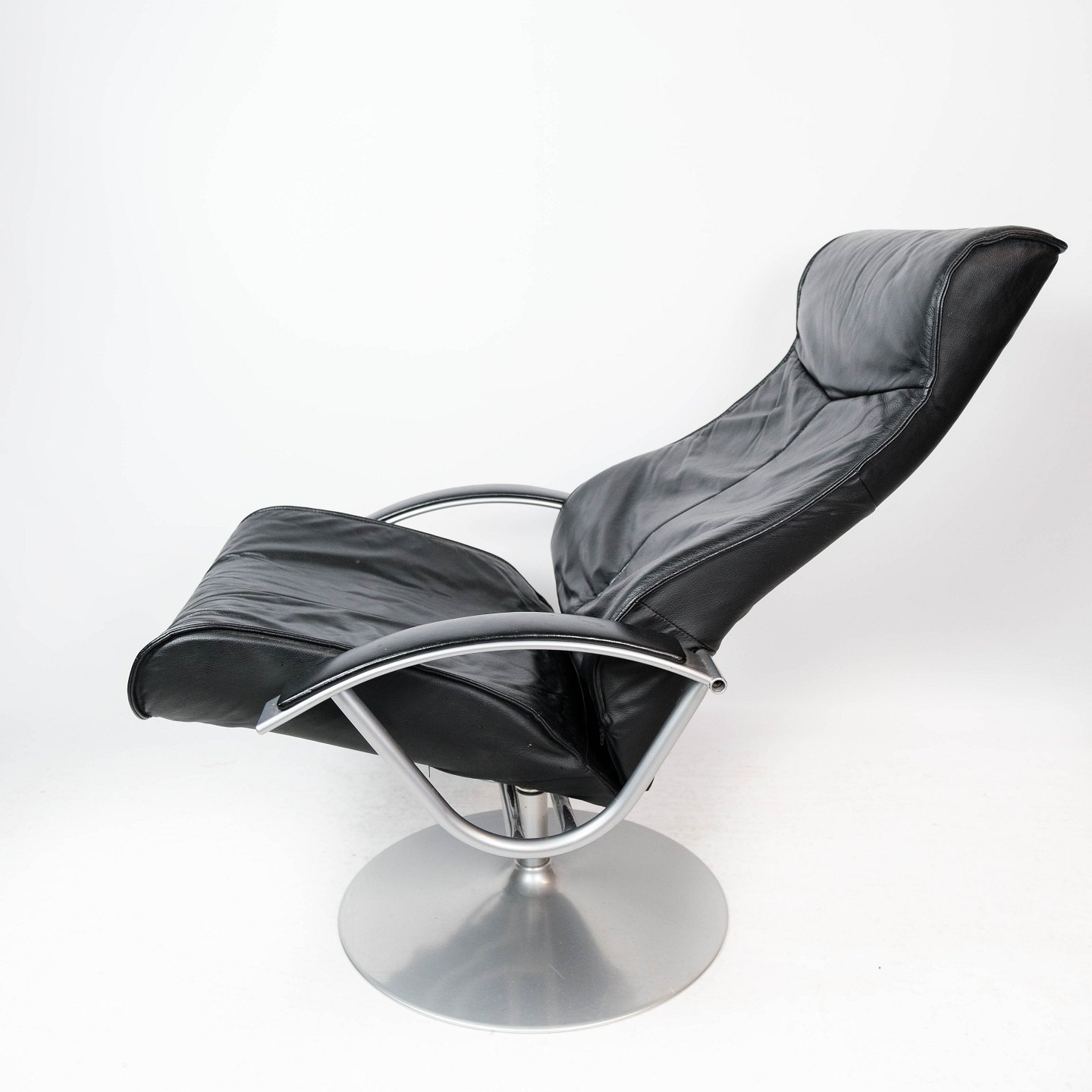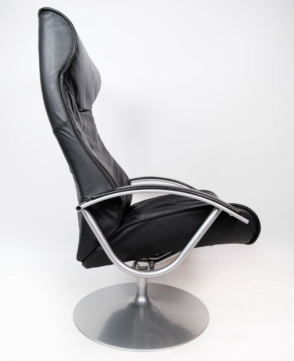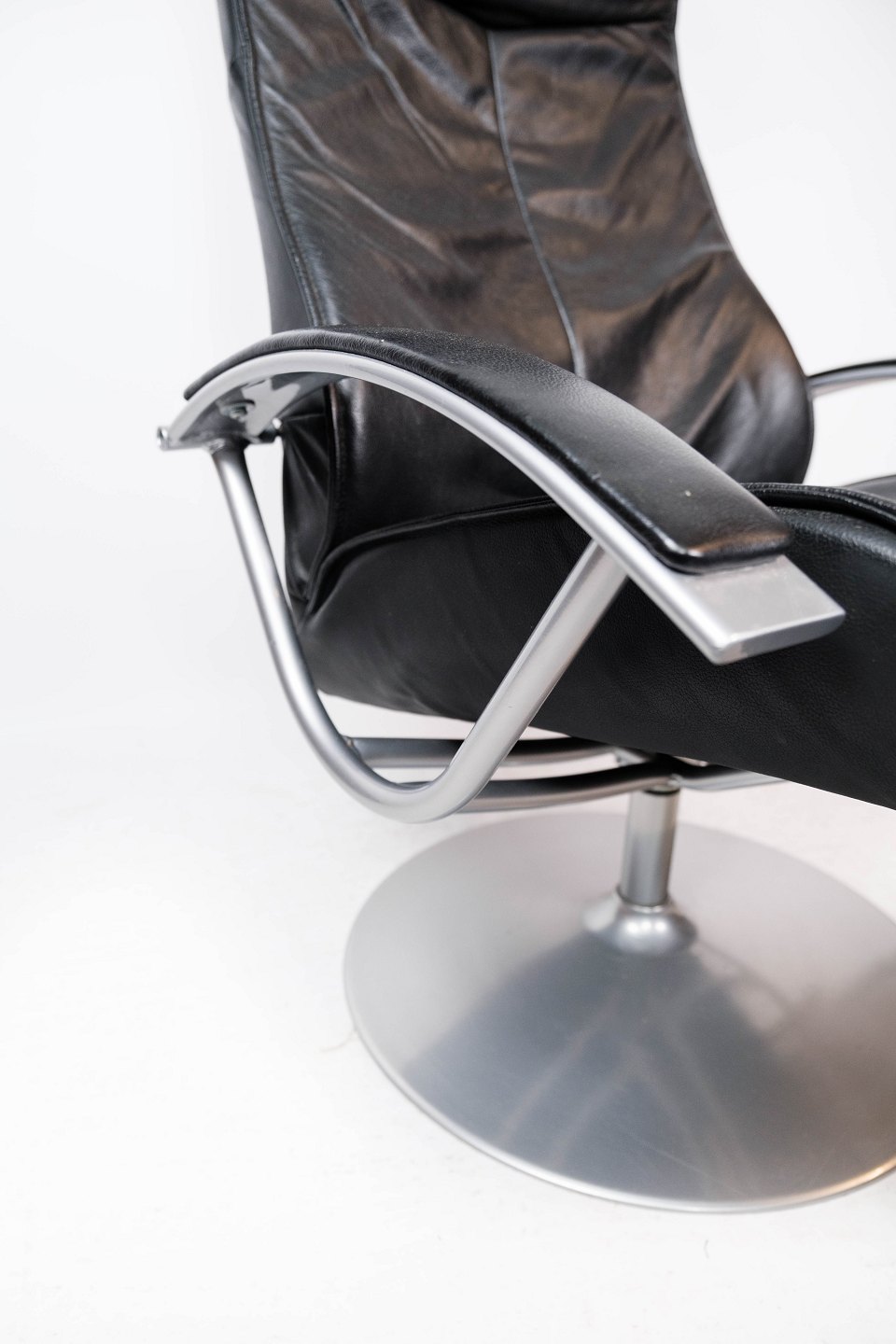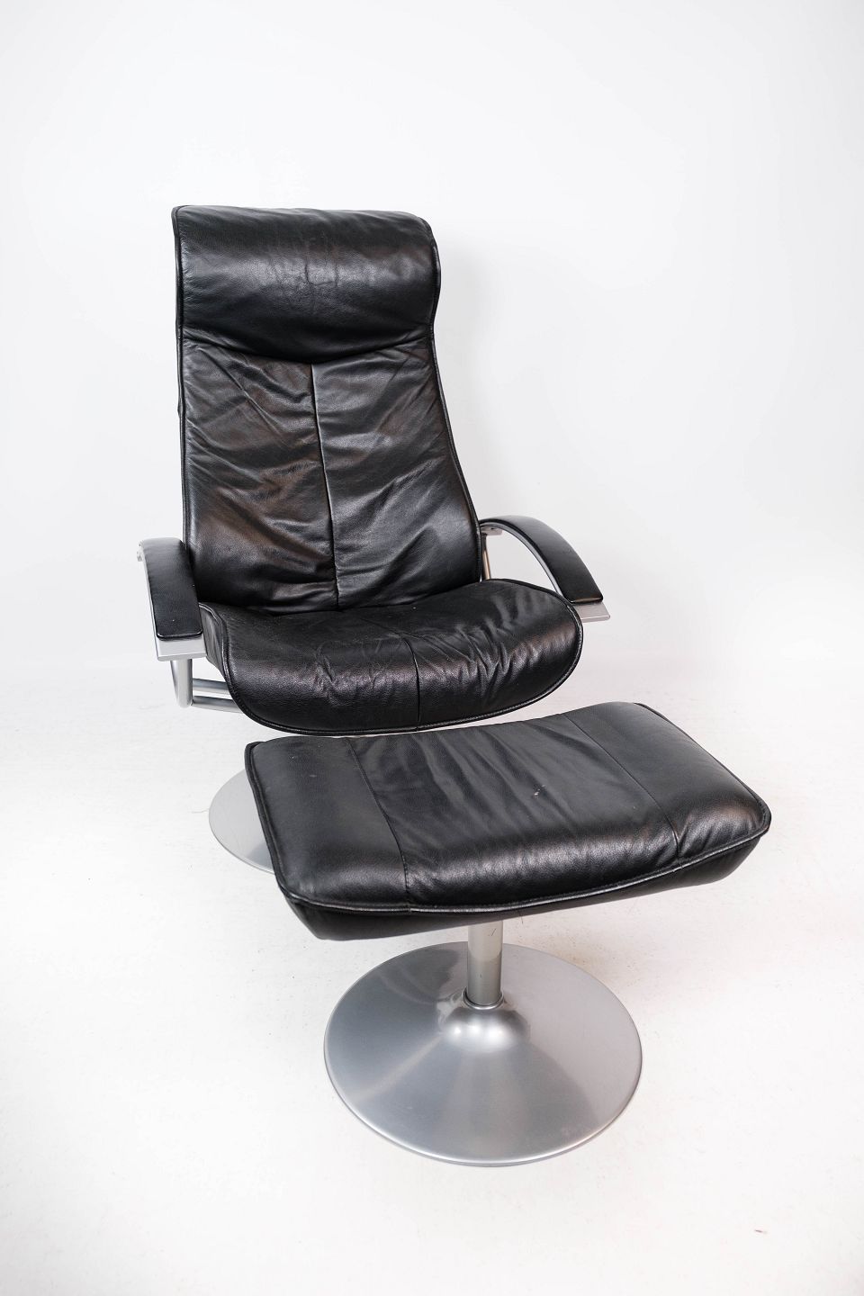 Easy chair with stool upholstered with black leather and frame of metal, of Danish design from the 1970s.